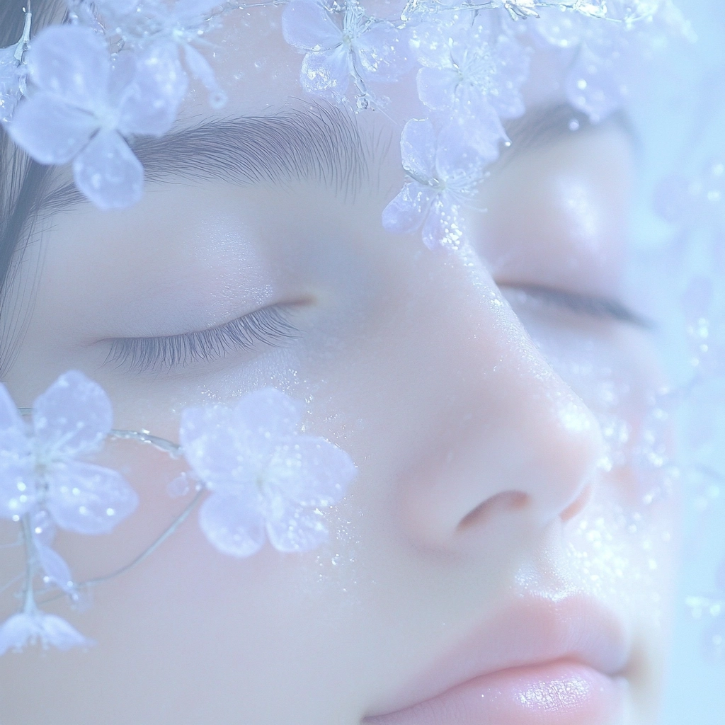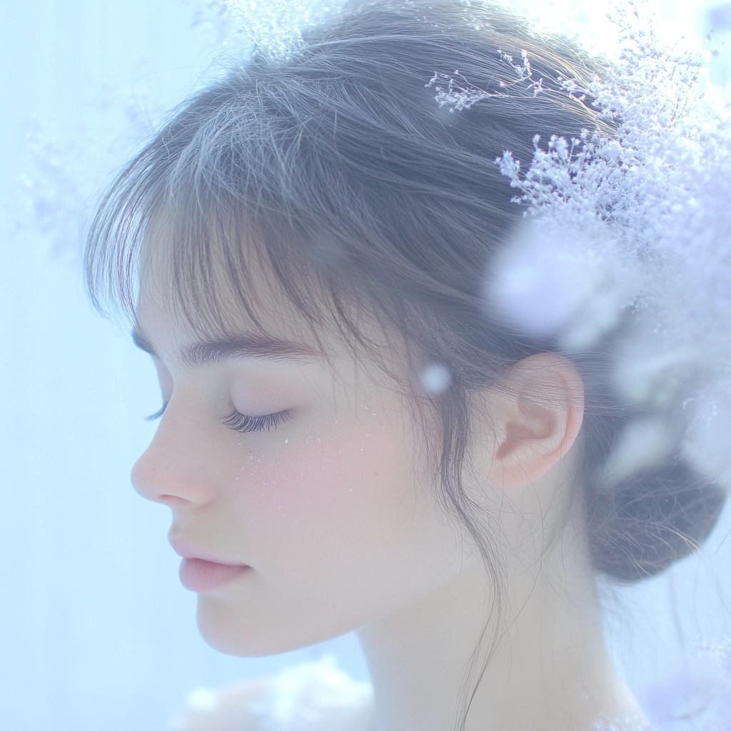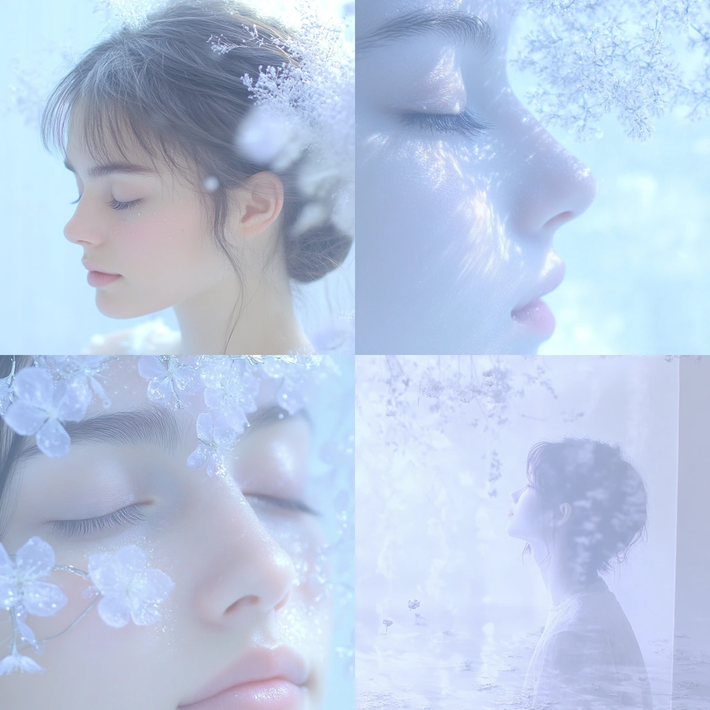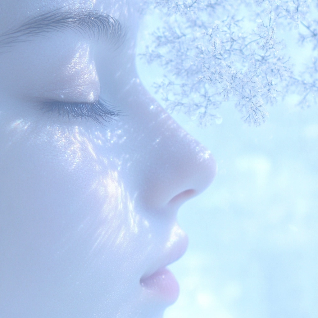 Use of soft illumination and light blue dominates the composition, providing a sense of depth and delicate texture. The spatial arrangement contributes to the ethereal quality with subtle shadows.