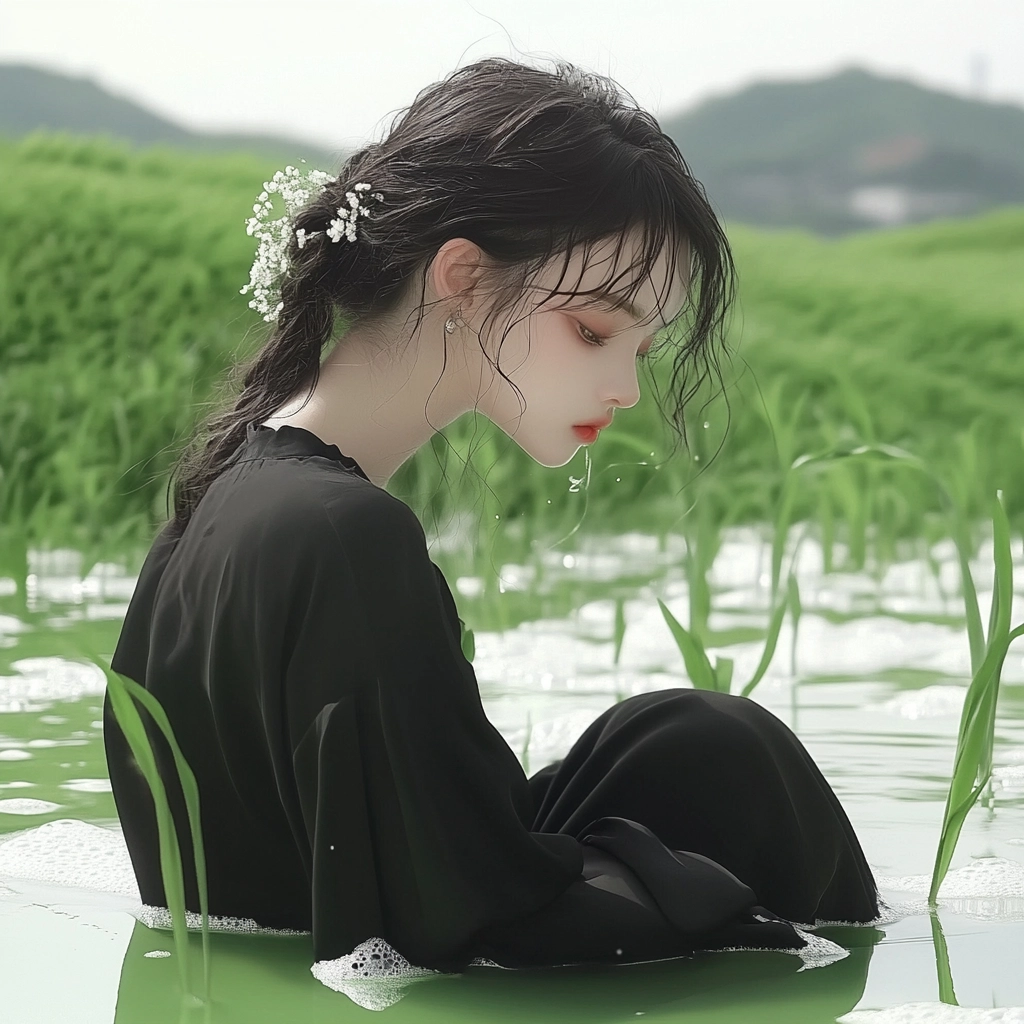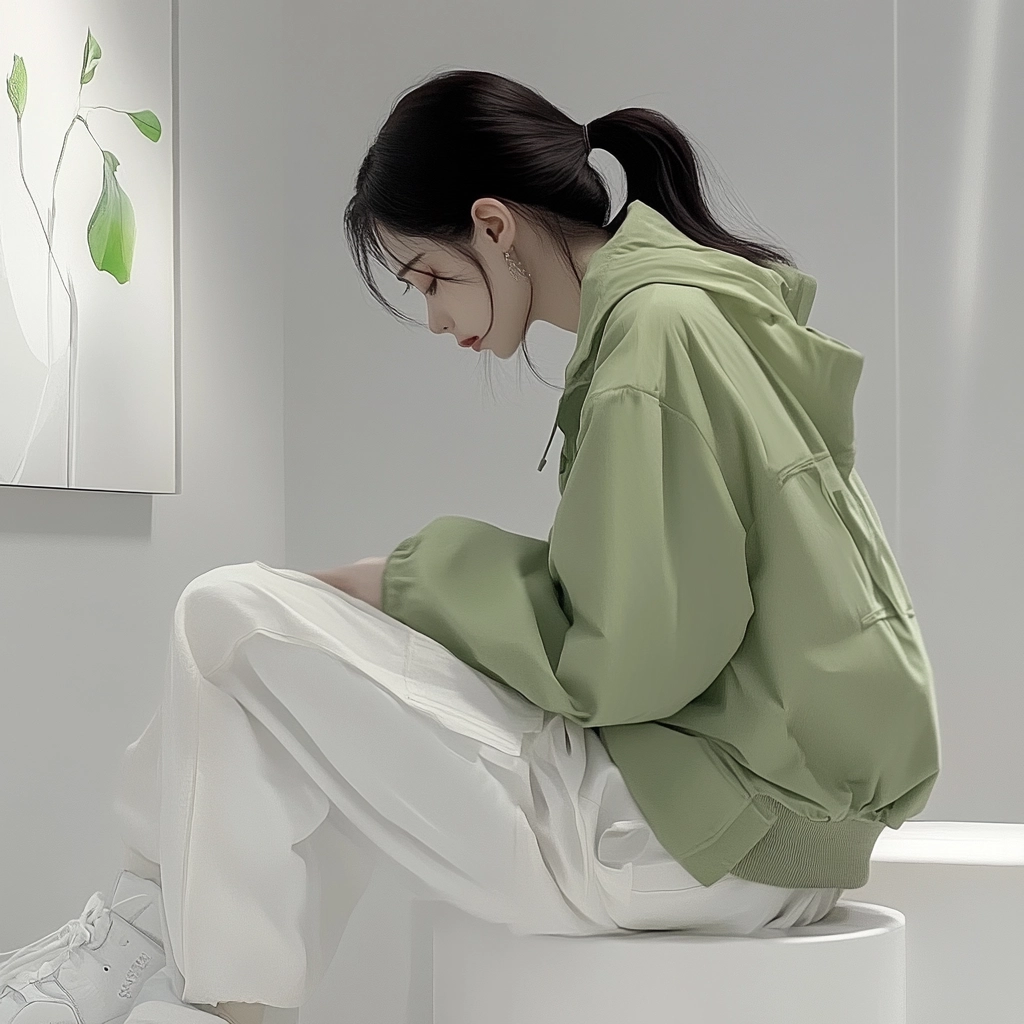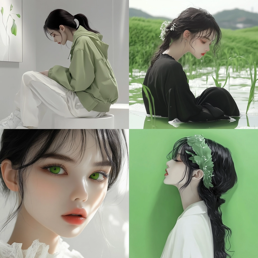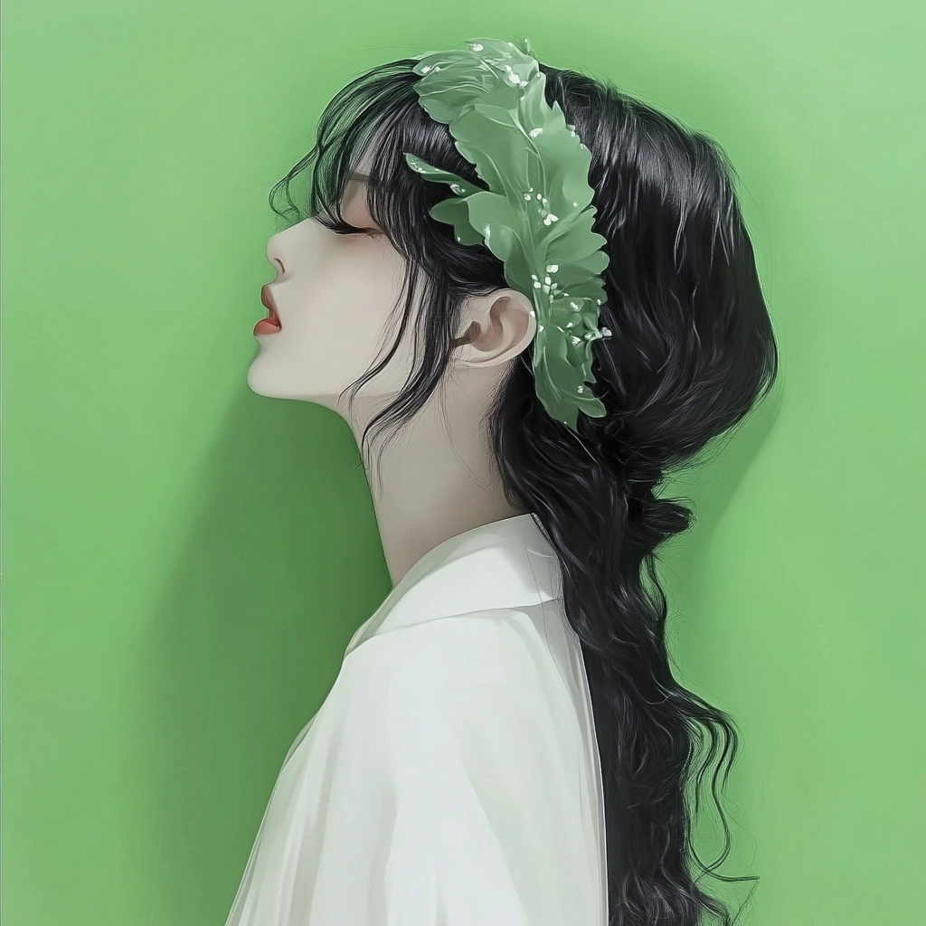 The lighting is evenly distributed, generating a consistent, soft illumination across elements. Colors are primarily soft greens and whites, which blend smoothly with minimal contrast. Spatially, the elements are arranged thoughtfully, providing a serene yet structured feel. Textures are subtle, with a focus on smoothness and delicacy.