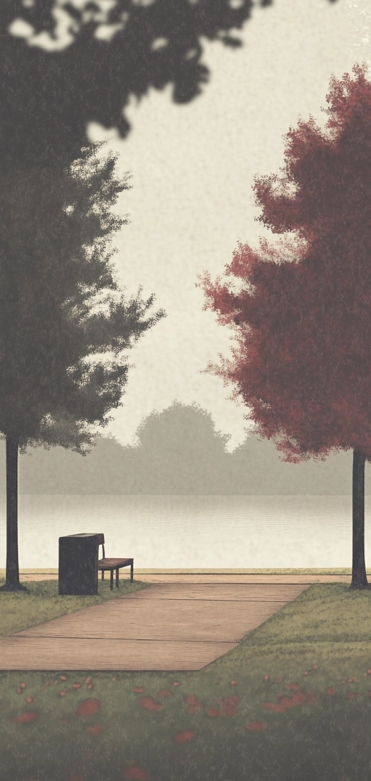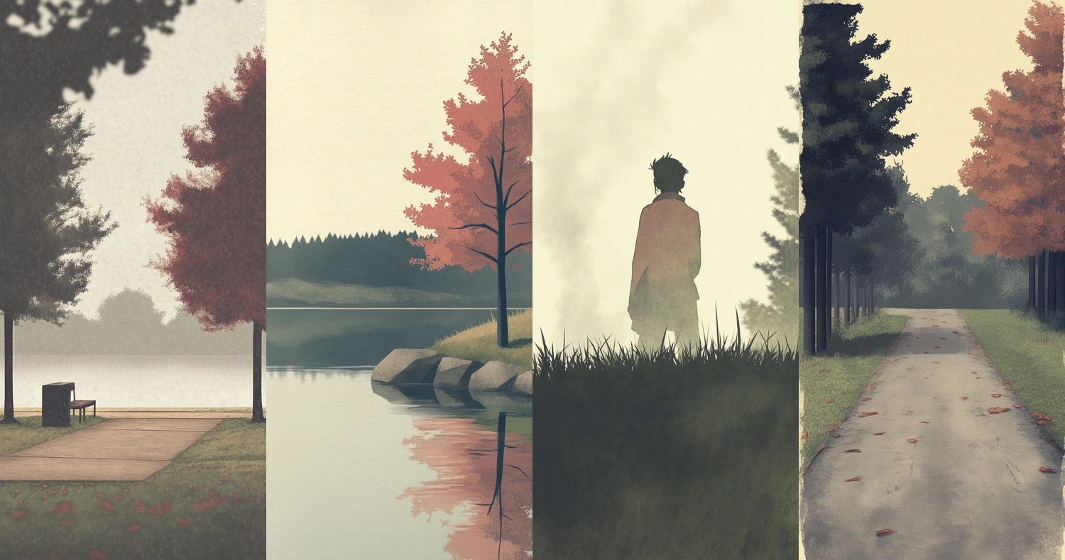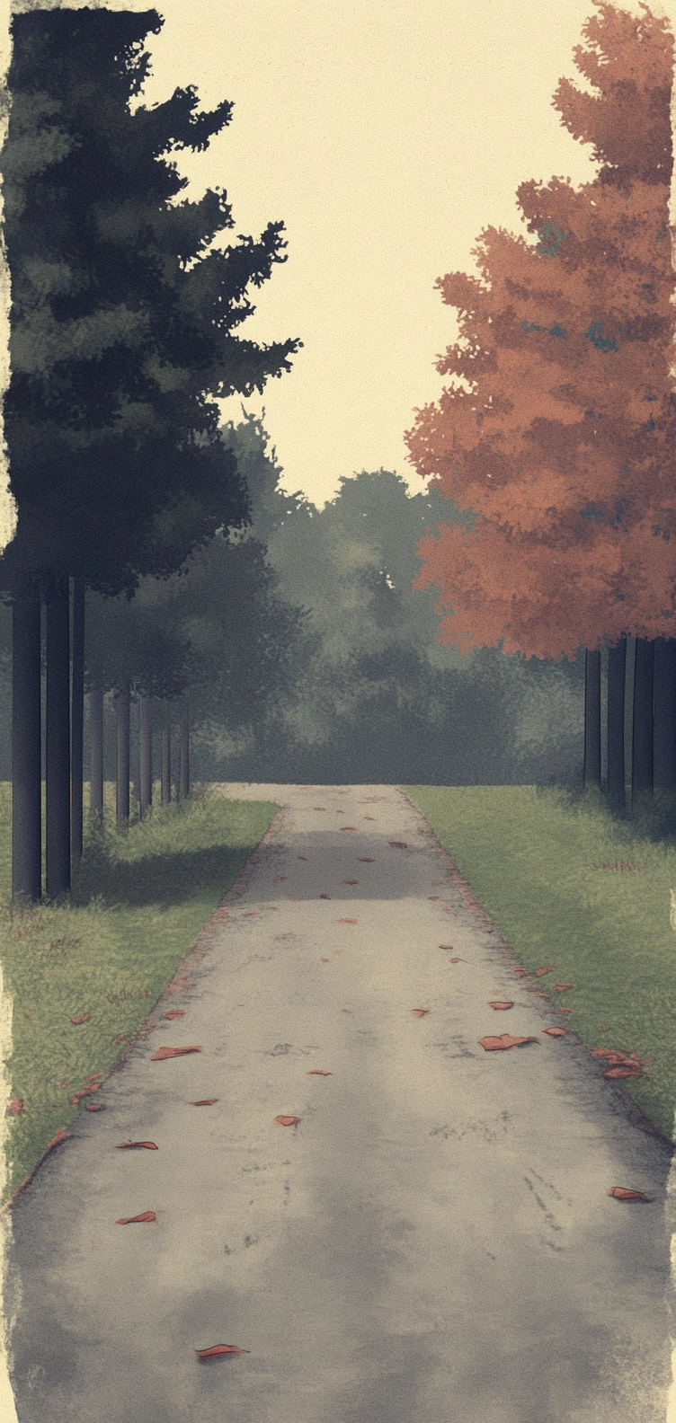 The composition balances warm and cool colors with soft lighting, creating a smooth gradient effect. The texture offers a matte finish, while spatial depth is achieved through layered foliage and pathways.