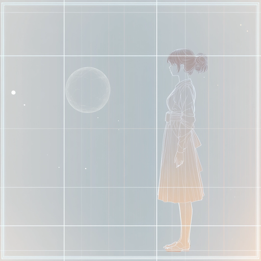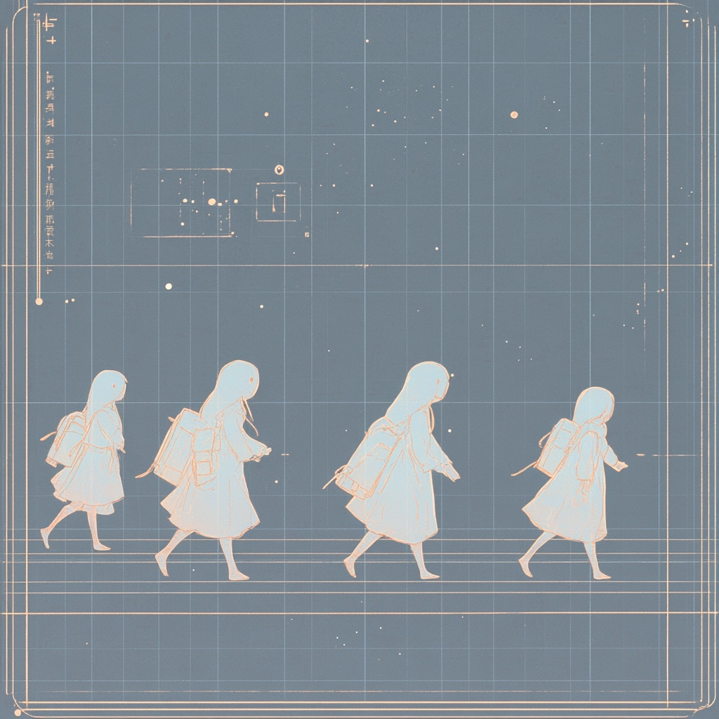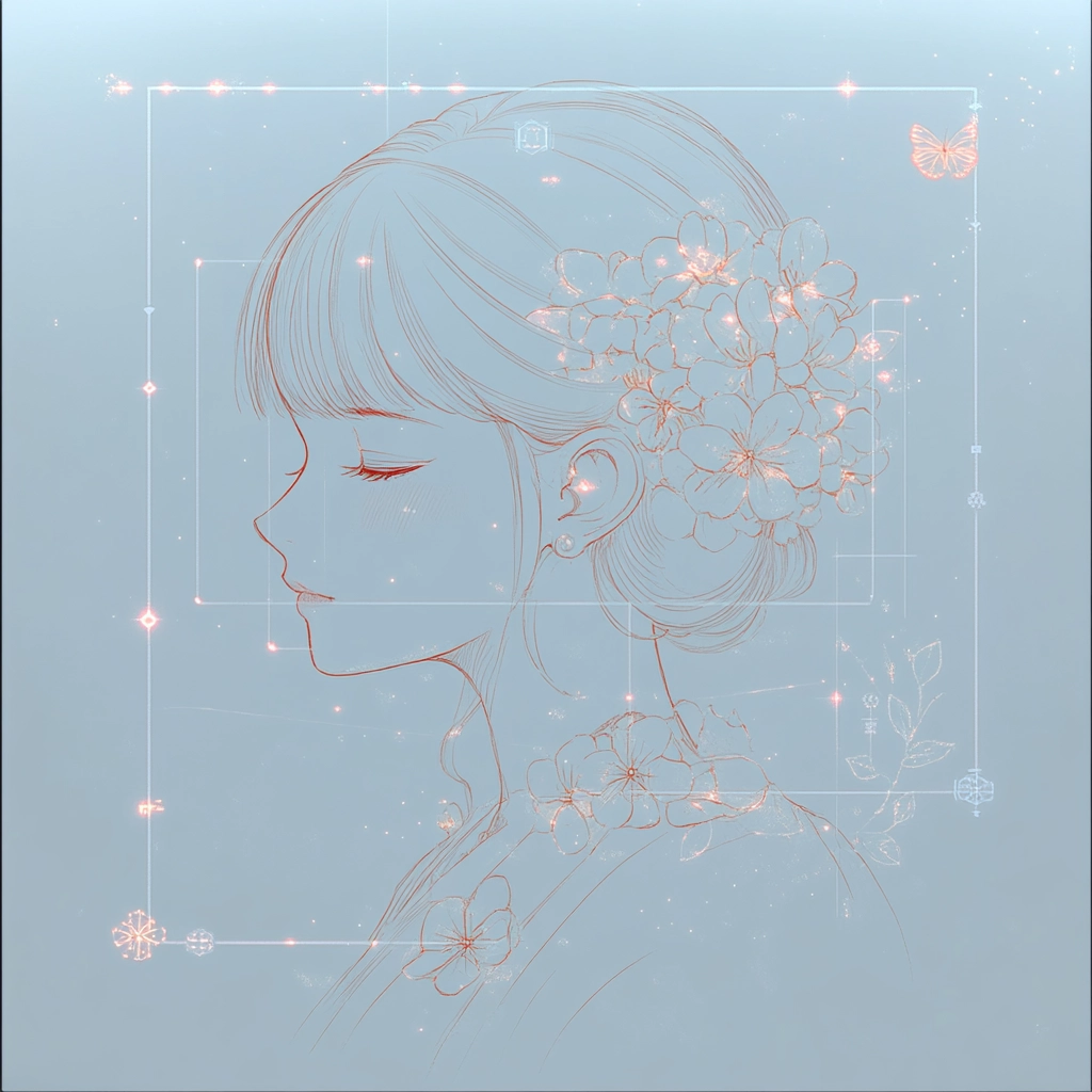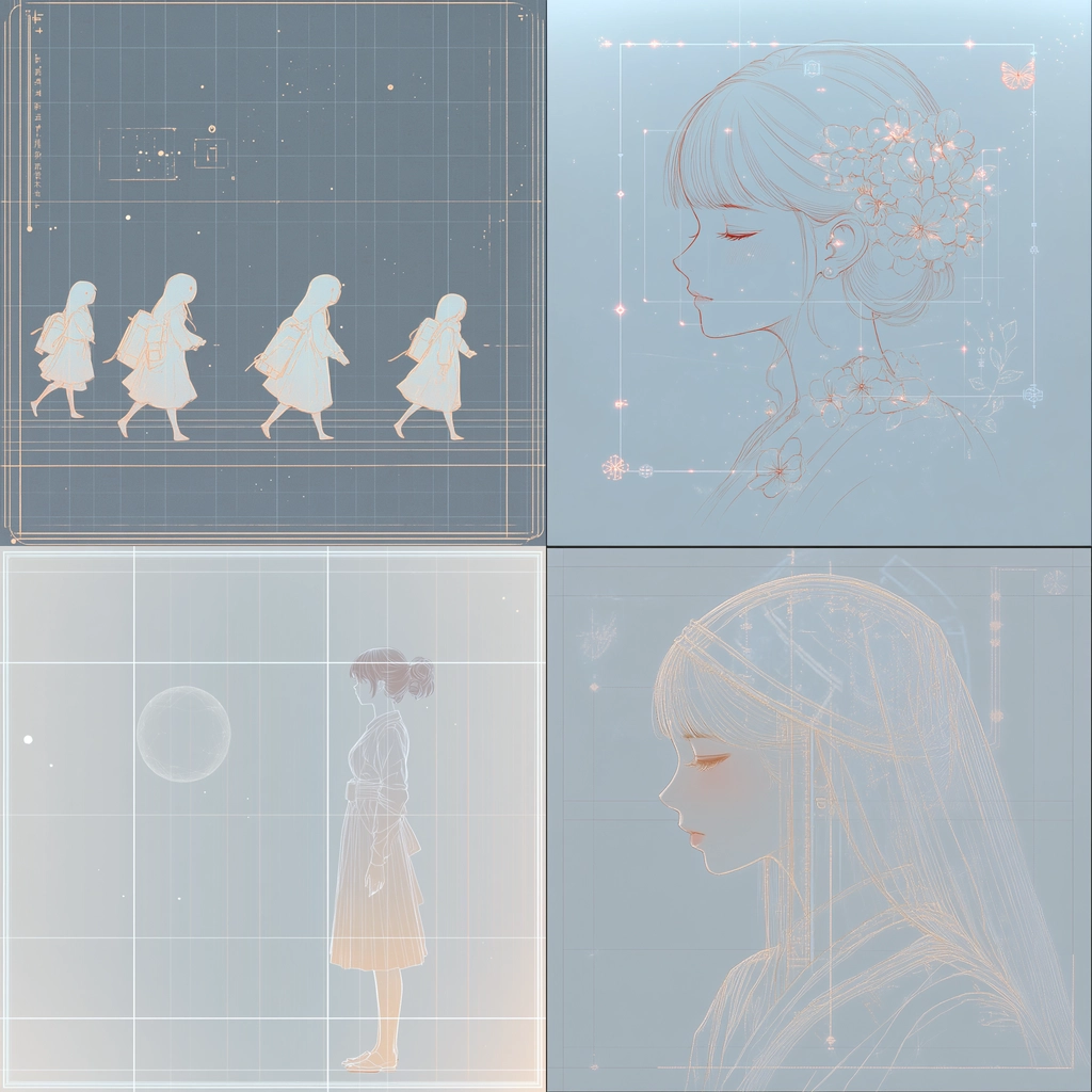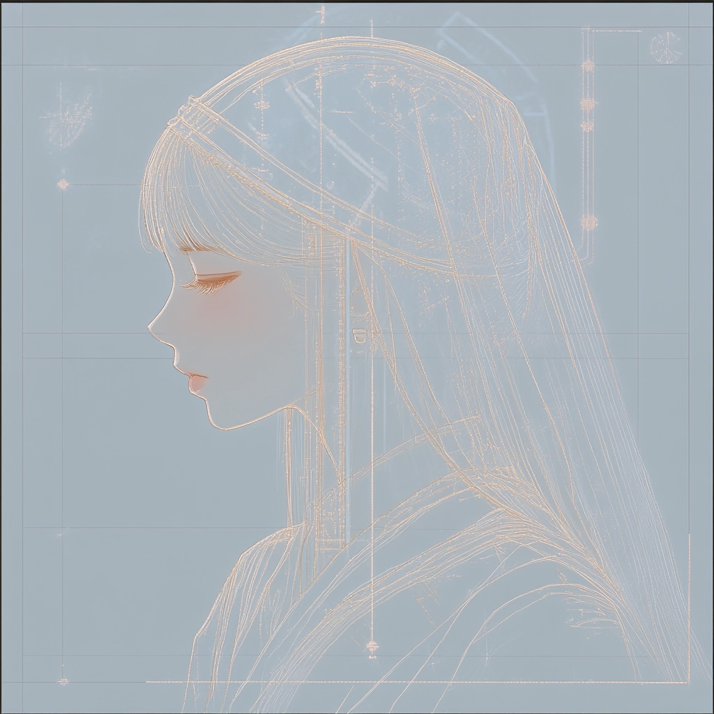 The lighting is understated, allowing for detailed line work and soft textures to dominate within a spacious layout. Light cyan background enhances the pale colors, while intricate details emerge softly, yielding a harmonious visual experience.
