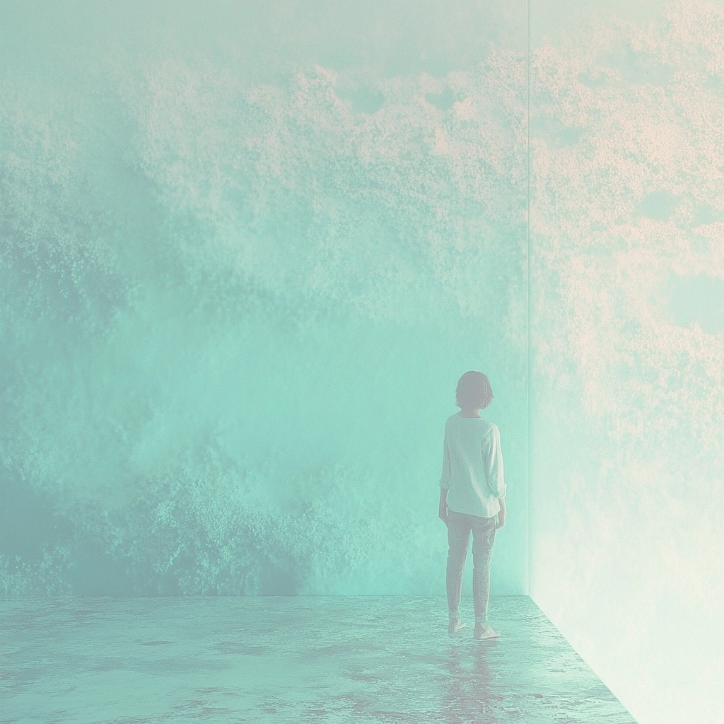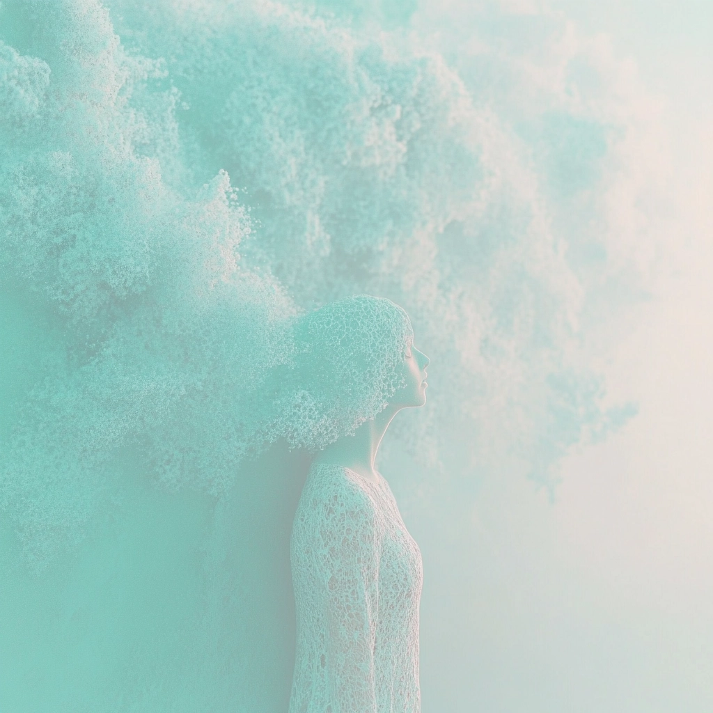 Dominated by cyan and beige tones with soft, diffused lighting creating a dreamlike atmosphere.