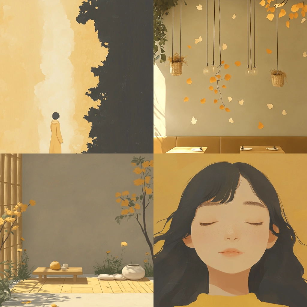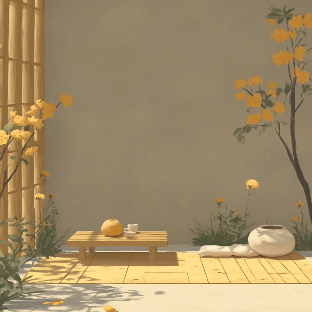 The lighting creates gentle transitions between shadows and highlights, giving depth to the composition. The earthy and warm colors are consistently subdued, creating a balanced spatial sense. Textures are hinted at through smooth surfaces and muted contrasts.