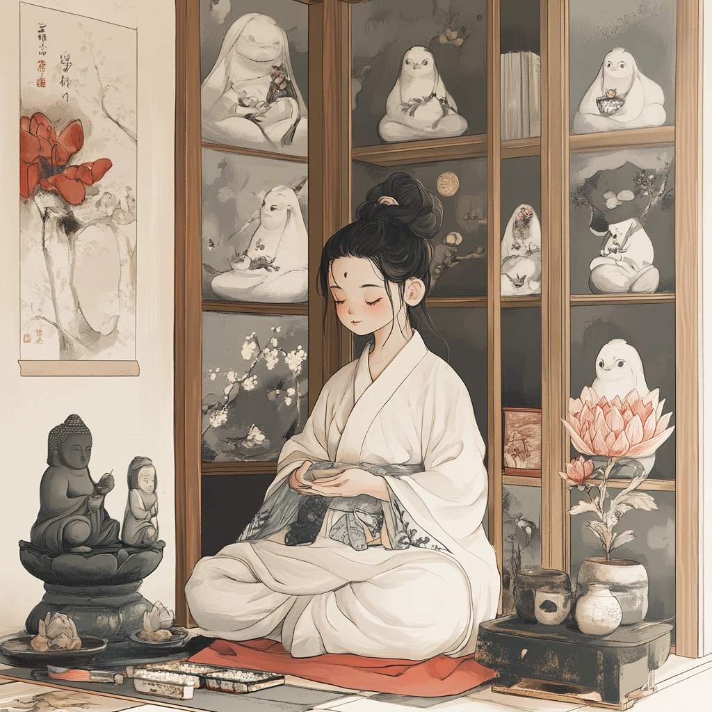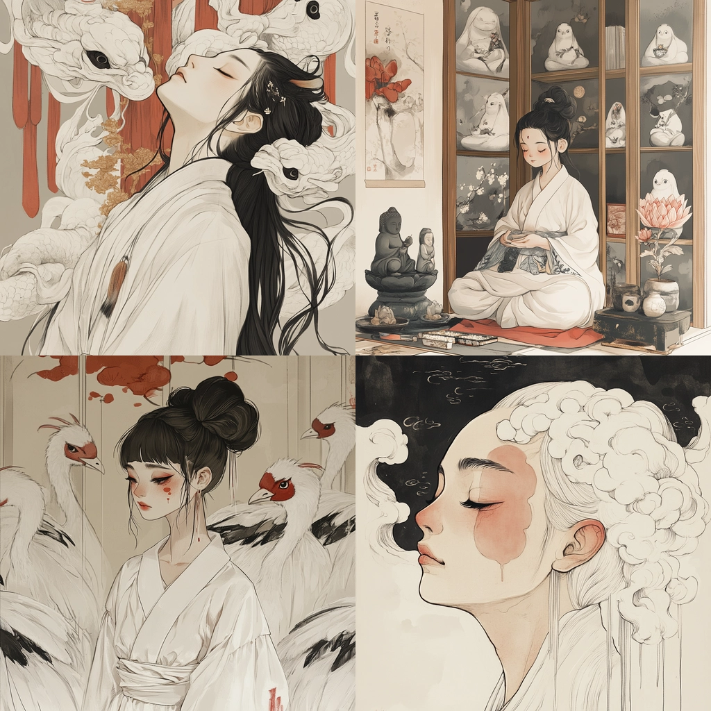 Lighting creates soft shadows enhancing the depth. Colors are predominantly muted with whites and browns, giving a natural and calming effect. Careful texture application is seen in intricate details, emphasizing realism with smooth and deliberate brushwork.