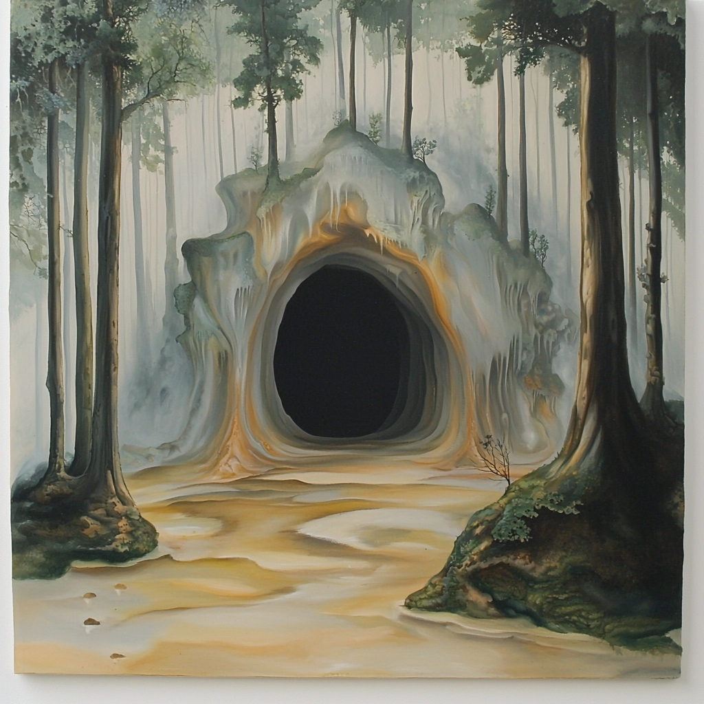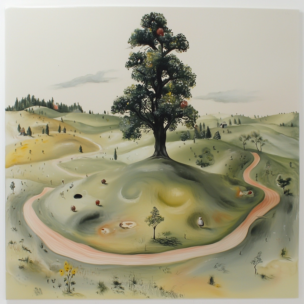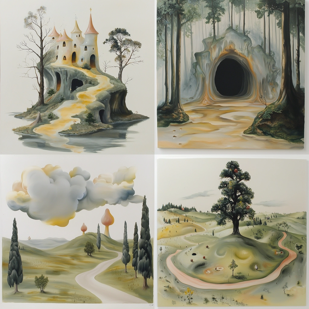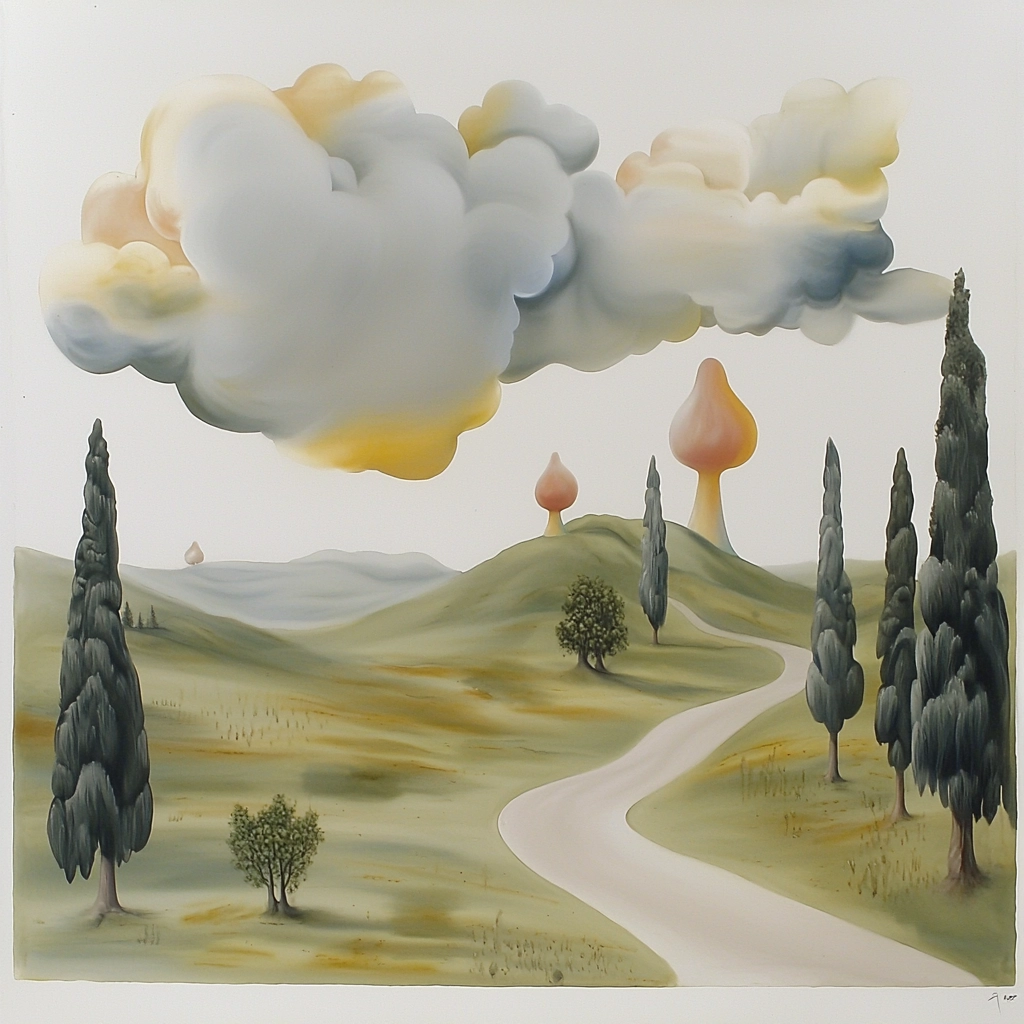 Pastel tones cascade in flowing forms over smooth, rounded landscapes.