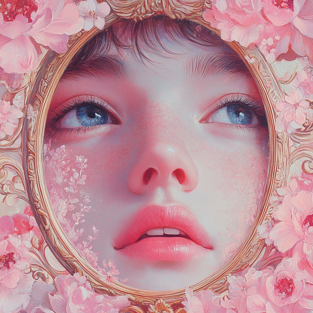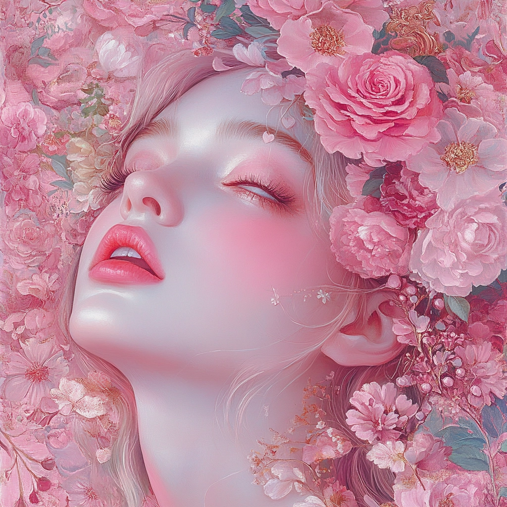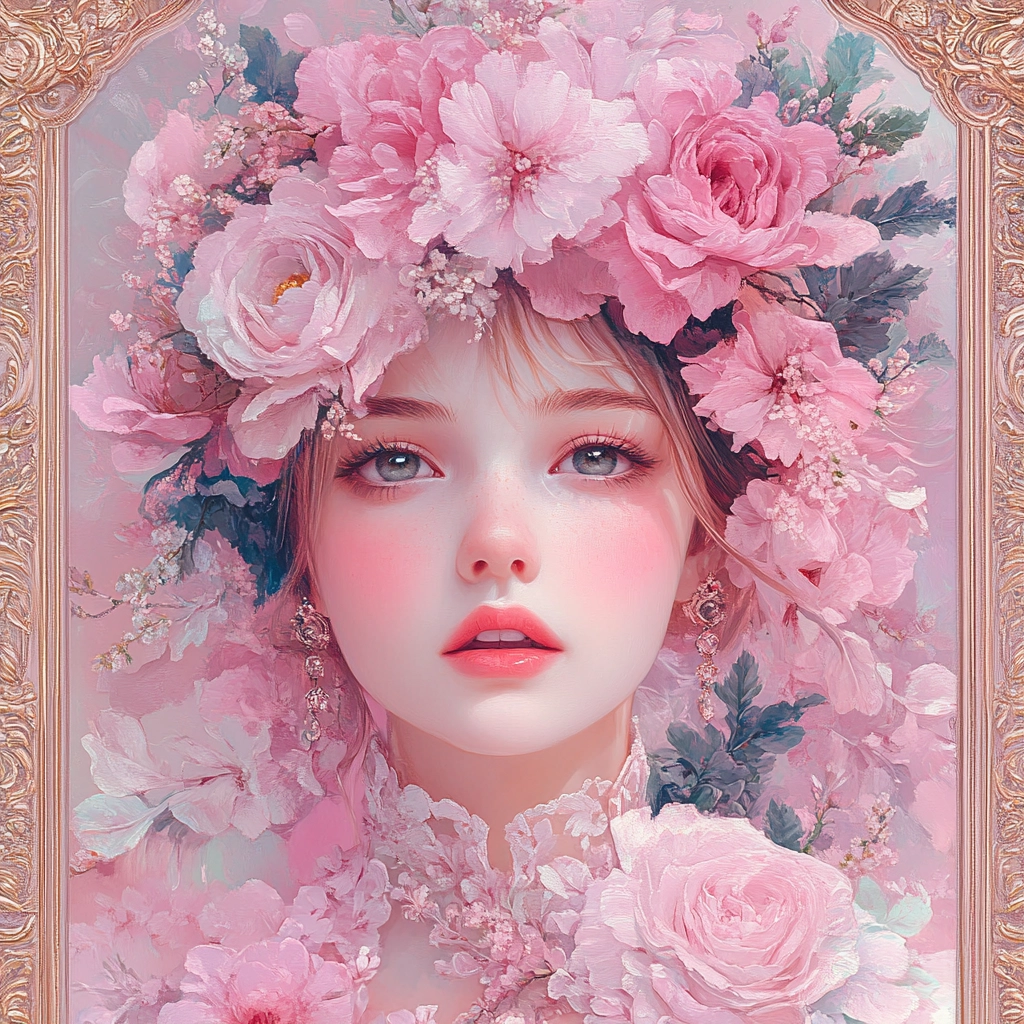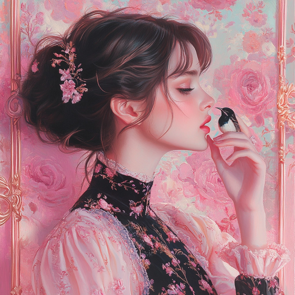 A pastel composition with elaborate floral patterns in warm tones contrasted by darker accents.
