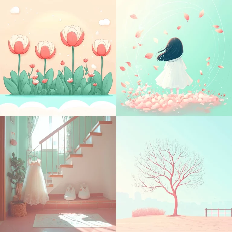 Soft lighting enhances the gentle textures and muted colors, creating a tranquil spatial depth. Delicate floral details are meticulously drawn, embellished with pale hues that emphasize a light and airy texture.