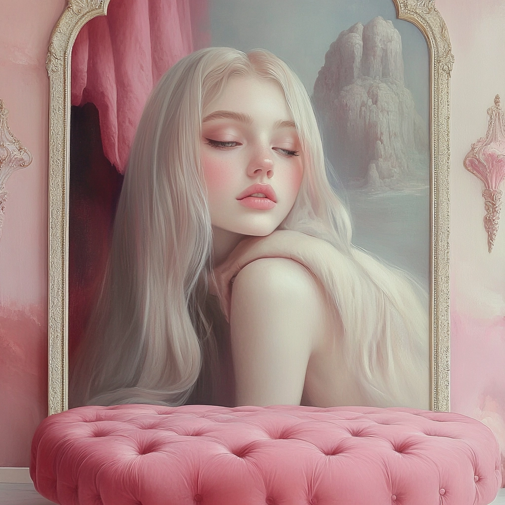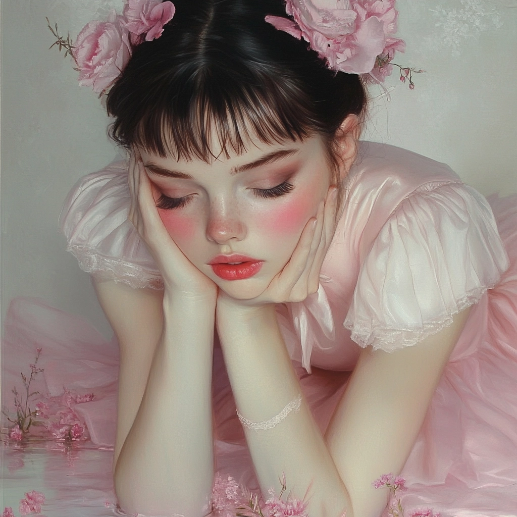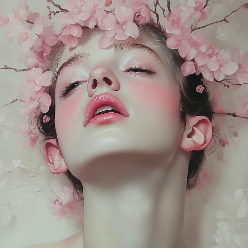 The lighting effects are soft and diffused, giving a gentle illumination. The color palette is dominated by bright pinks and whites, lending a luminous quality. Space is created through the soft textures and subtle gradations of color, with a delicate rendering of floral elements.