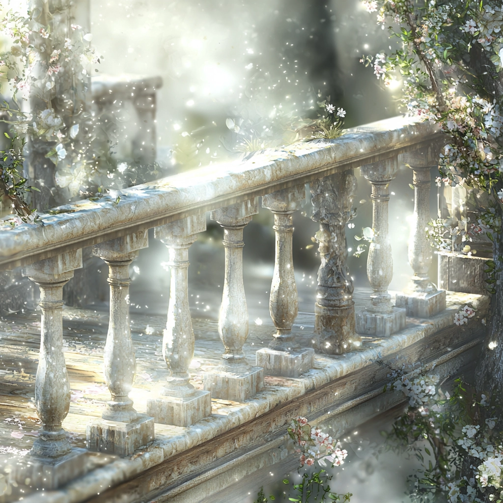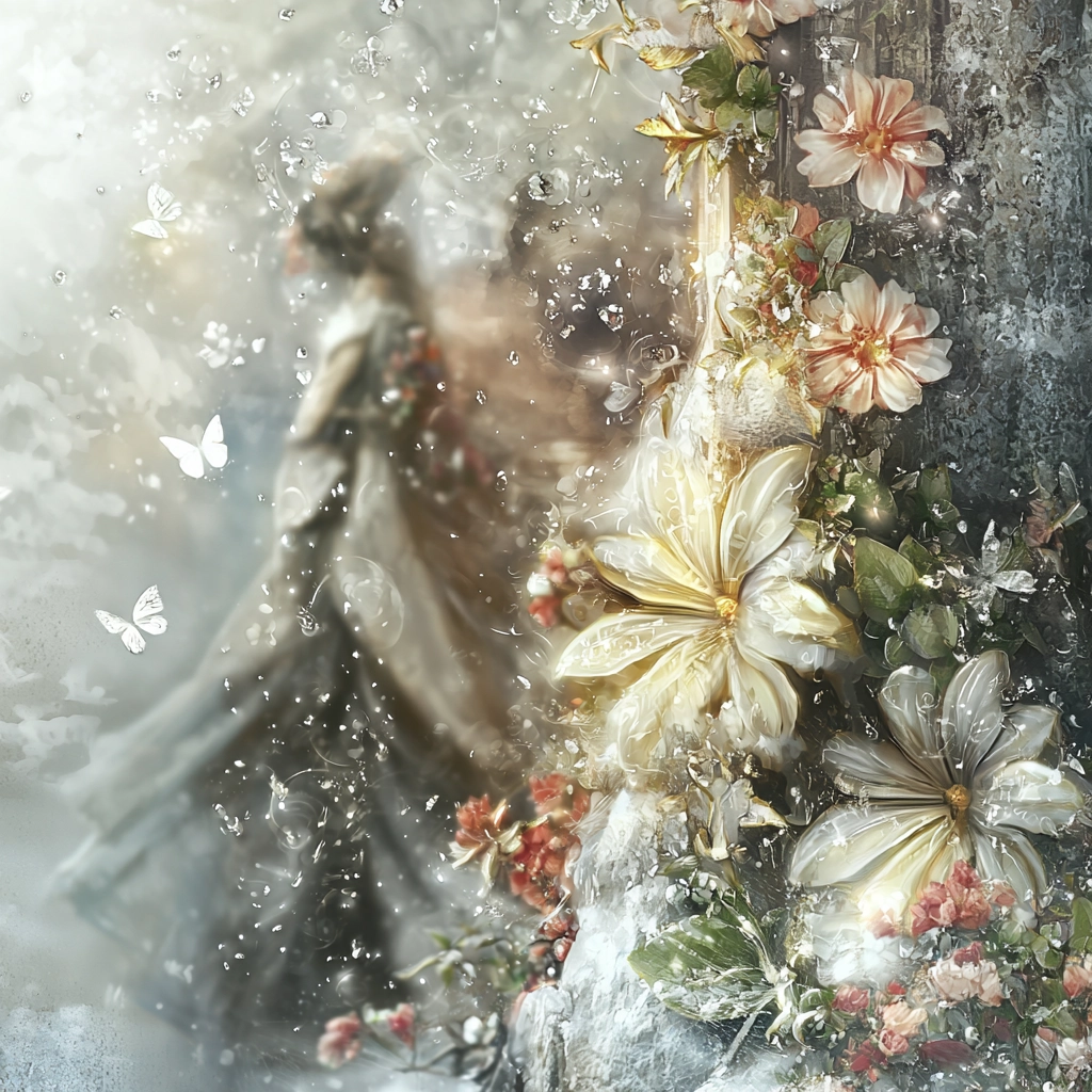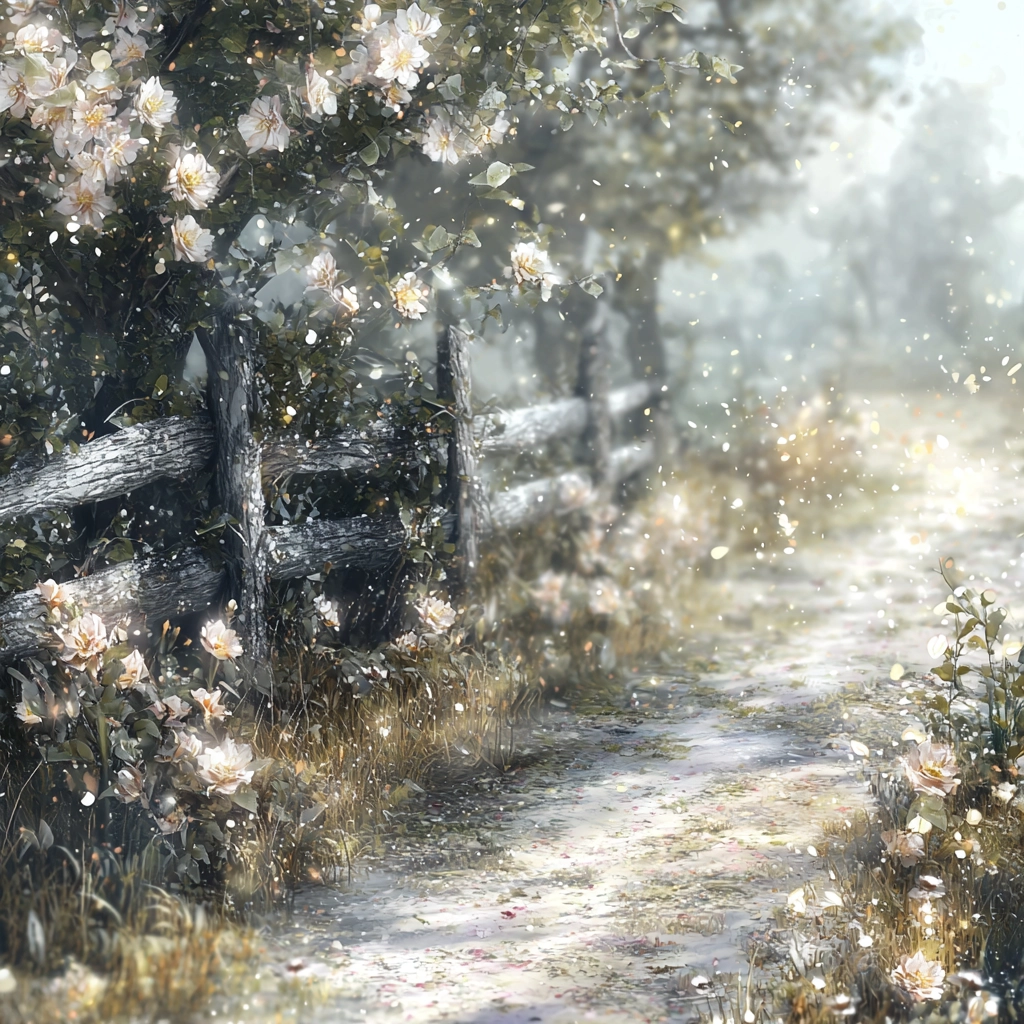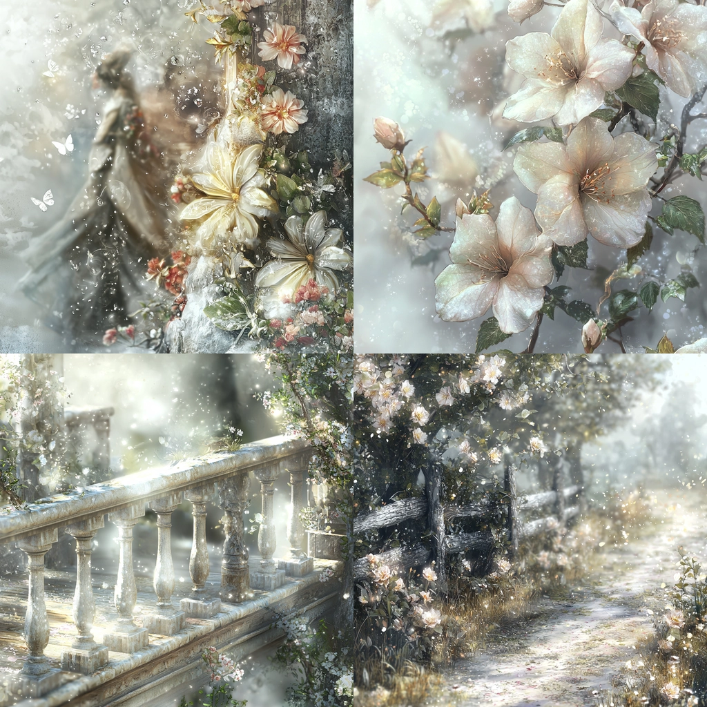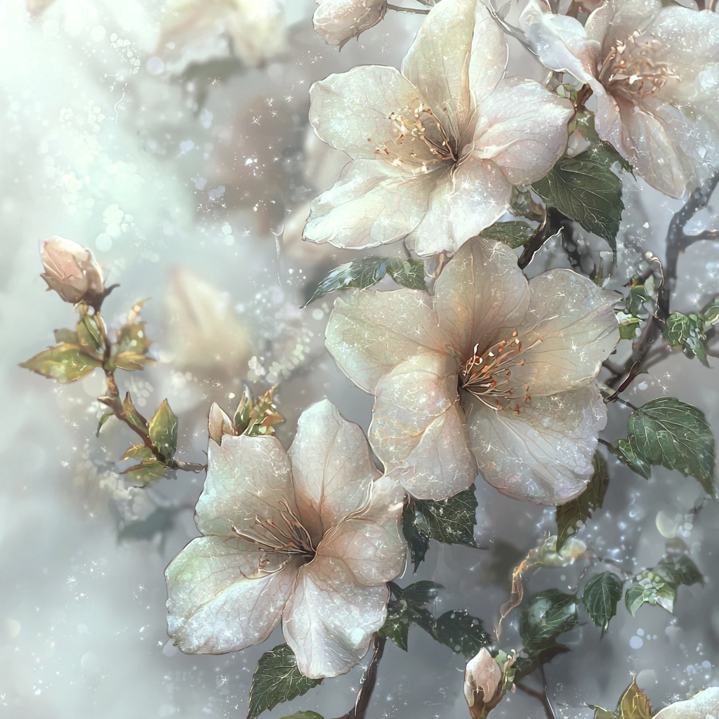 The lighting softly diffuses across the scene, casting gentle highlights and subtle shadows, creating a delicate transition between elements. The texture is depicted with tender strokes that highlight the organic surfaces and amplify a fluid spatial depth.