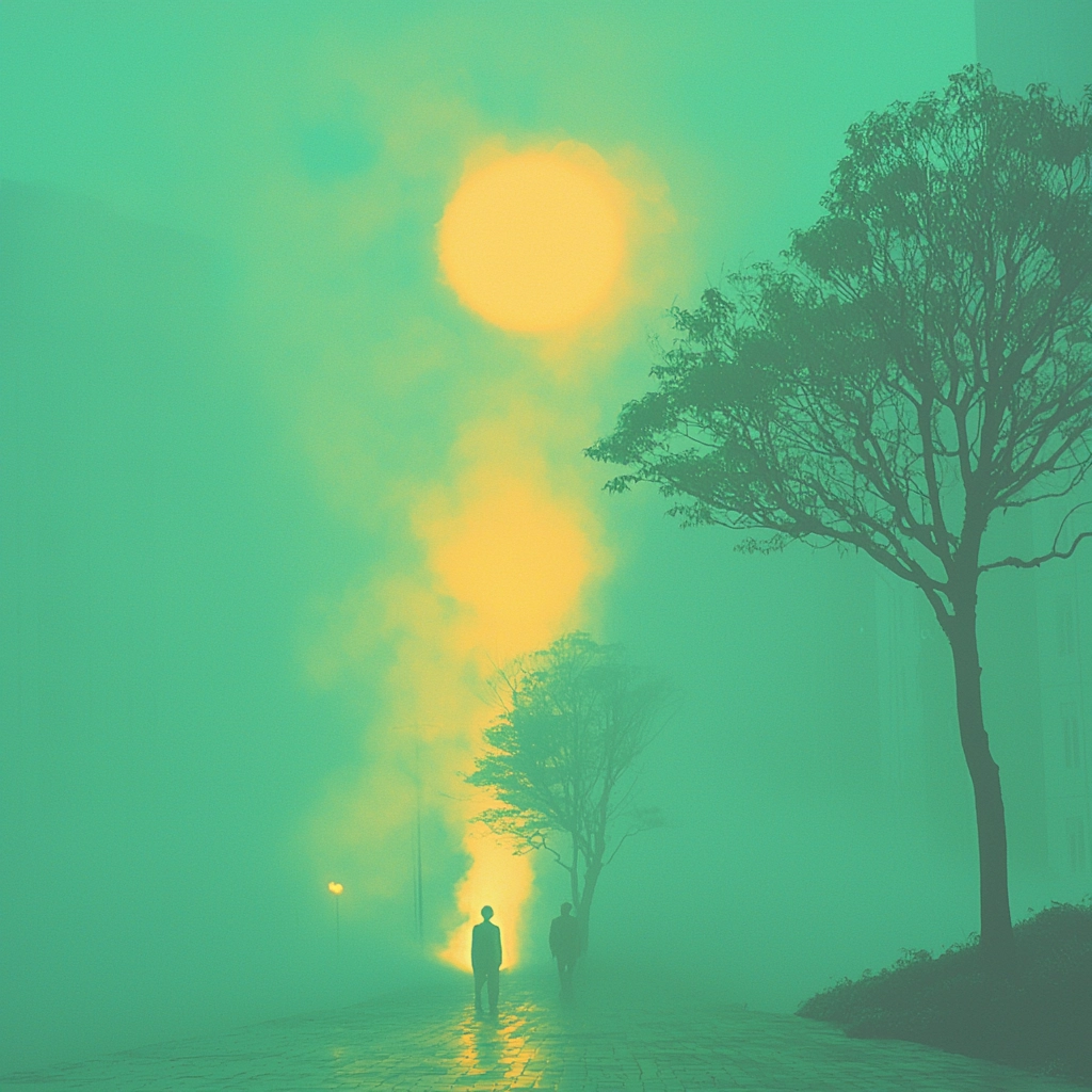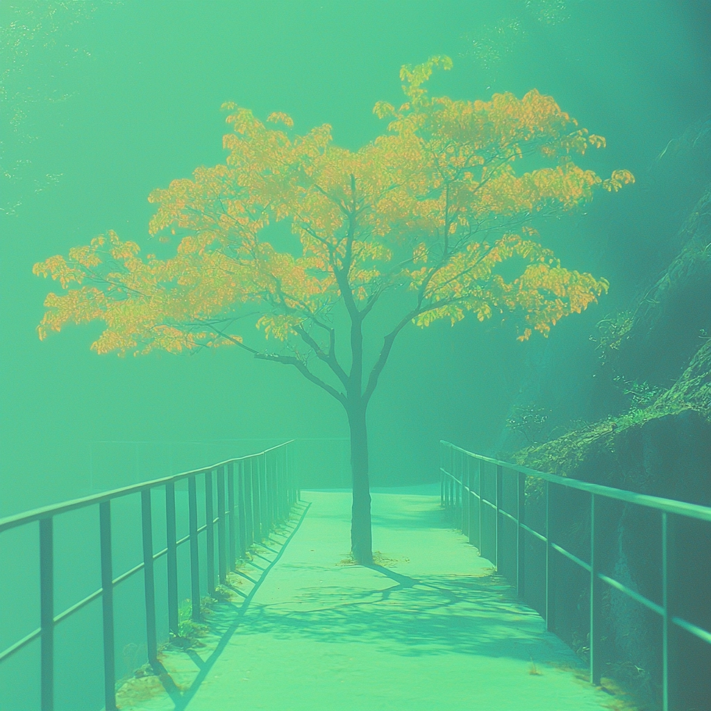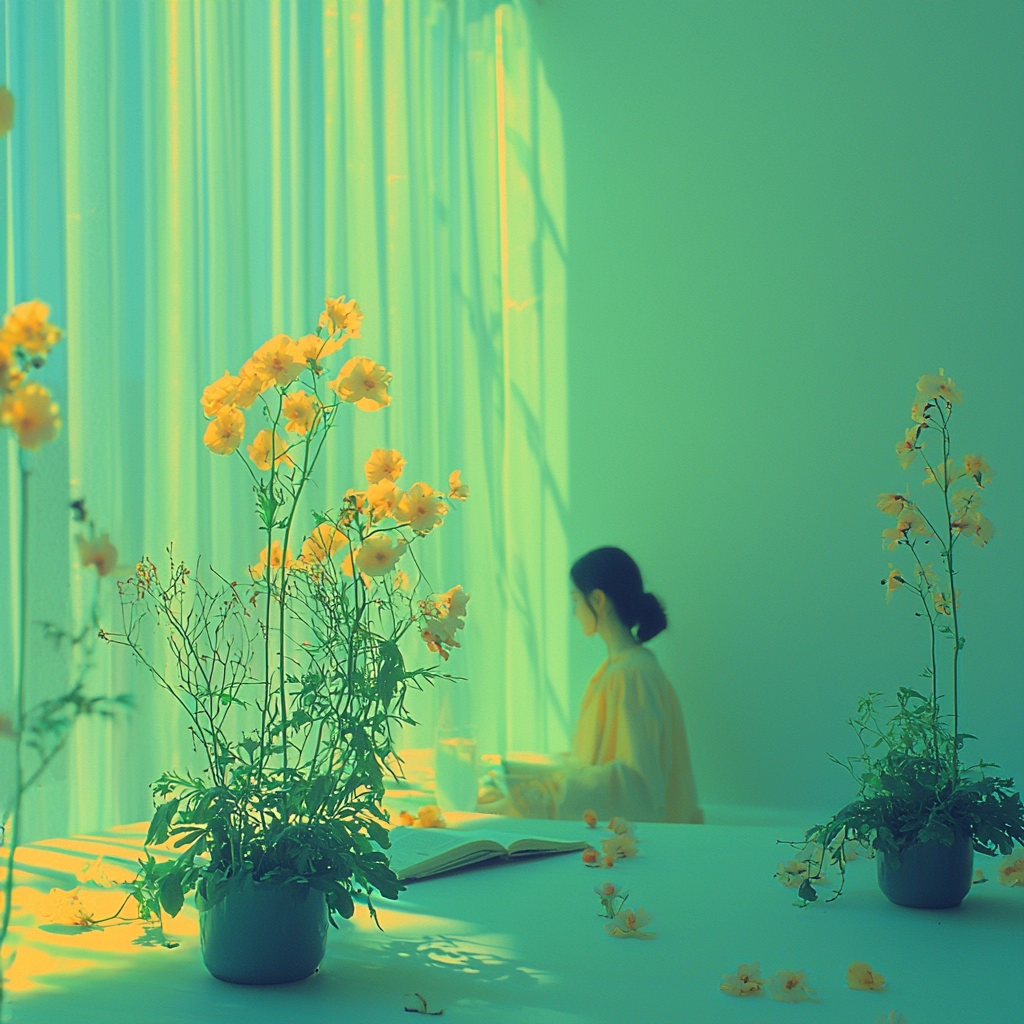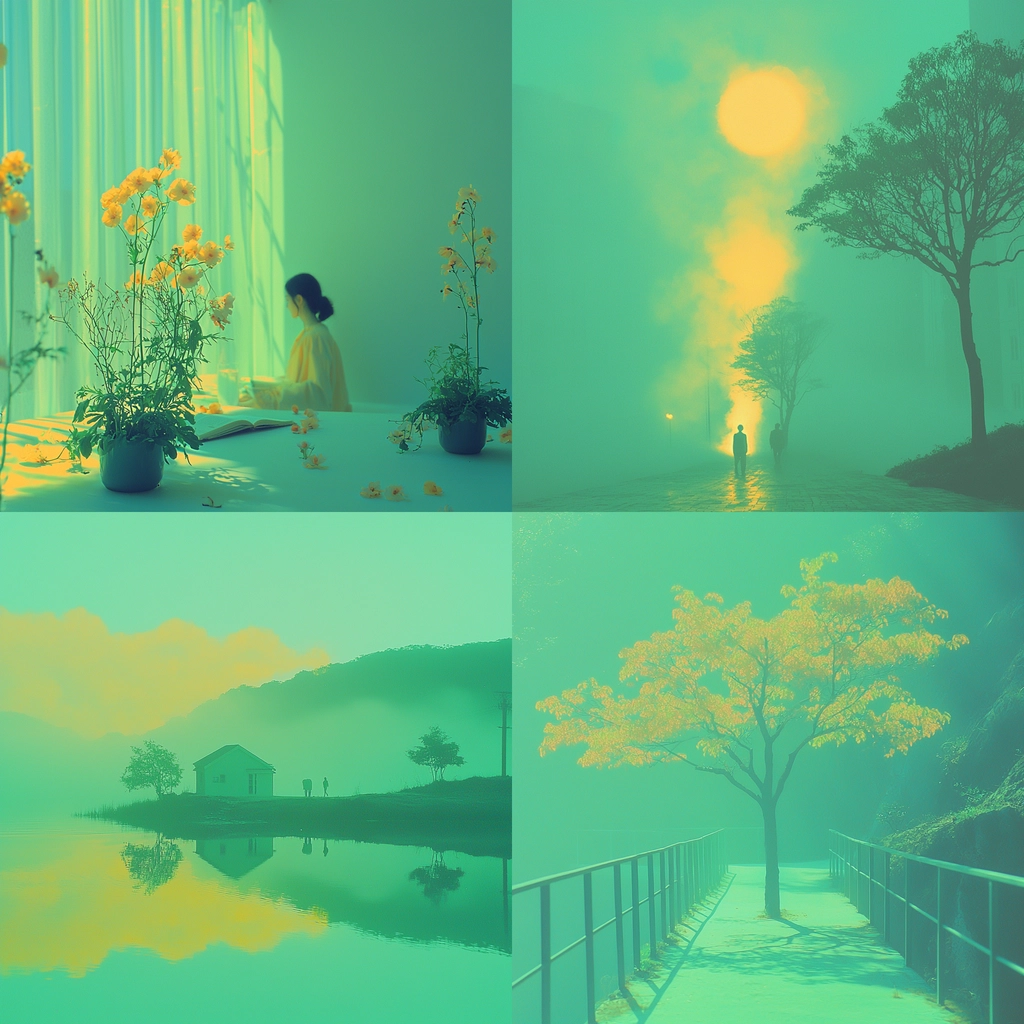 Diffuse lighting softens edges and saturates green hues, while yellow highlights add points of visual emphasis. The use of shallow depth of field and mist-like gradients generate spatial layering, and smooth textures enhance overall calmness without harsh contrasts.