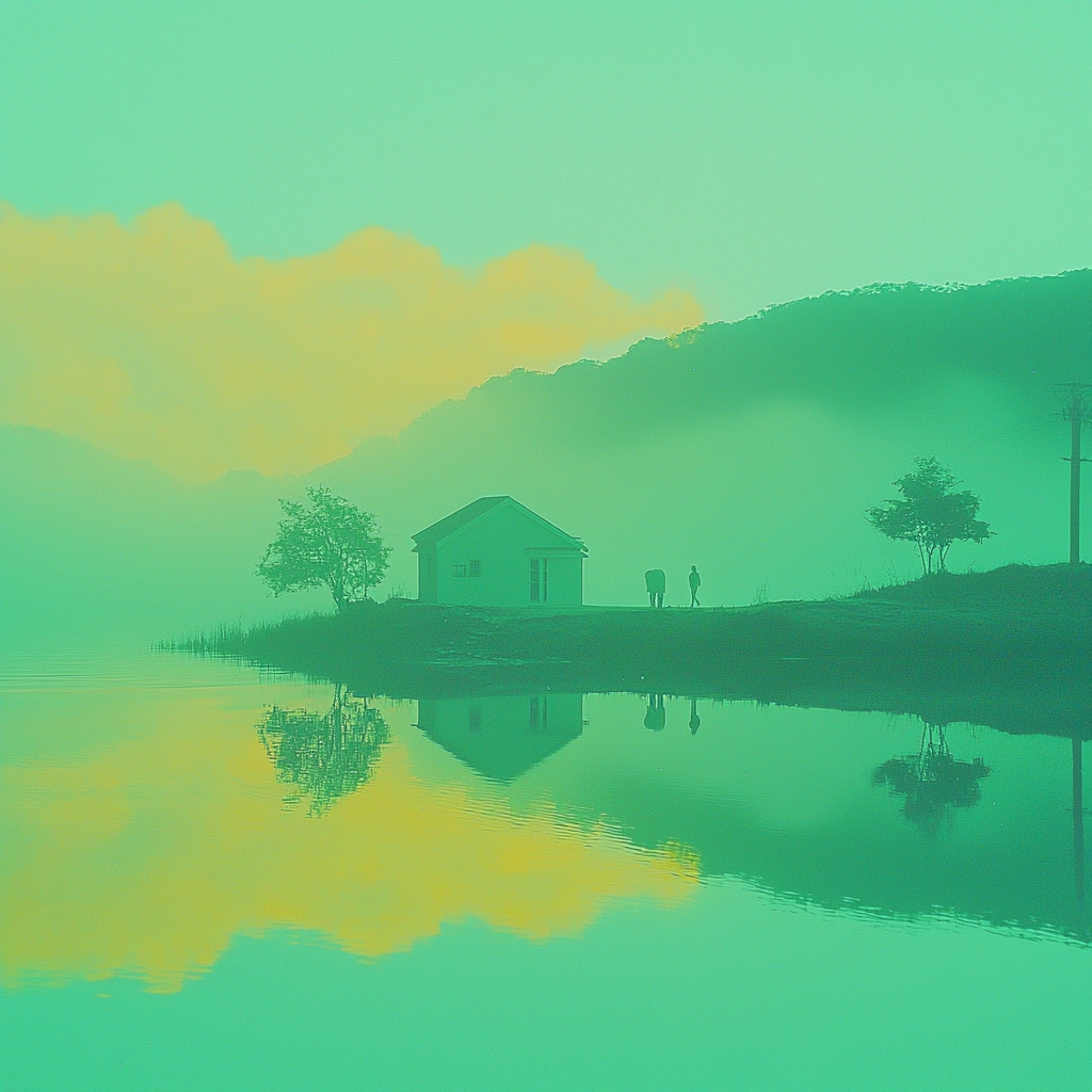 Muted green tones dominate with soft yellow highlights, balanced by gentle diffusion of light creating layered composition and spatial depth in intimate and open settings.