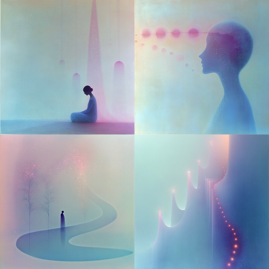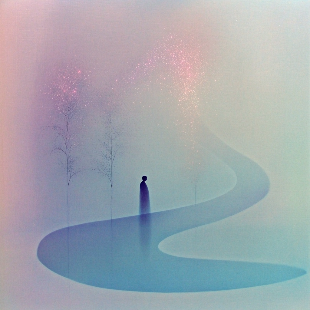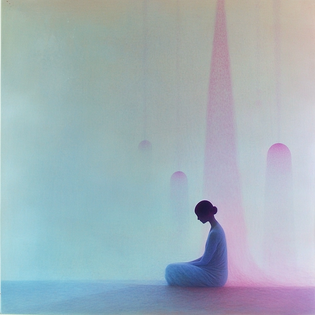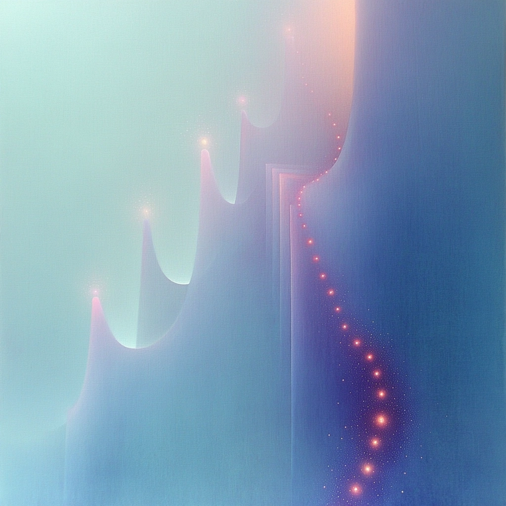 Soft lighting effects enhance the smooth blend of pastels, creating a gentle gradient. Subtle shifts in space offer an expansive feel, while the texture remains smooth and ethereal. Light is diffused evenly across the forms, creating harmony.