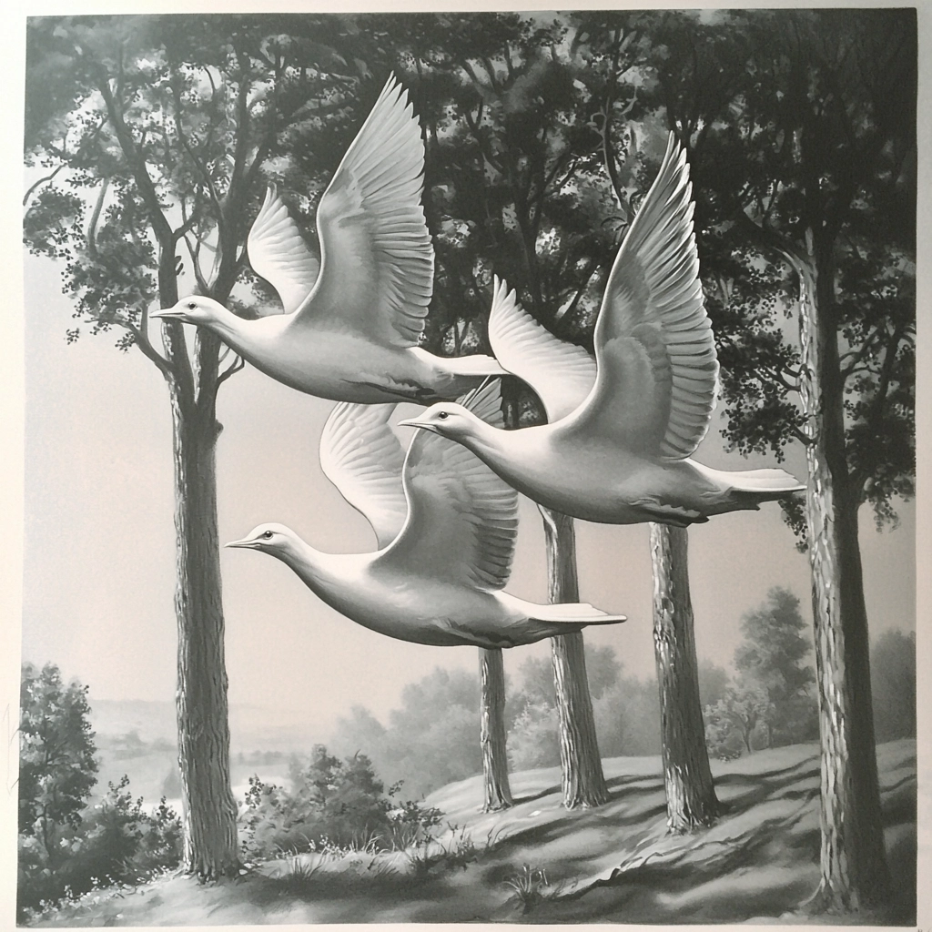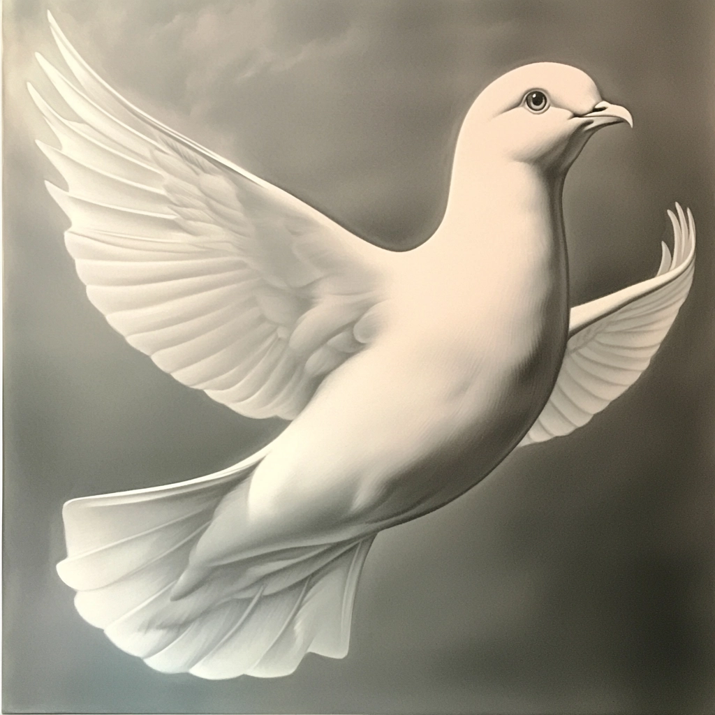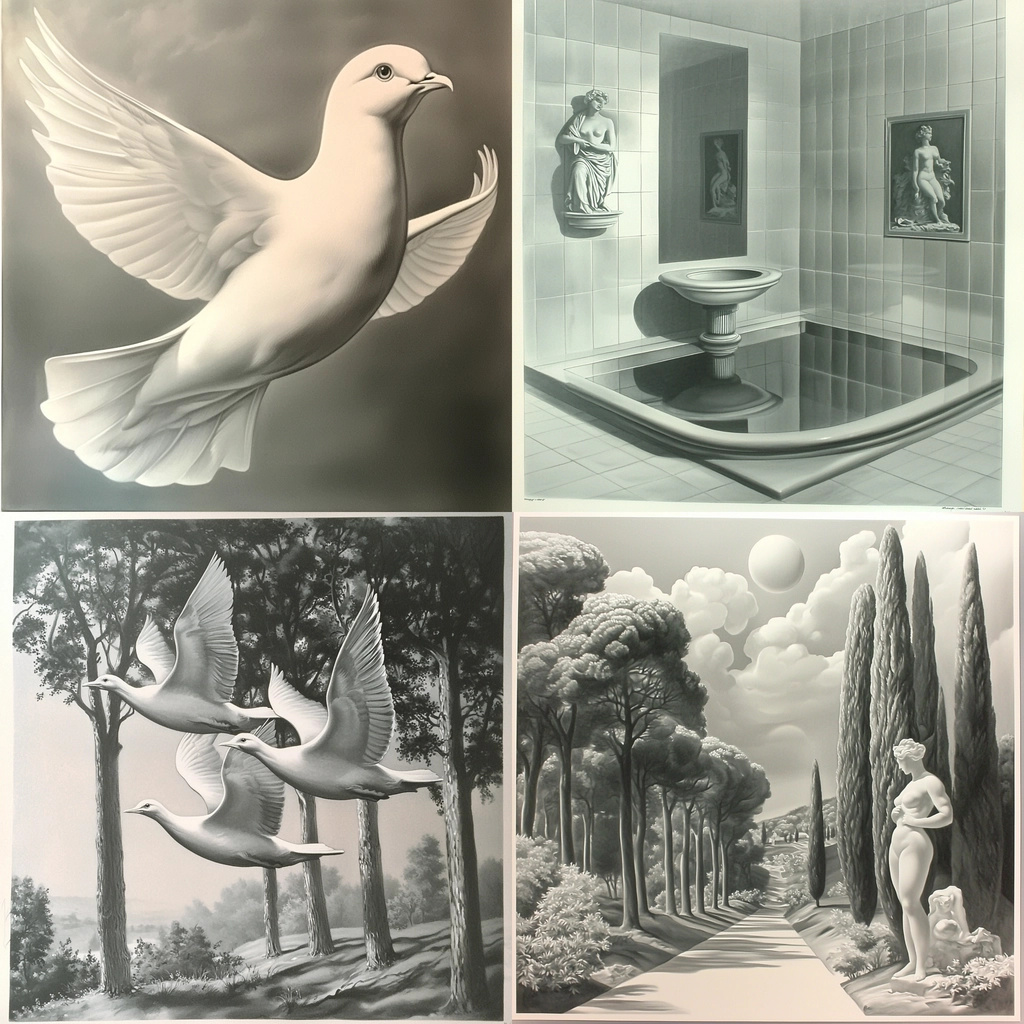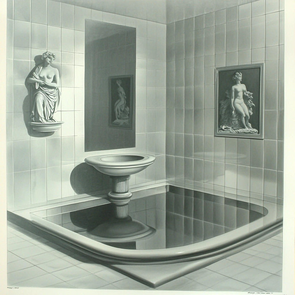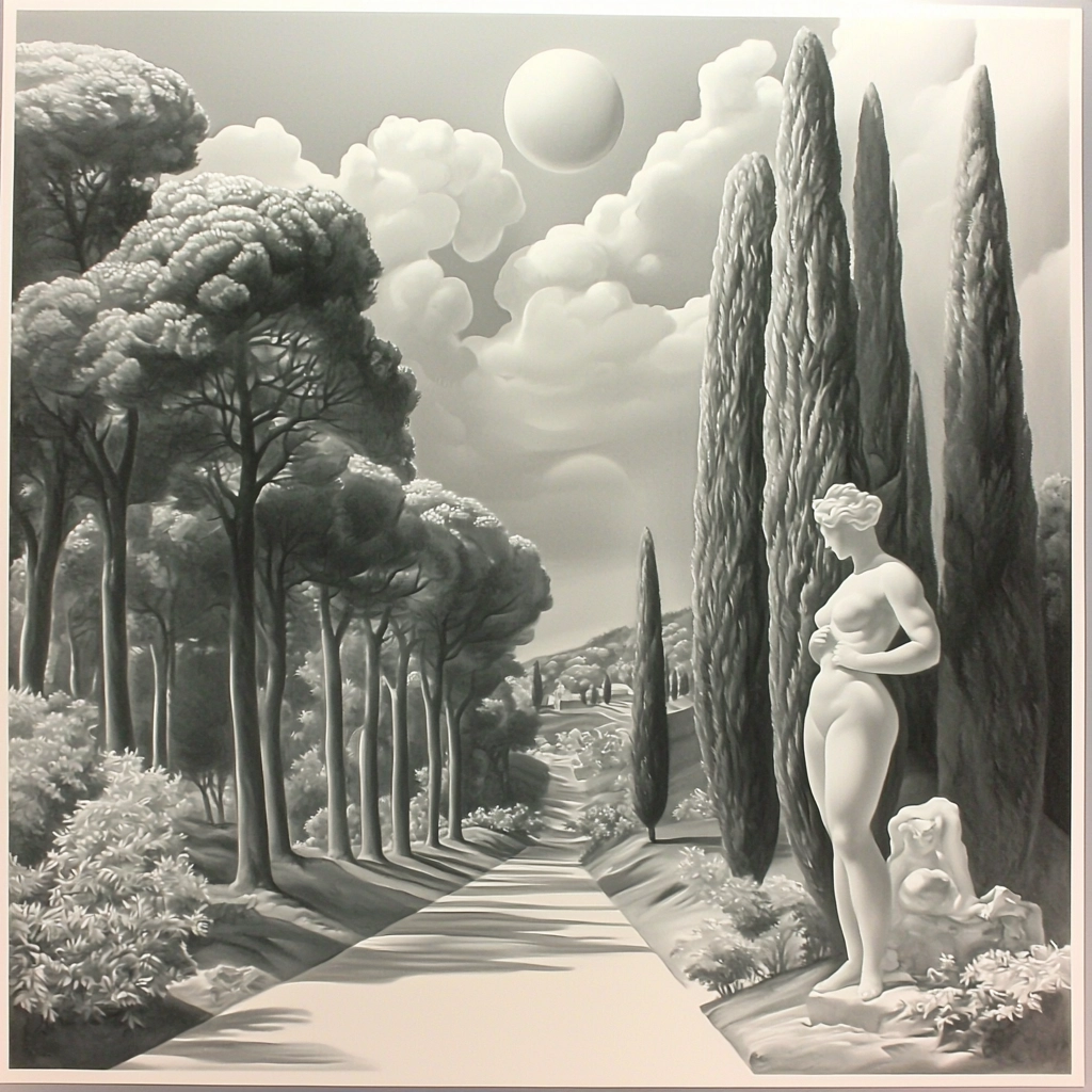 Lighting is soft, creating smooth gradations and subtle shadows. Colors are solely in shades of gray and white, providing a monochromatic palette. Composition utilizes a balanced spatial arrangement, and textures are rendered with high realism and precision.