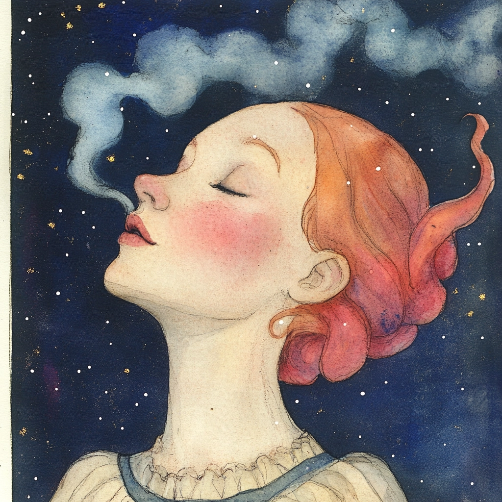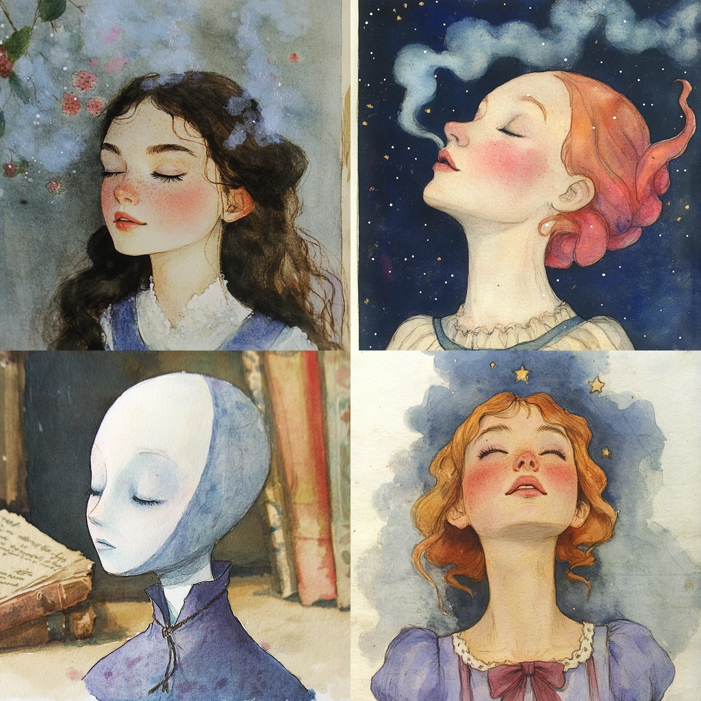 Gentle lighting enhances the soft, fluid application of blues and purples, creating a sense of depth and texture through subtle gradients and washes. The spatial arrangement accentuates the dreamlike composition without harsh lines or edges.