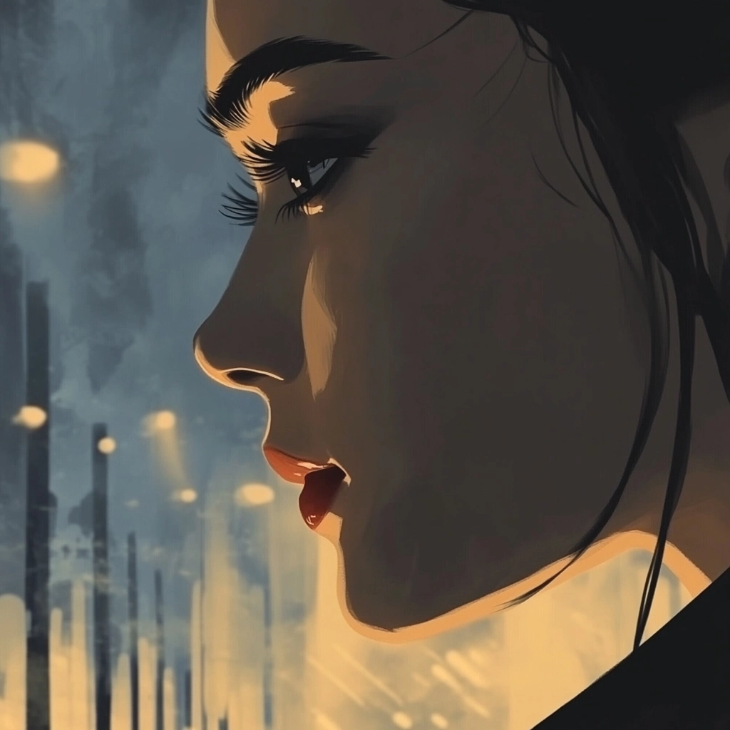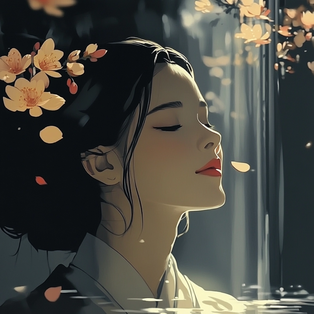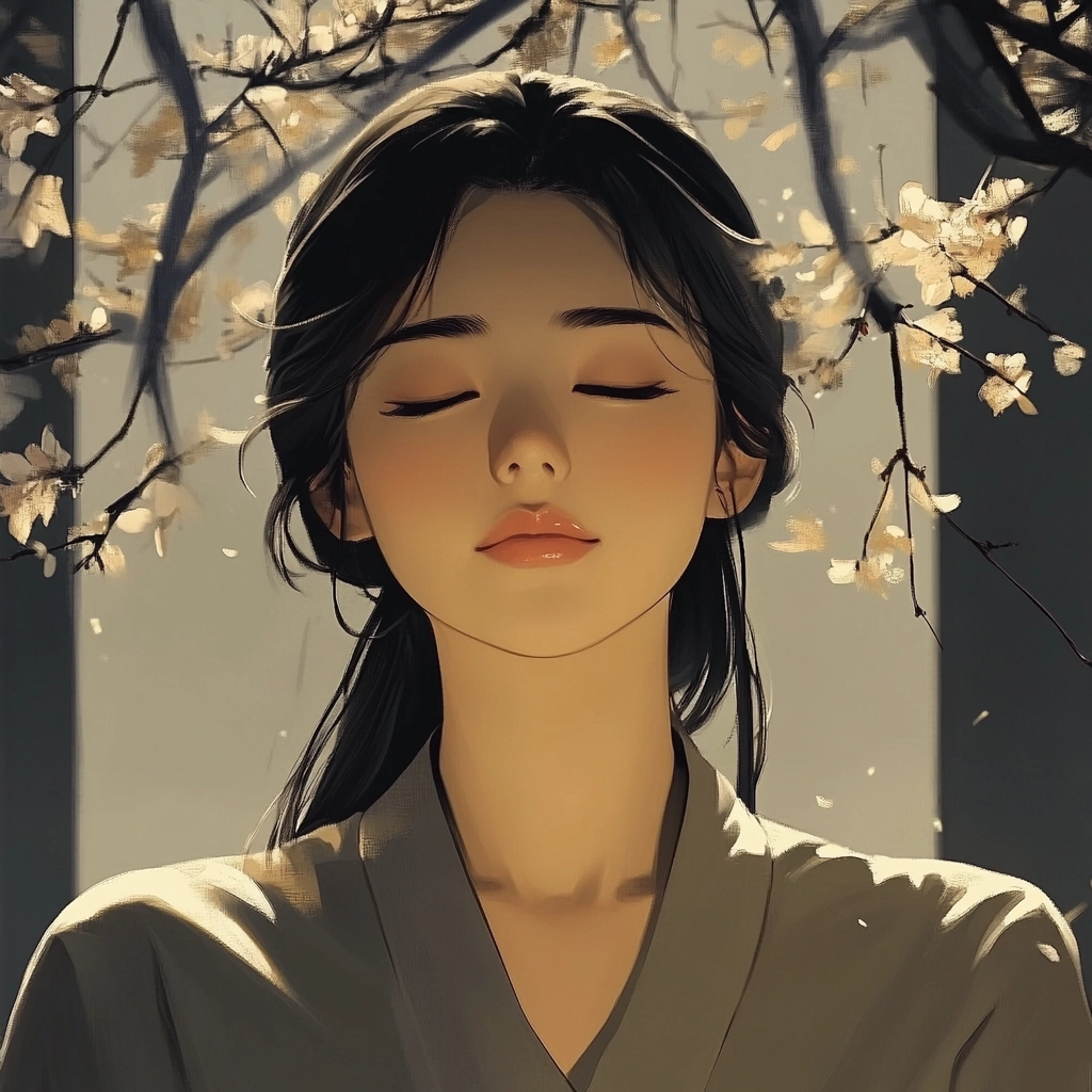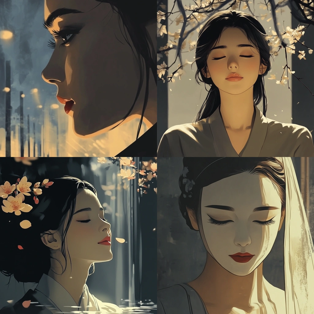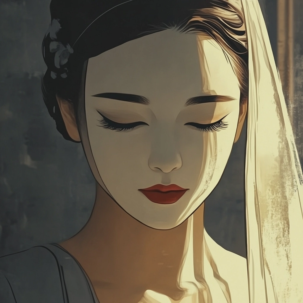The artwork features a delicate interplay of light and shadow, with warm and cool tones creating a soft contrast. Textures are smooth and refined, enhancing the spatial depth and atmospheric presence.
