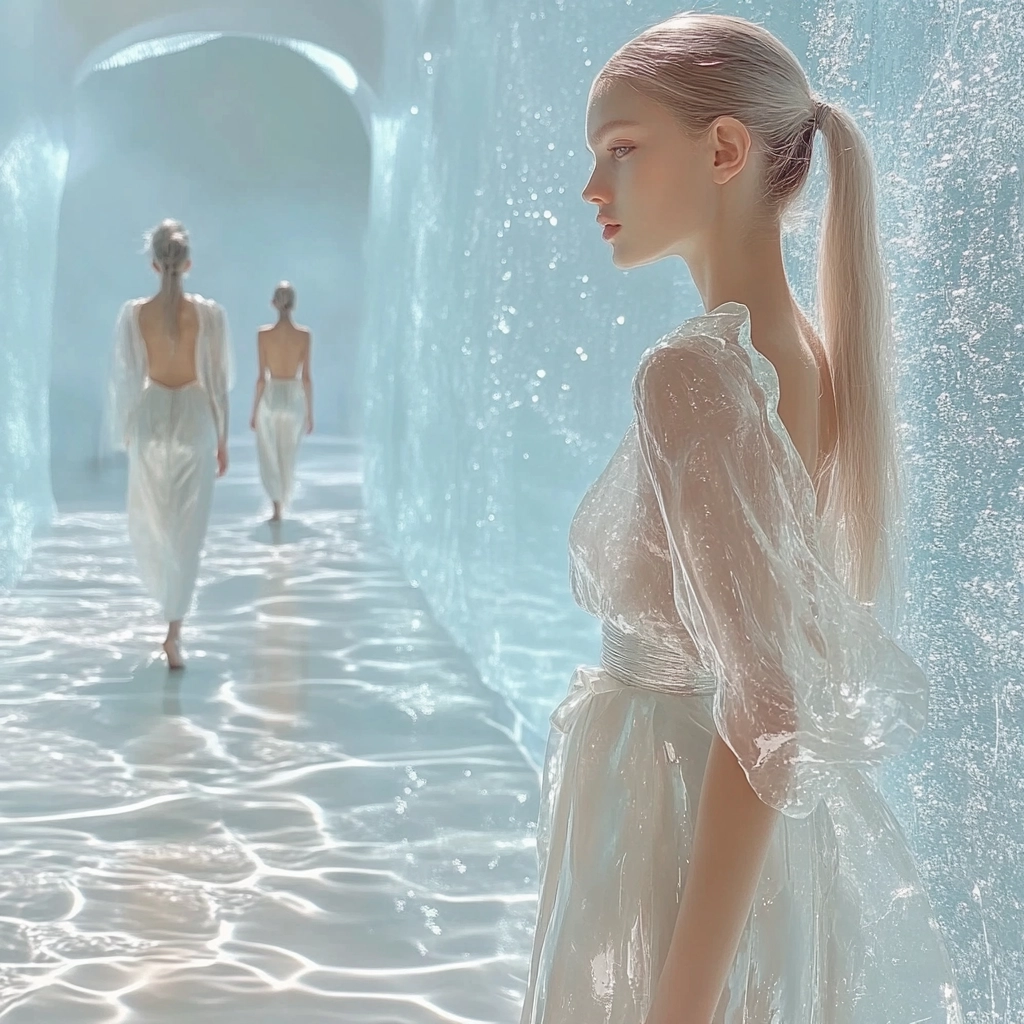 Soft, diffused lighting enhances white and blue hues, giving the scene a luminous quality. The composition uses gentle textures and silver highlights to convey a sense of tranquility, emphasizing spatial depth and ethereal motion.