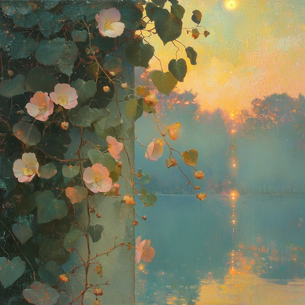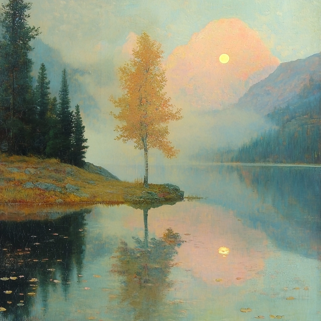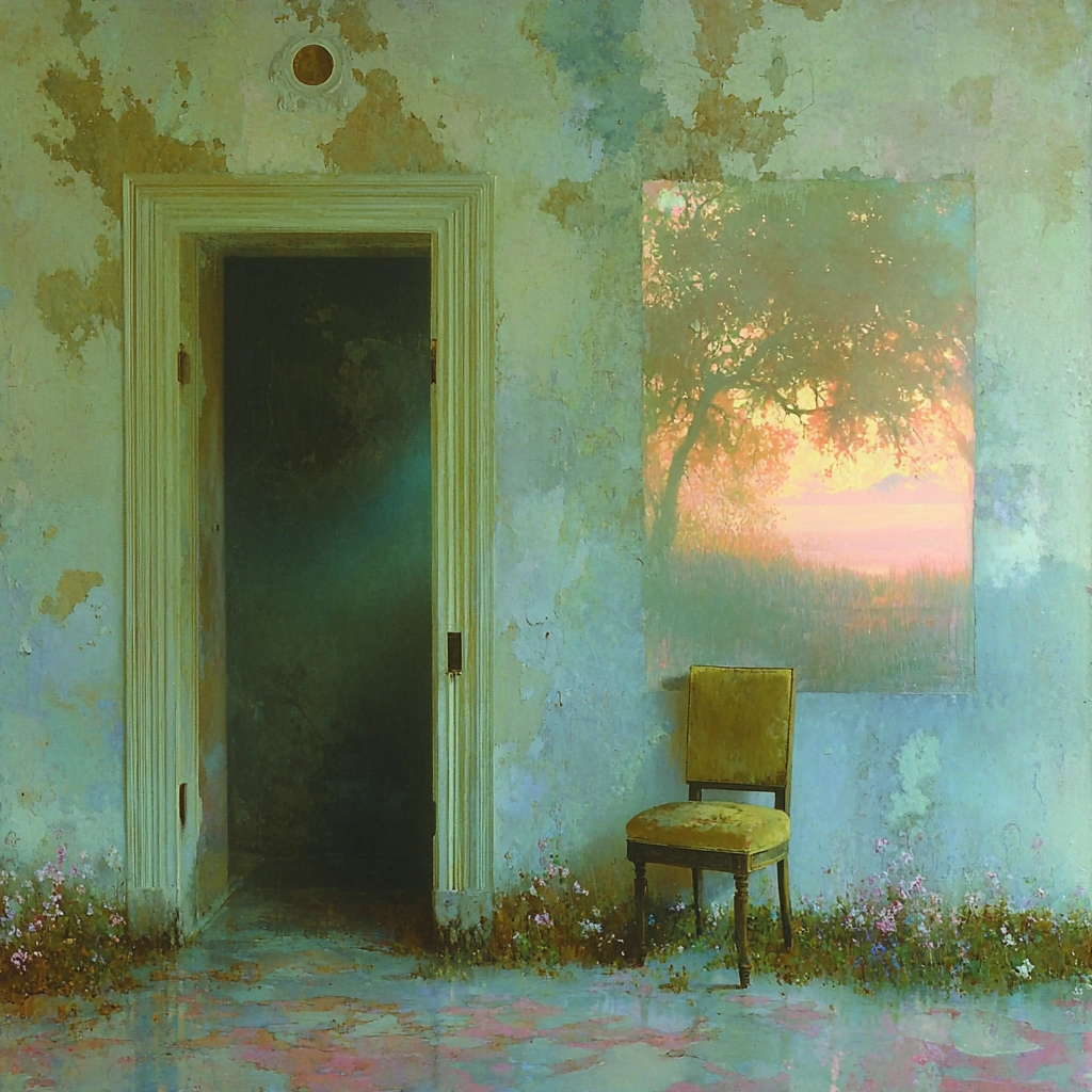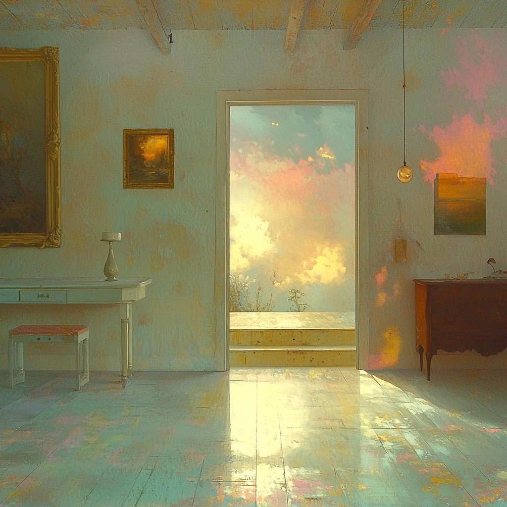 The lighting creates gentle transitions between elements, enhancing depth and atmosphere. Colors are muted yet vibrant, with smooth transitions that lend a harmonious spatial feel. Textures appear softly blended.