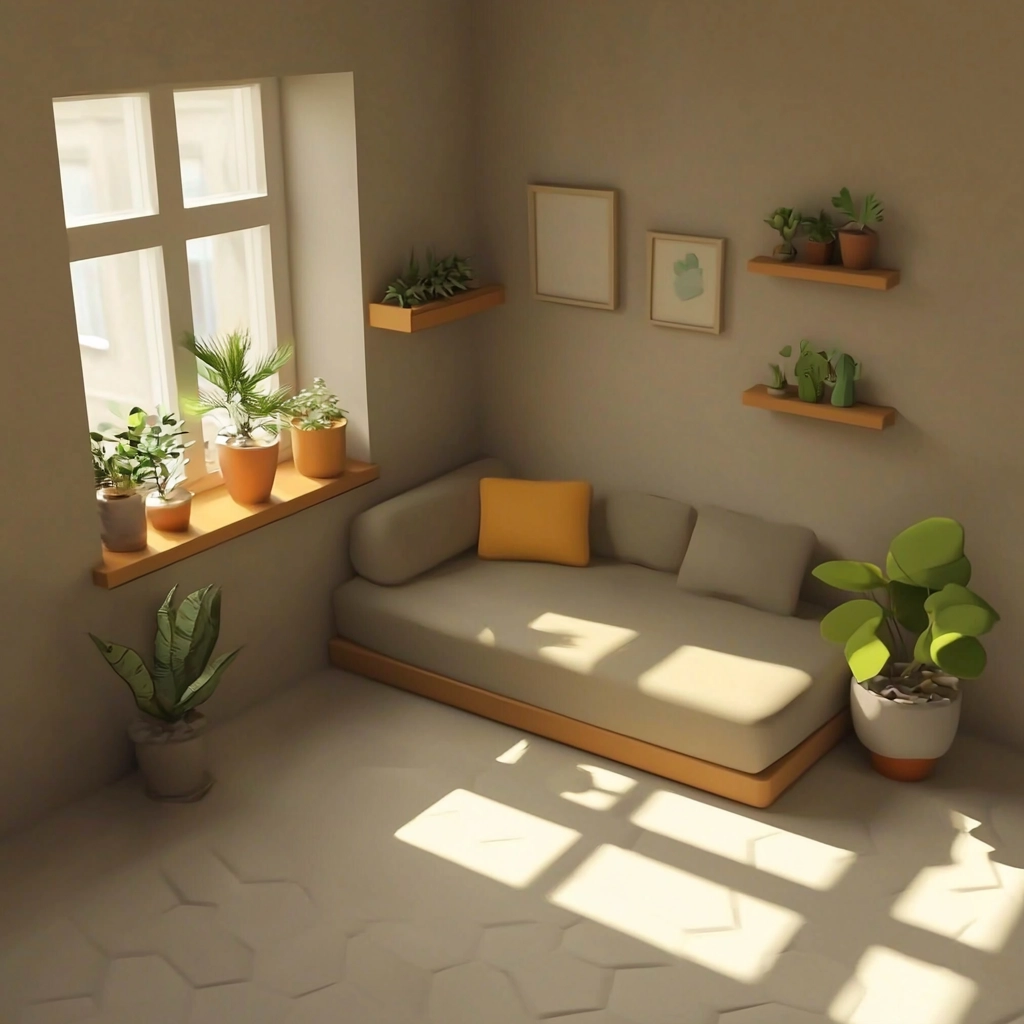 Natural lighting creates soft shadows, enhancing a tranquil atmosphere. The emphasis is on smooth textures and simple shapes, giving a clean and uncluttered spatial feel, with subtle details in lighting providing depth and definition.