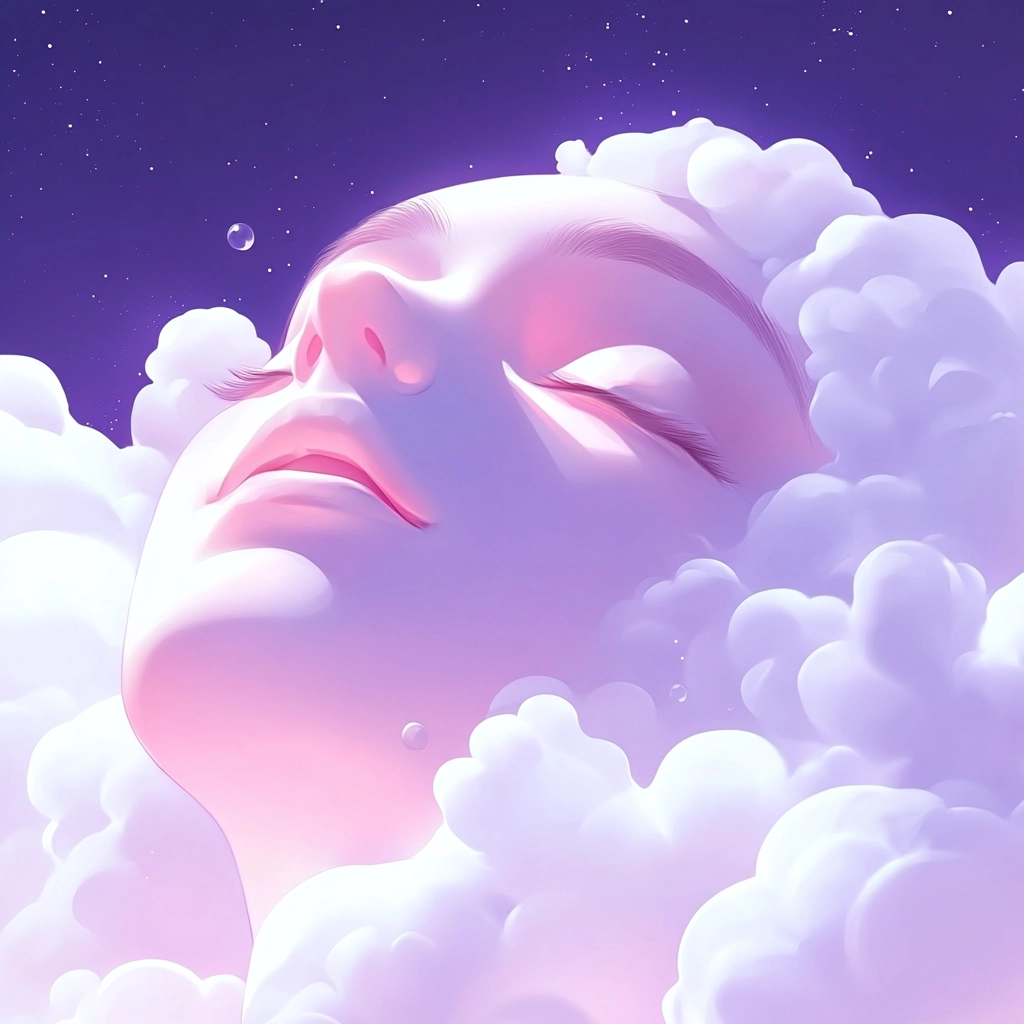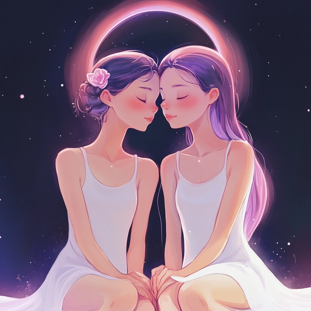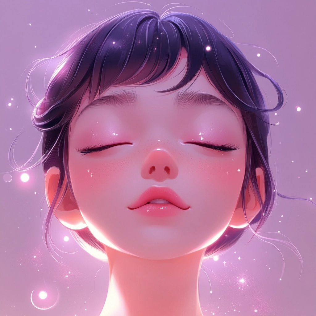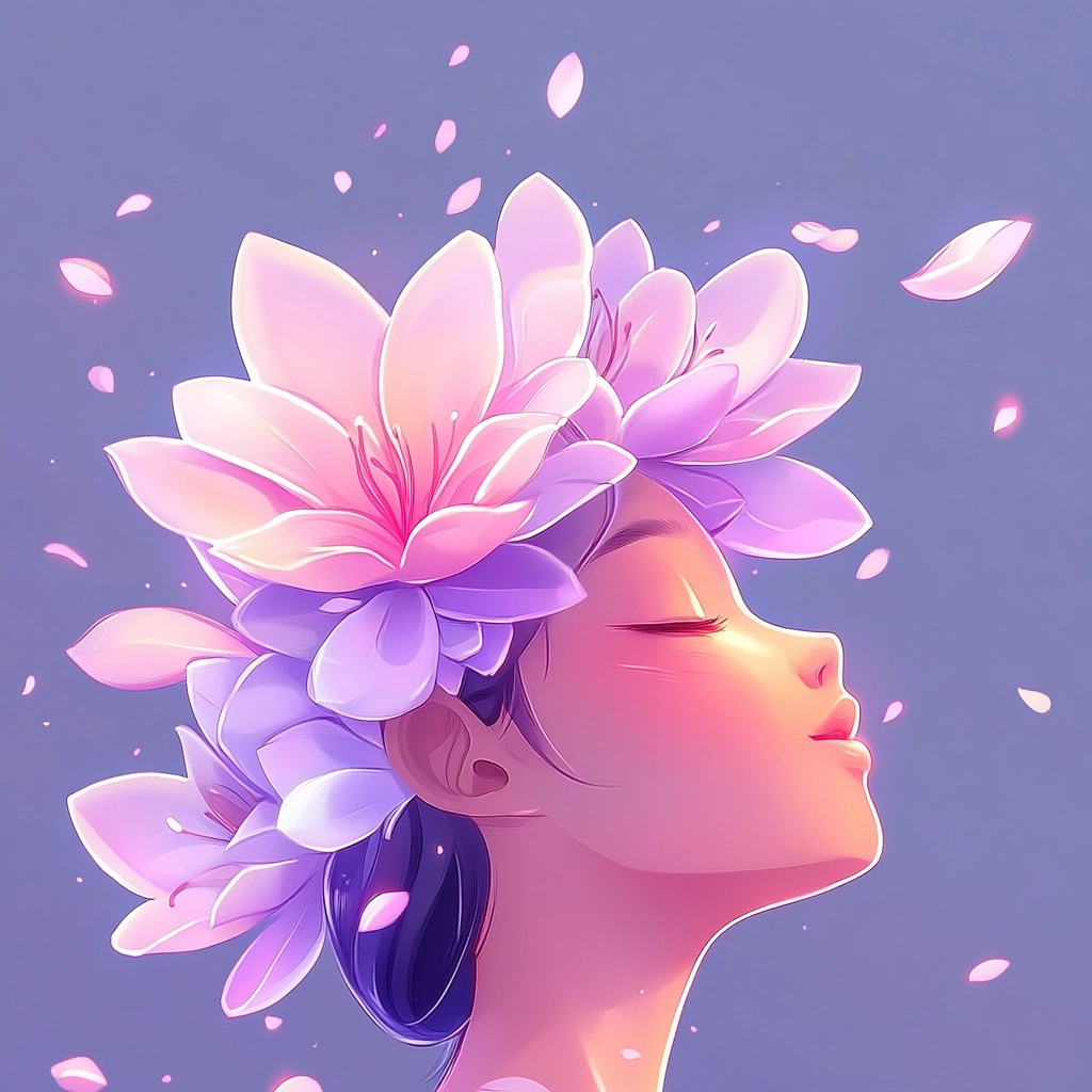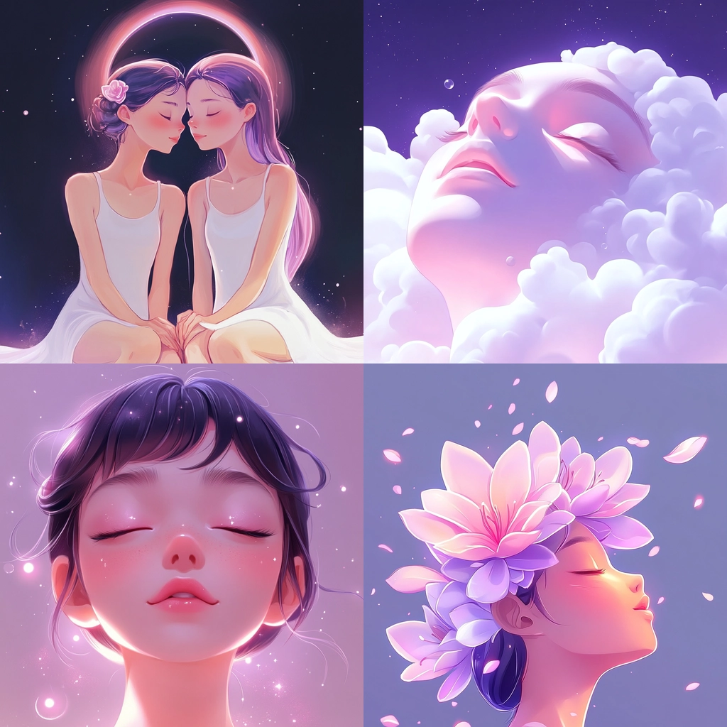The soft lighting bathes the subjects in a gentle glow, enhancing the pastel colors of purple, pink, and white. The overall composition gives a sense of calm and quietude, with gentle transitions and subtle shading adding depth and texture. Light sources are diffused, creating a softened spatial sense and a serene visual experience.