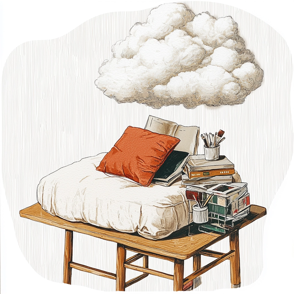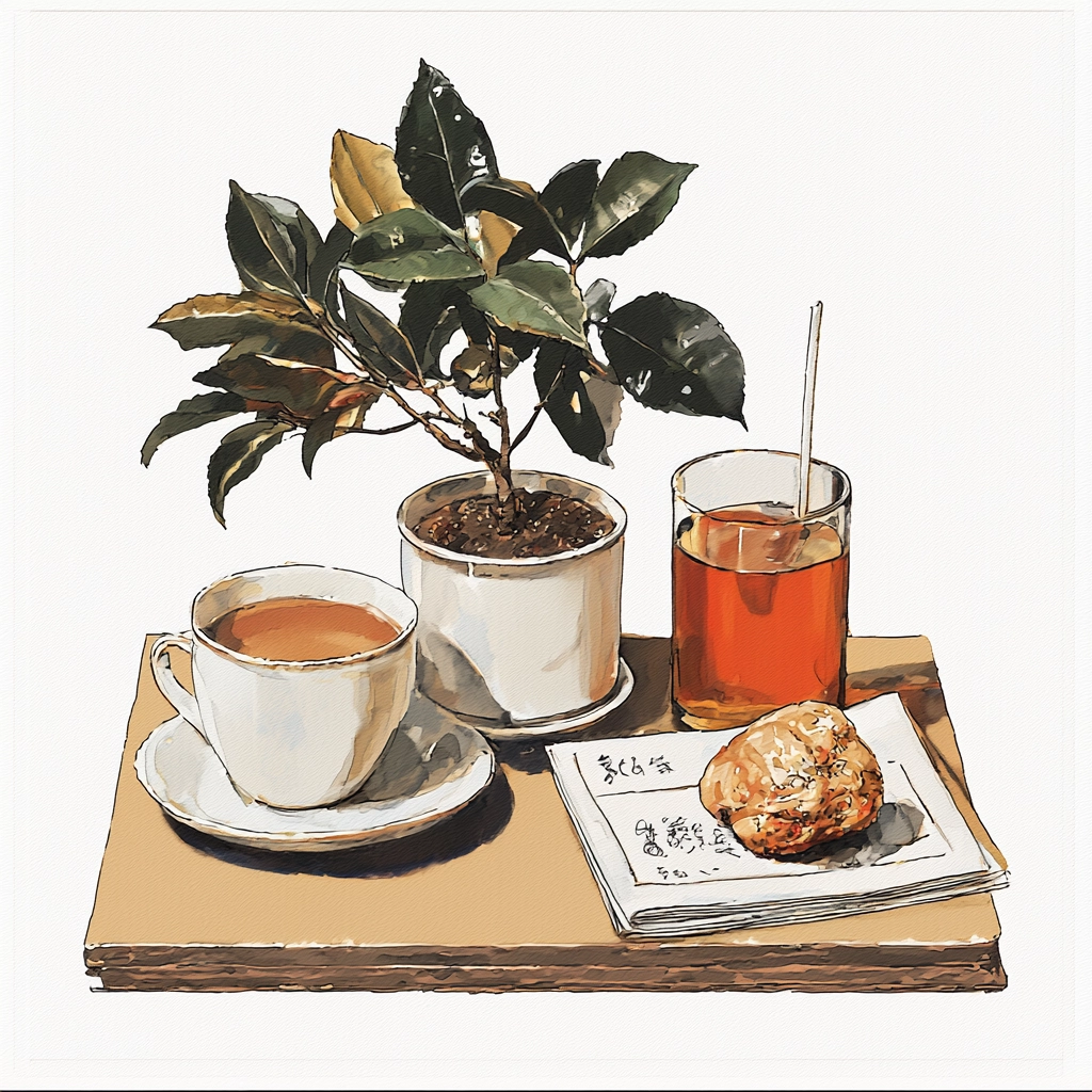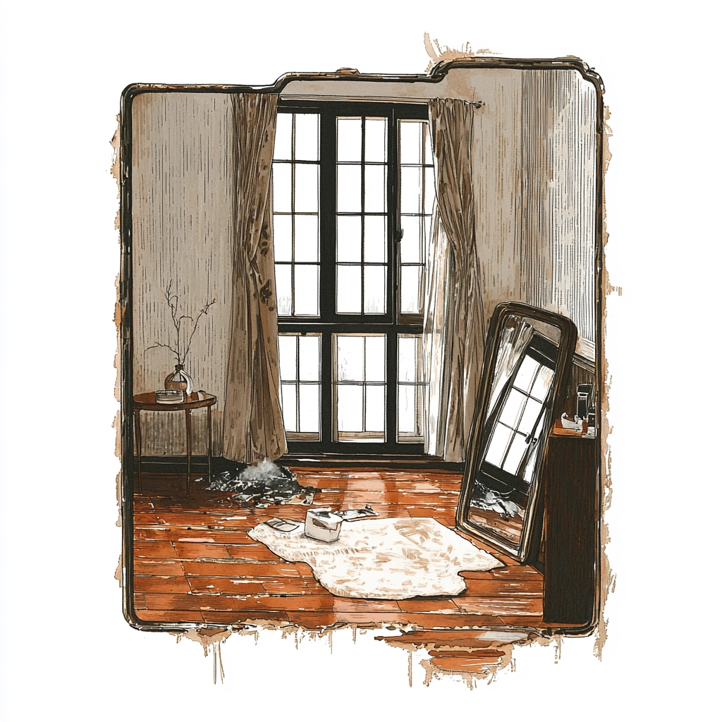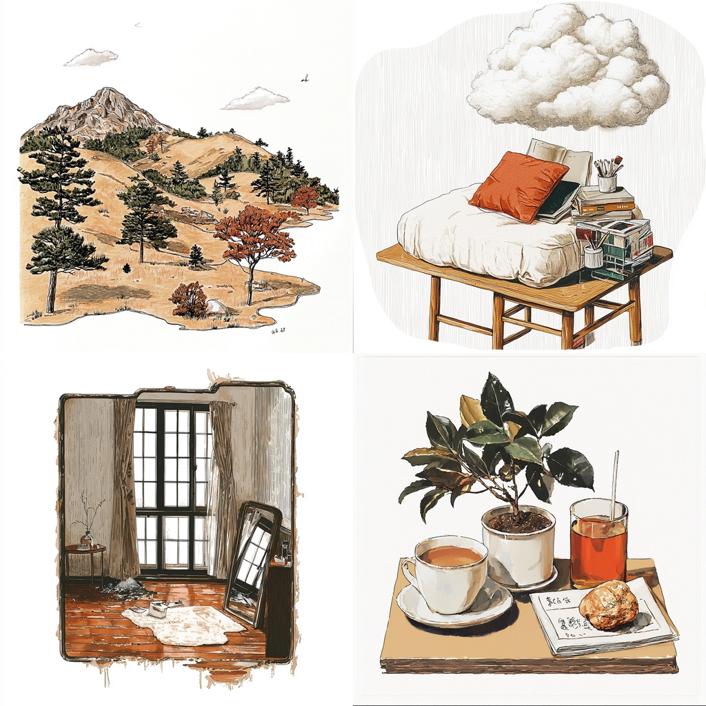 The lighting is gentle, creating a calm and inviting atmosphere. Colors are predominantly earthy tones with a mix of beige, green, and brown, providing a natural, warm palette. There is a strong sense of space, with thoughtfully rendered textures bringing depth to the scenes.
