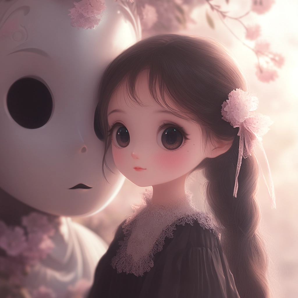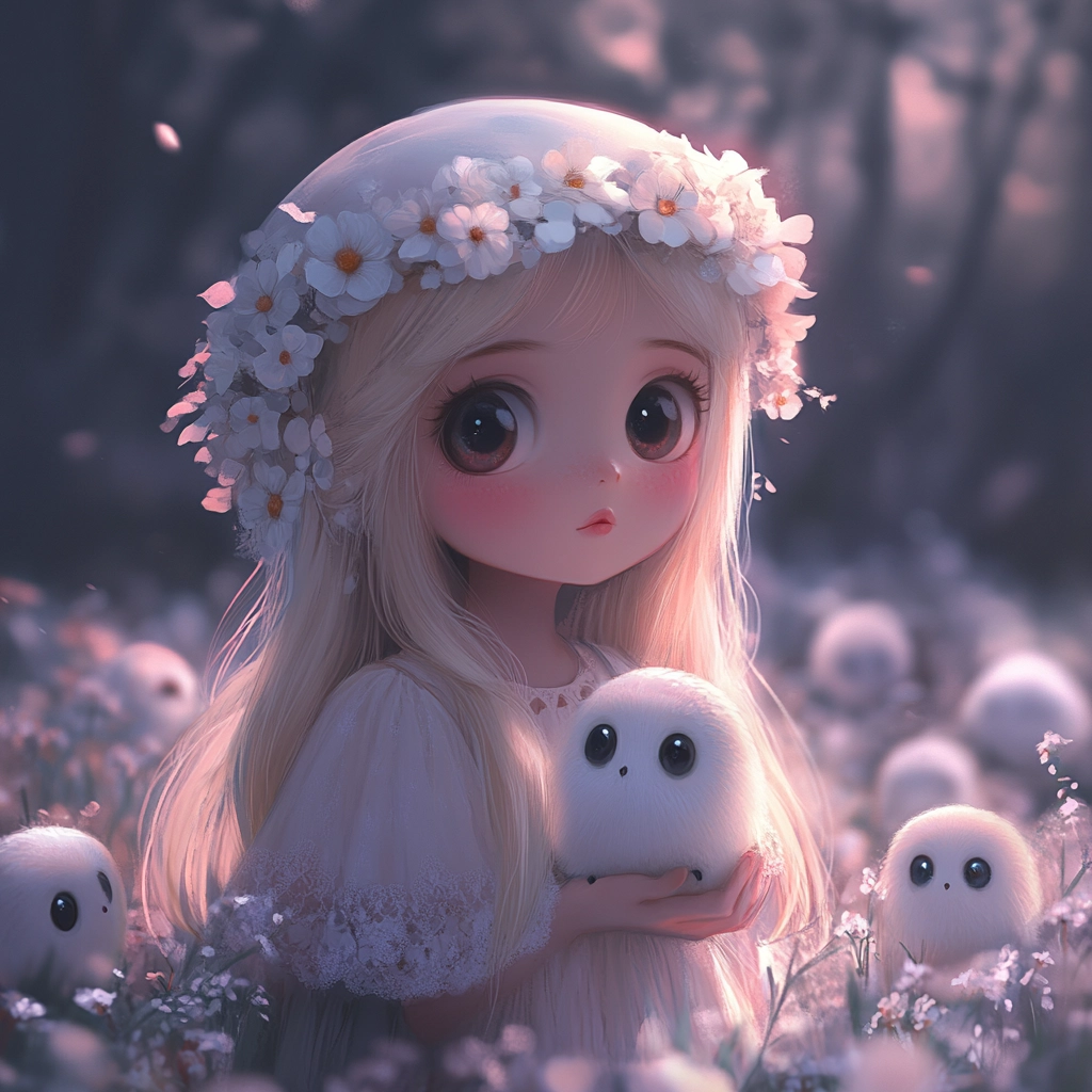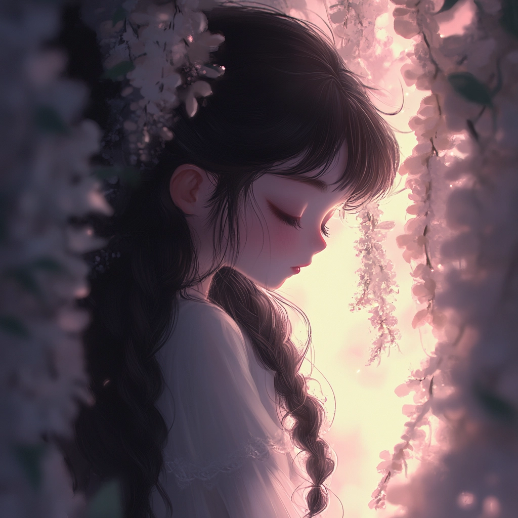 The composition employs soft lighting, pastel colors, and delicate floral elements.