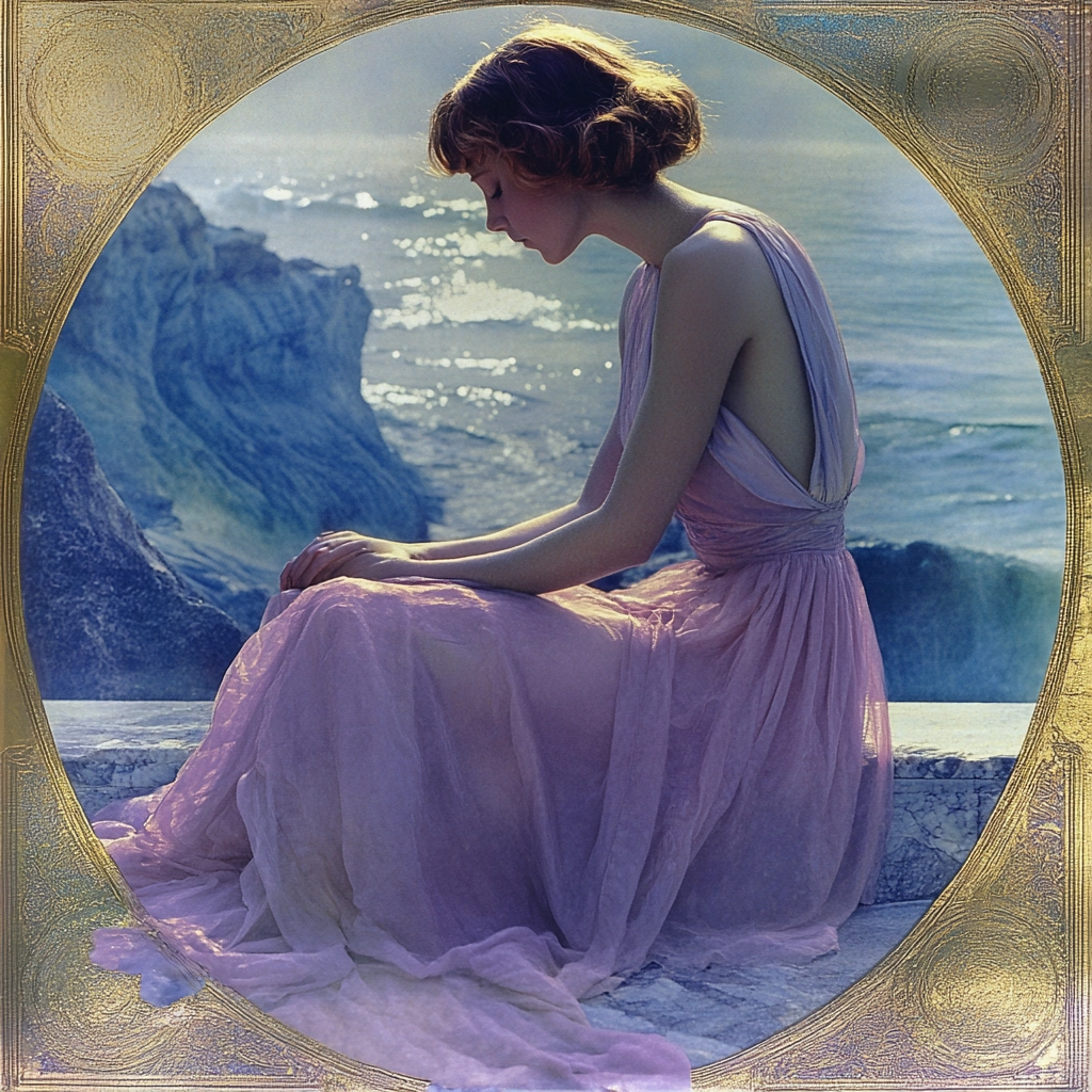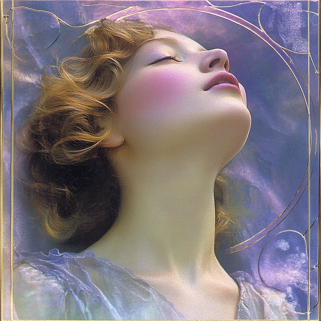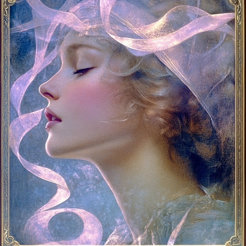 Lighting is diffused and soft, emphasizing smooth tonal transitions and gentle highlights on facial contours and fabric folds; colors lean toward muted purples and pinks with gold accents providing contrast; spatial composition balances close-up profile forms with distant scenic elements; textures are smooth, with delicate layering suggesting translucence and fabric weight without harsh edges.