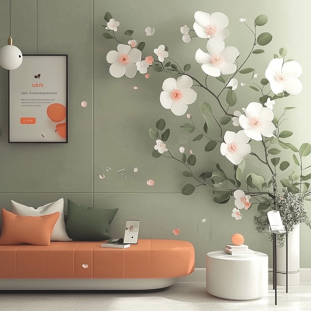Soft, diffused lighting effects enhance the minimal use of color, creating a serene spatial balance. The textures are smooth and the overall design is cohesive, capturing attention with strategic color placement.