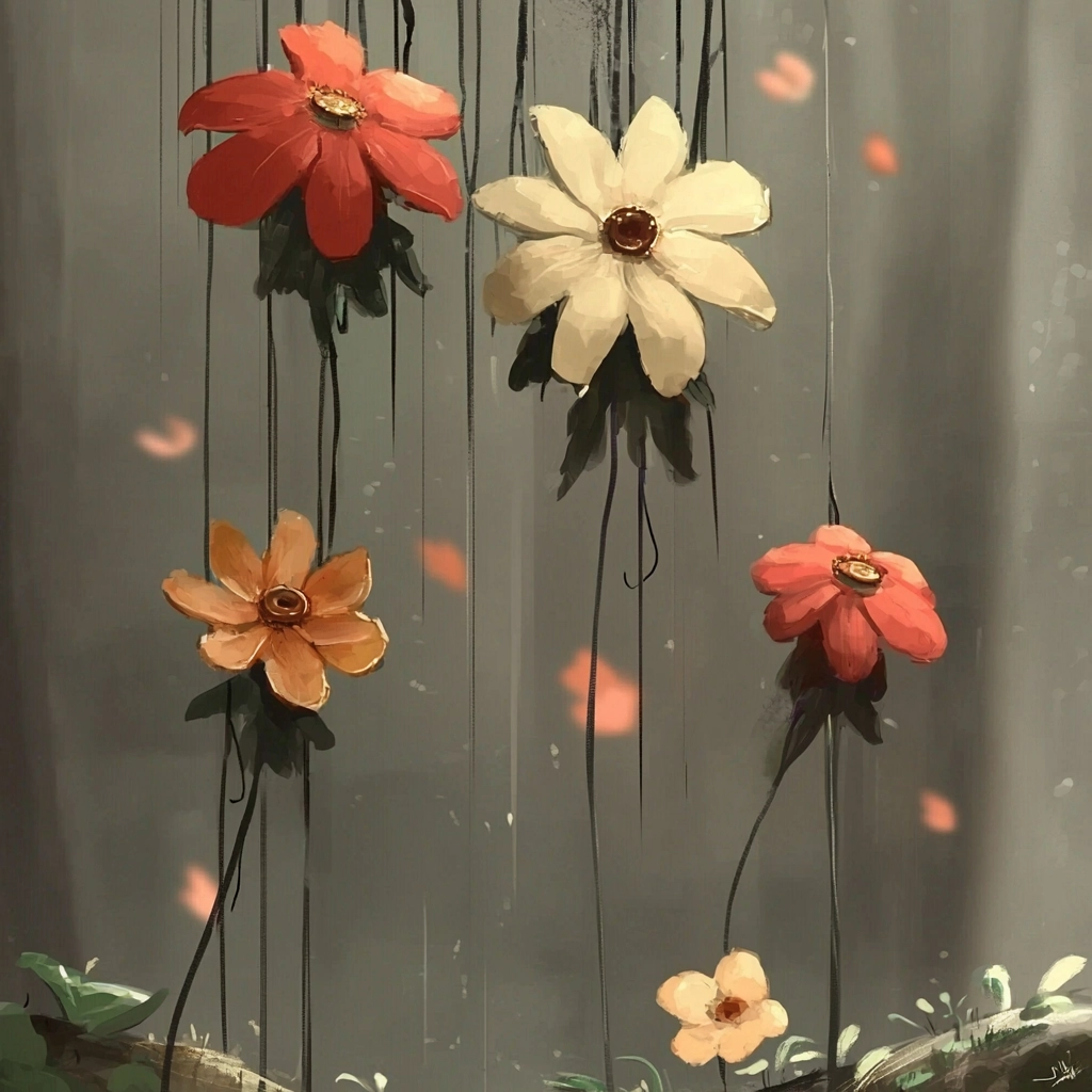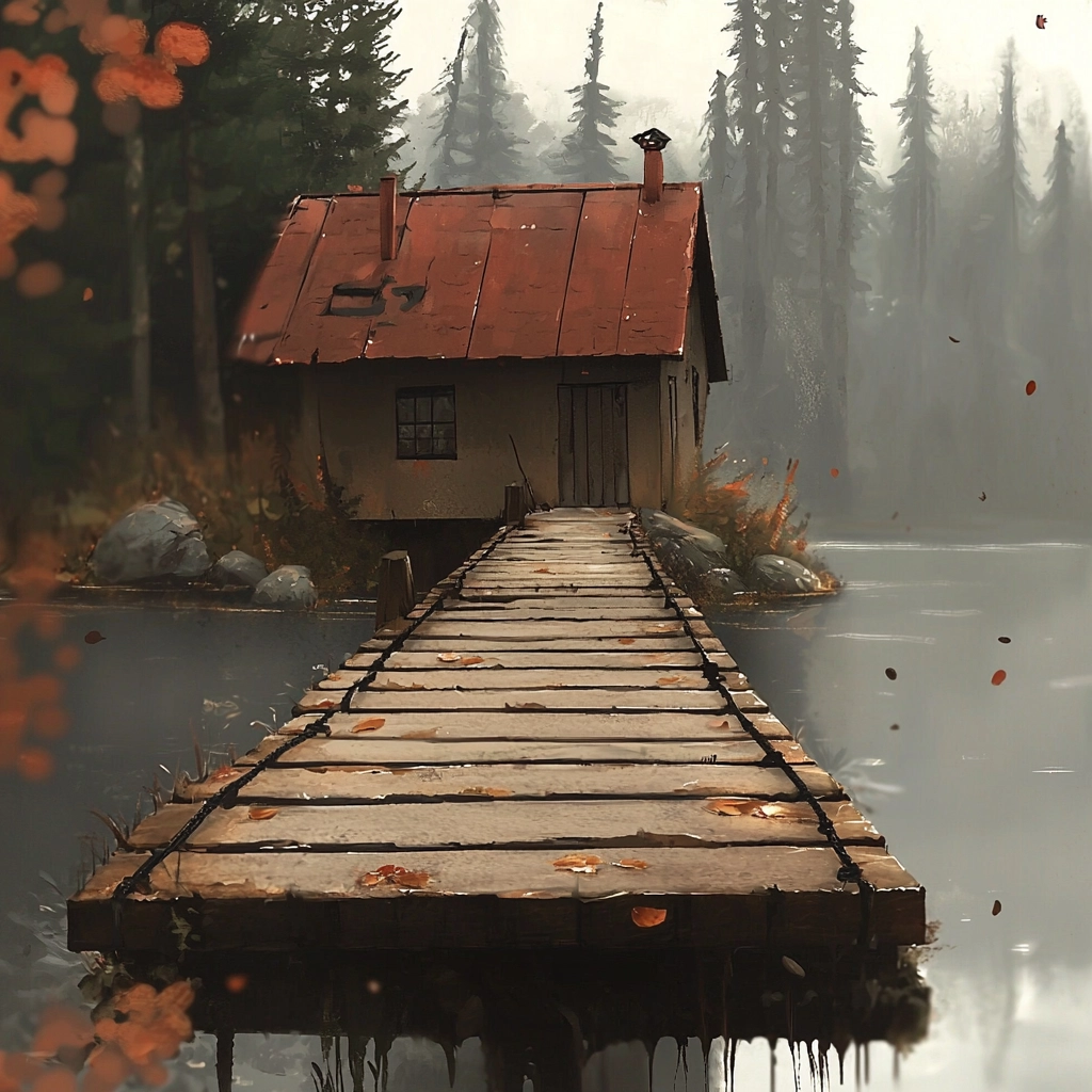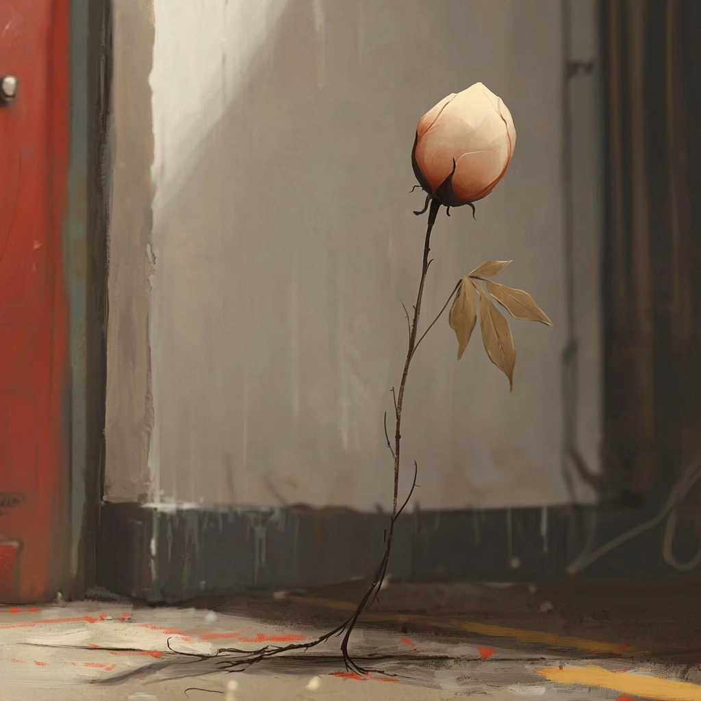 The soft natural lighting gently illuminates while emphasizing a subtle contrast between elements. Rich brown and green hues dominate, with touches of red adding depth. The texture is smooth yet distinct, with a sense of calm spatial arrangement.