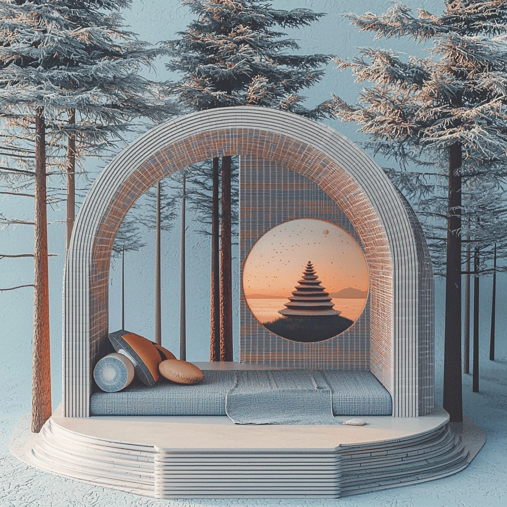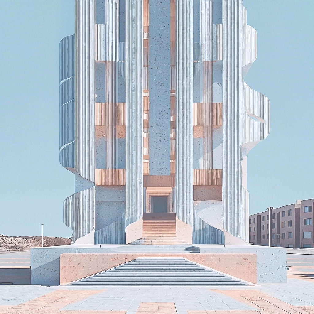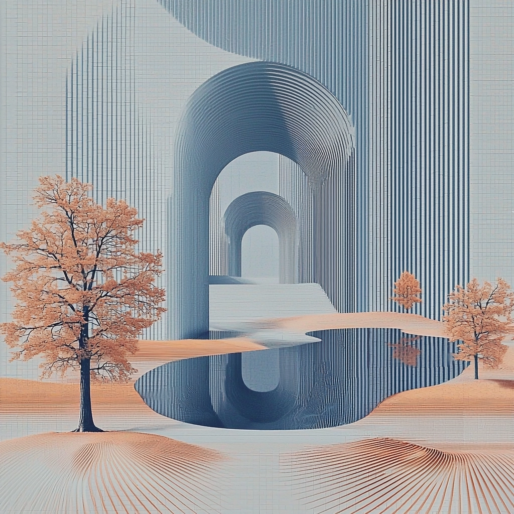The composition uses pastel lighting to enhance the subtle interaction of cyan and beige, creating a sense of depth through geometric structures. The texture appears smooth, with lines enhancing spatial perception.