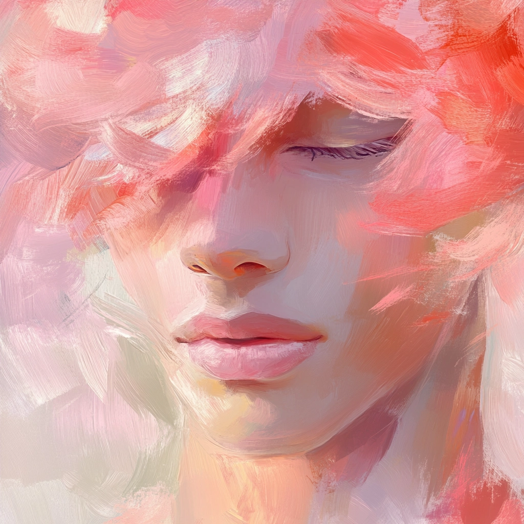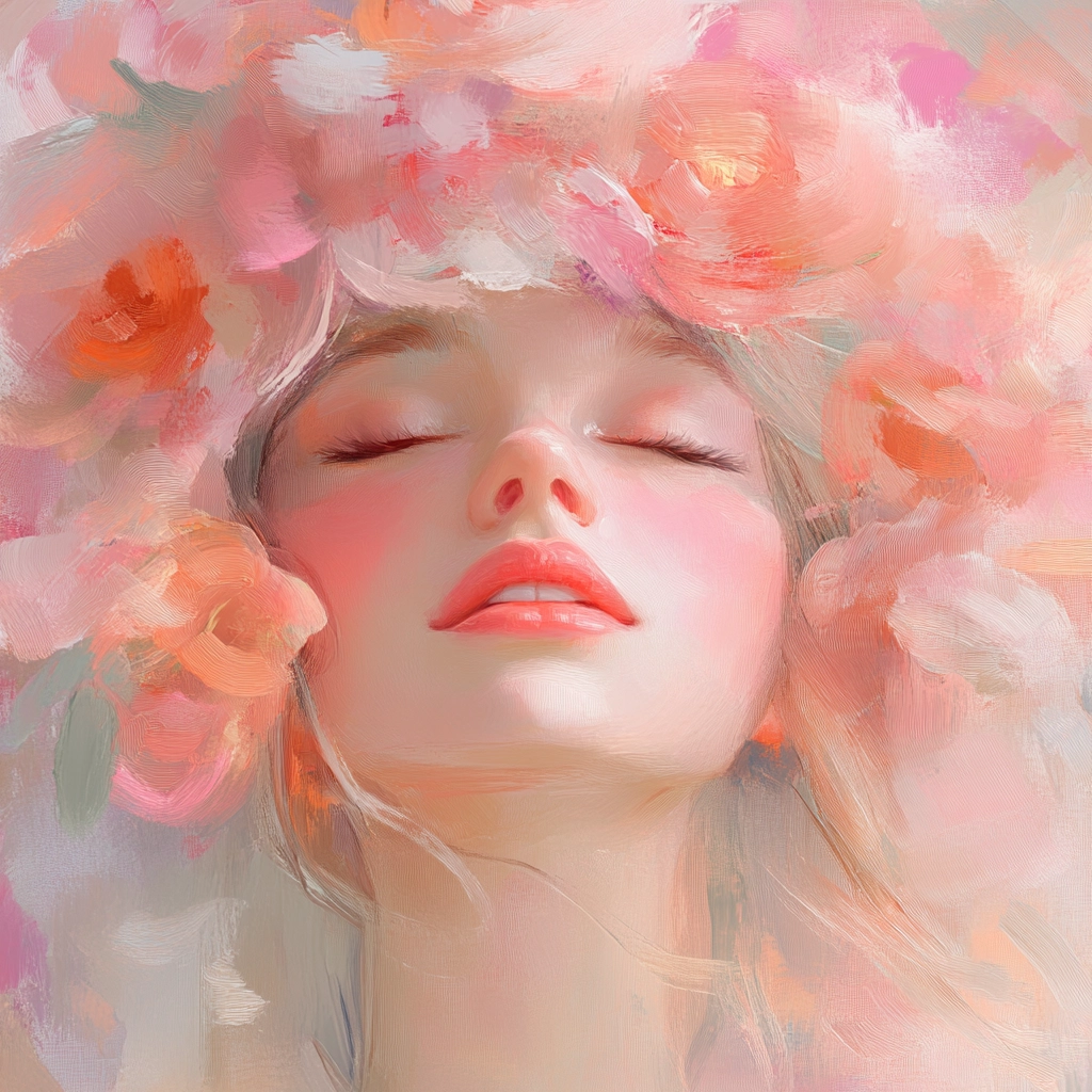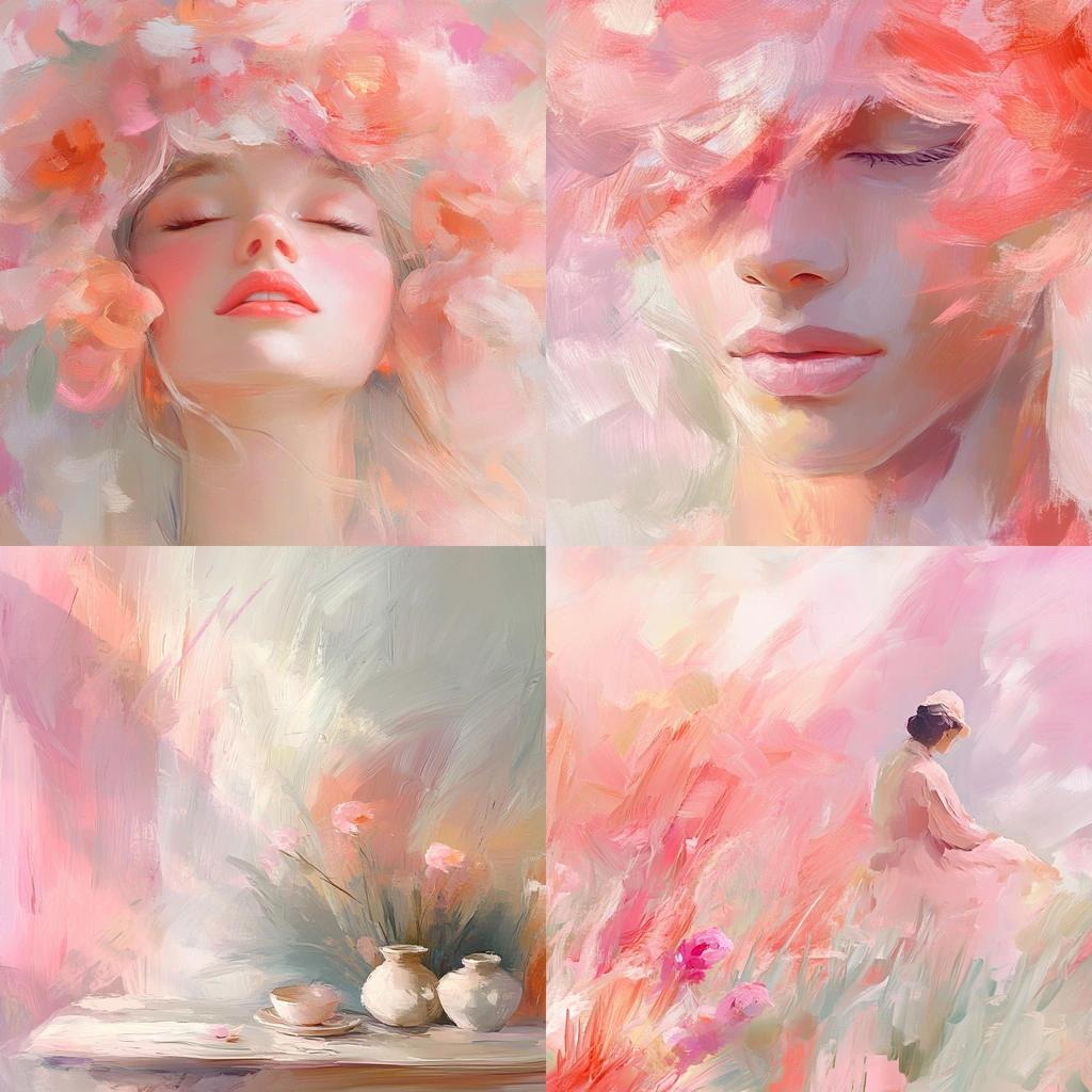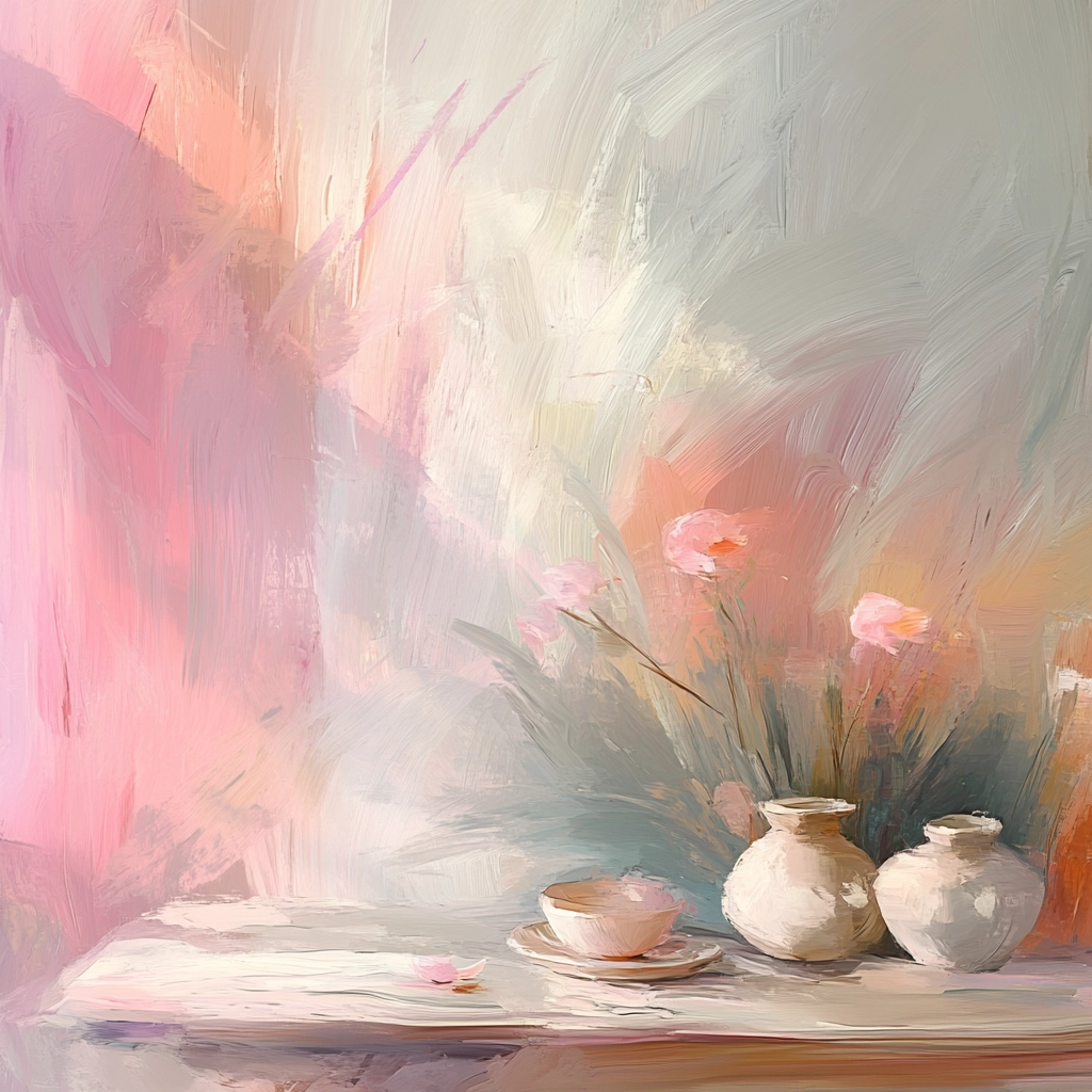 Soft lighting enhances the pastel color palette, creating a dreamy atmosphere. The brushwork is fluid and impressionistic, blending colors seamlessly to evoke a soft, ethereal quality. Texture is subtle, focusing on smooth transitions and delicate variations.