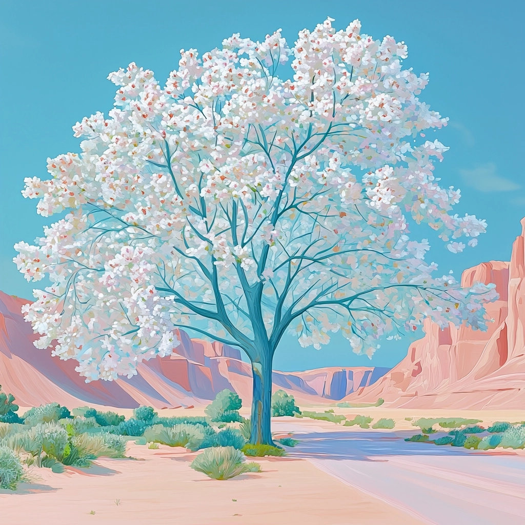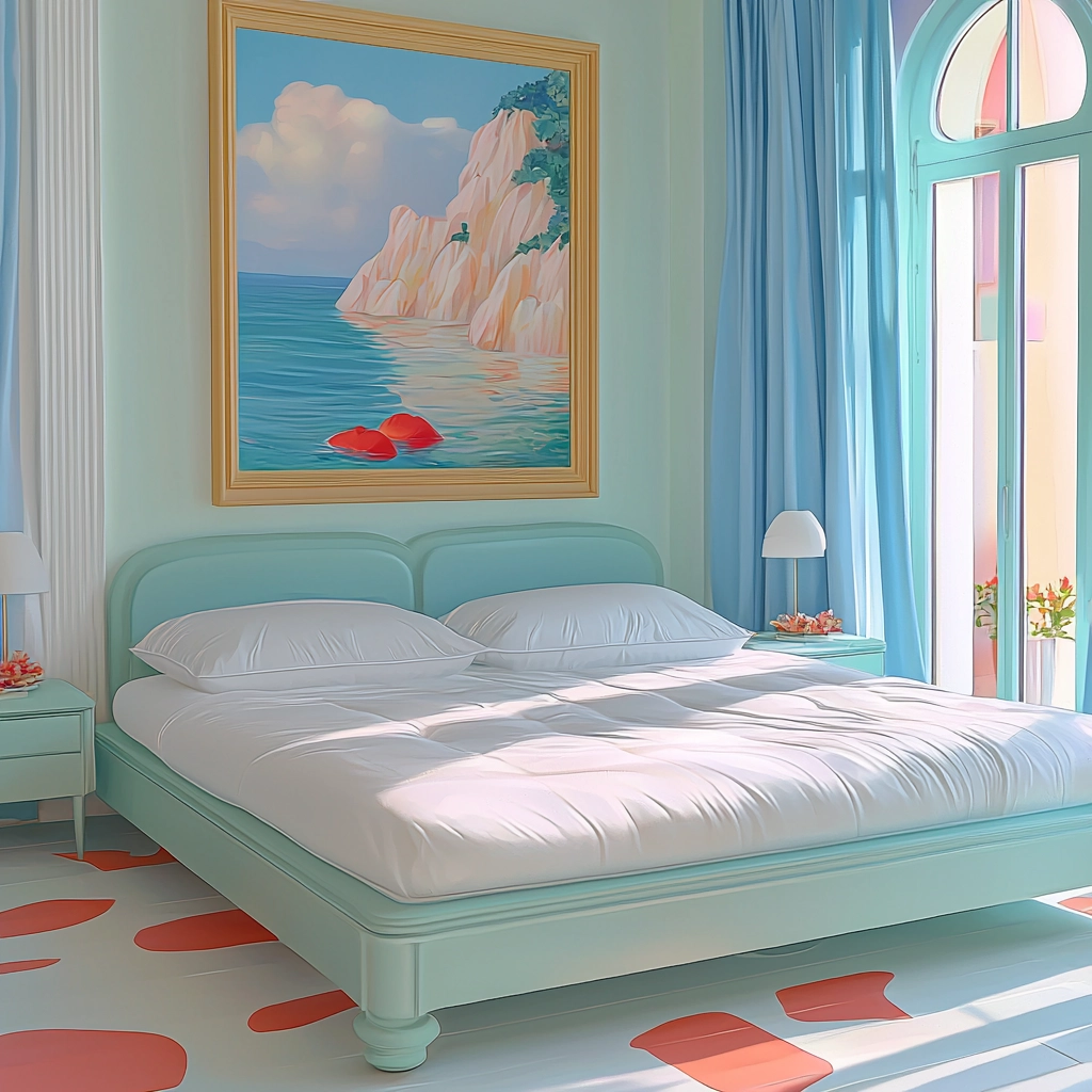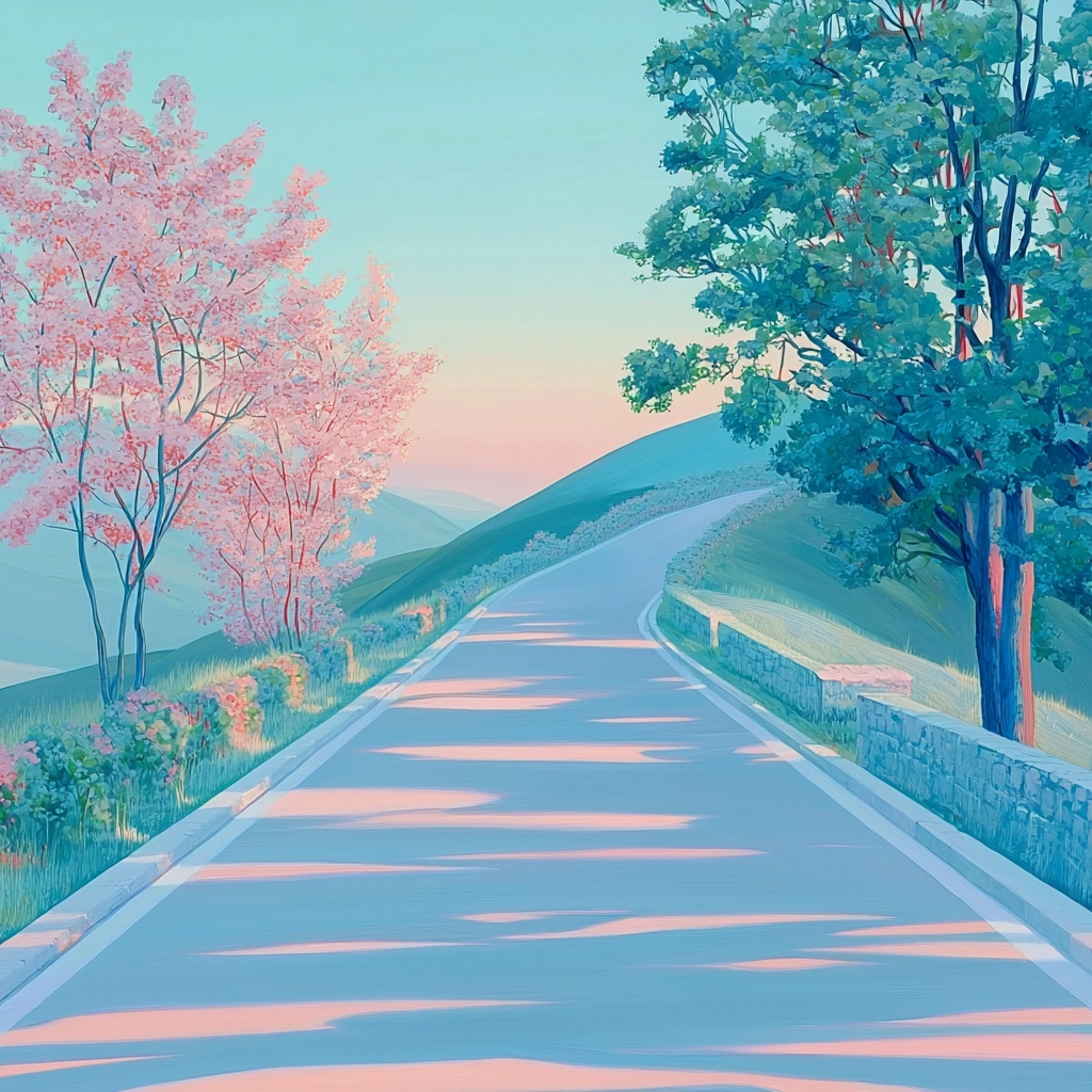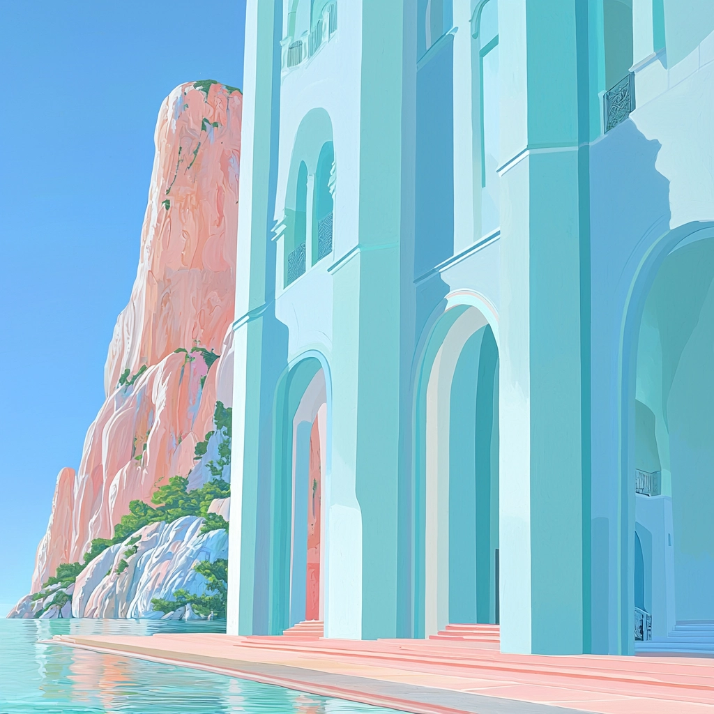 Use of soft pastel blues and pinks creates a cohesive space with smooth gradients and diffuse lighting, blending natural landscapes and architectural forms into balanced, clear compositions.