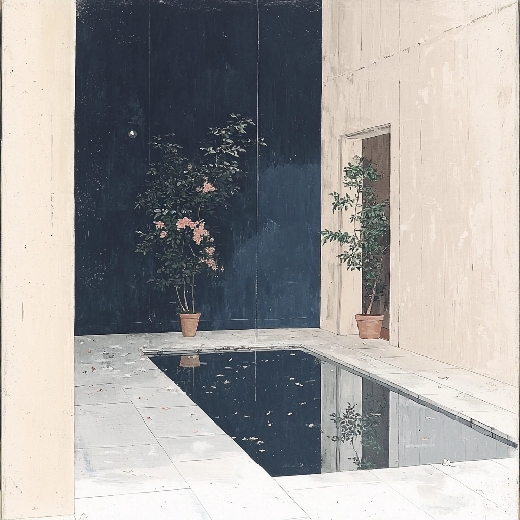 The lighting is soft, balancing between highlights and shadows to enhance depth, while the pastel colors are muted yet distinct. Textures are smooth, creating an uncluttered spatial feeling combined with minimalistic design elements that emphasize the contrast between light and dark.
