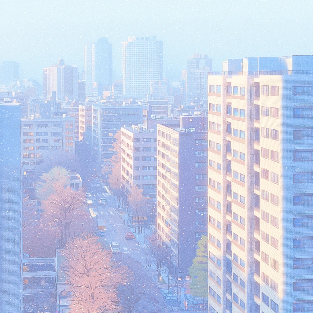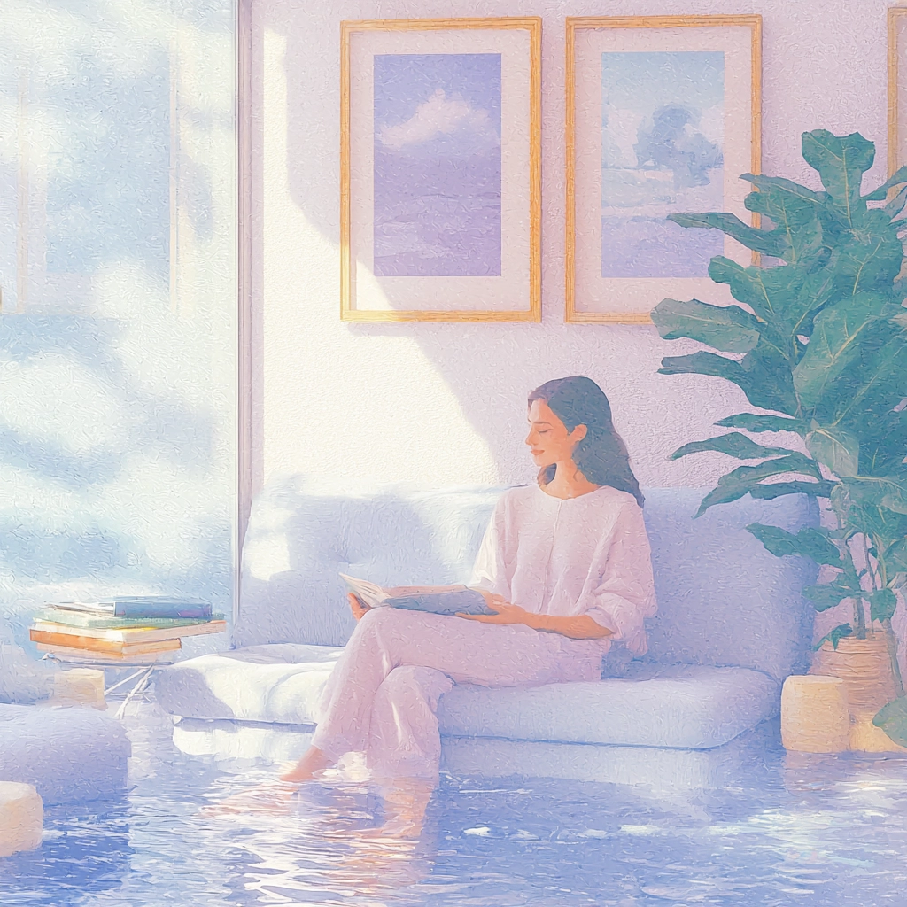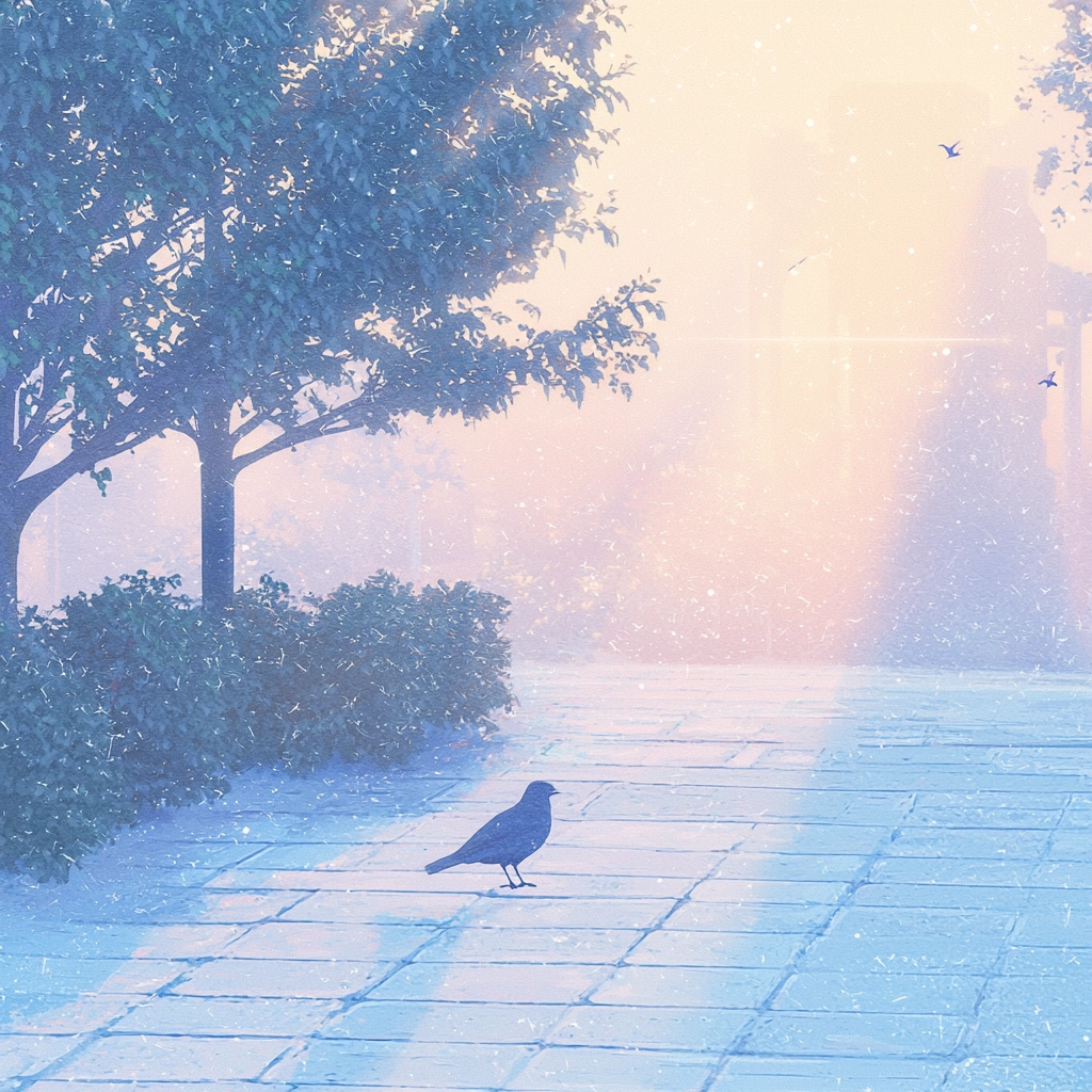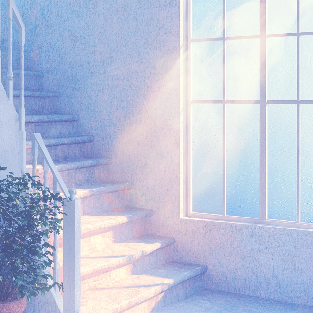 A blend of gentle pastel hues with an emphasis on light and shadow interplay creates a serene yet dynamic visual.