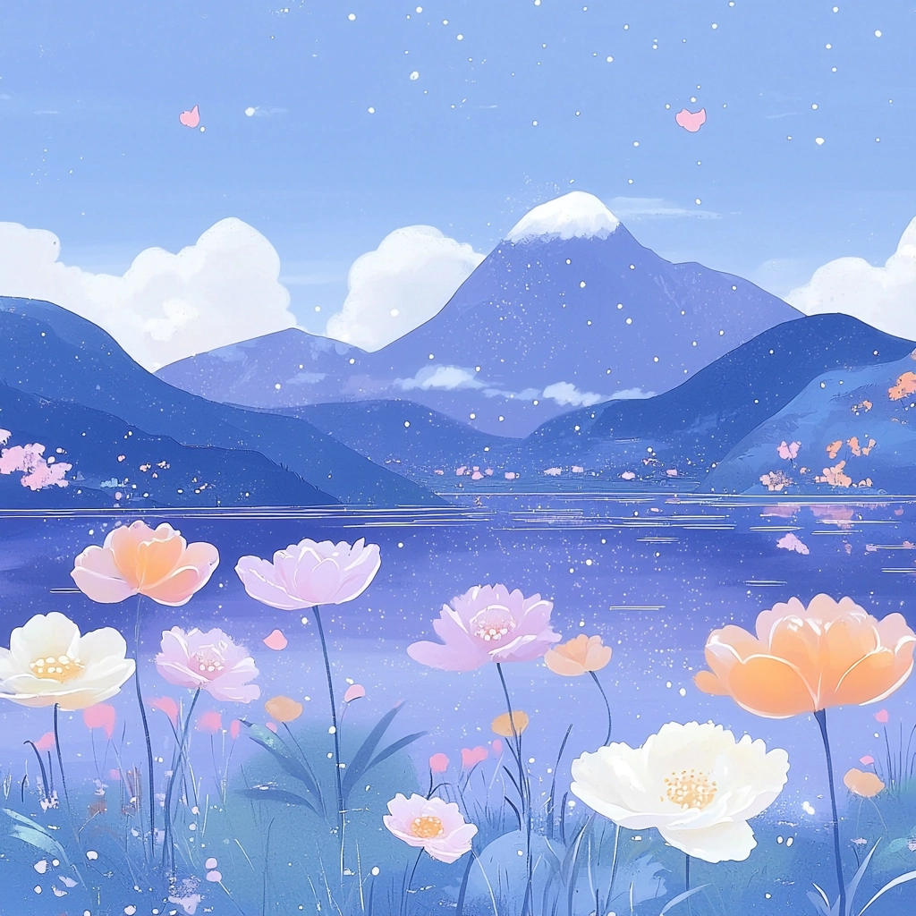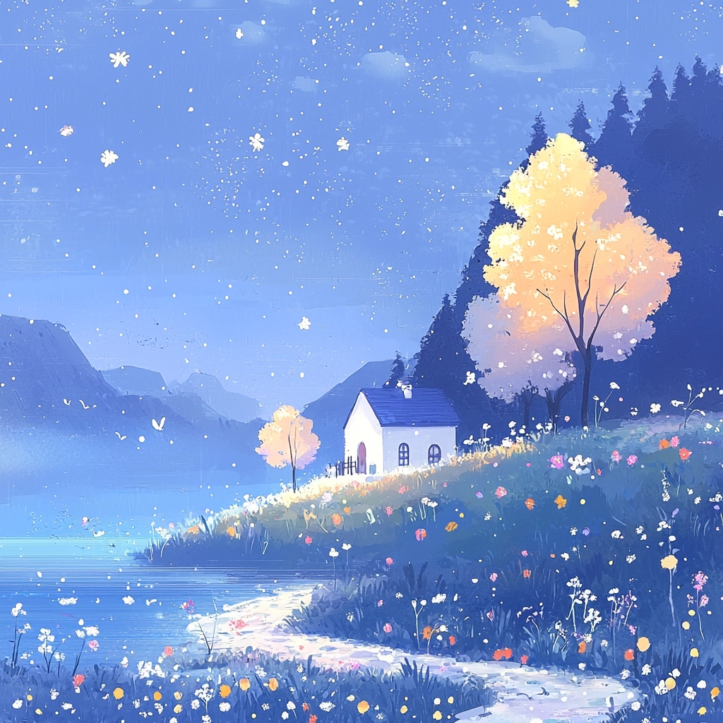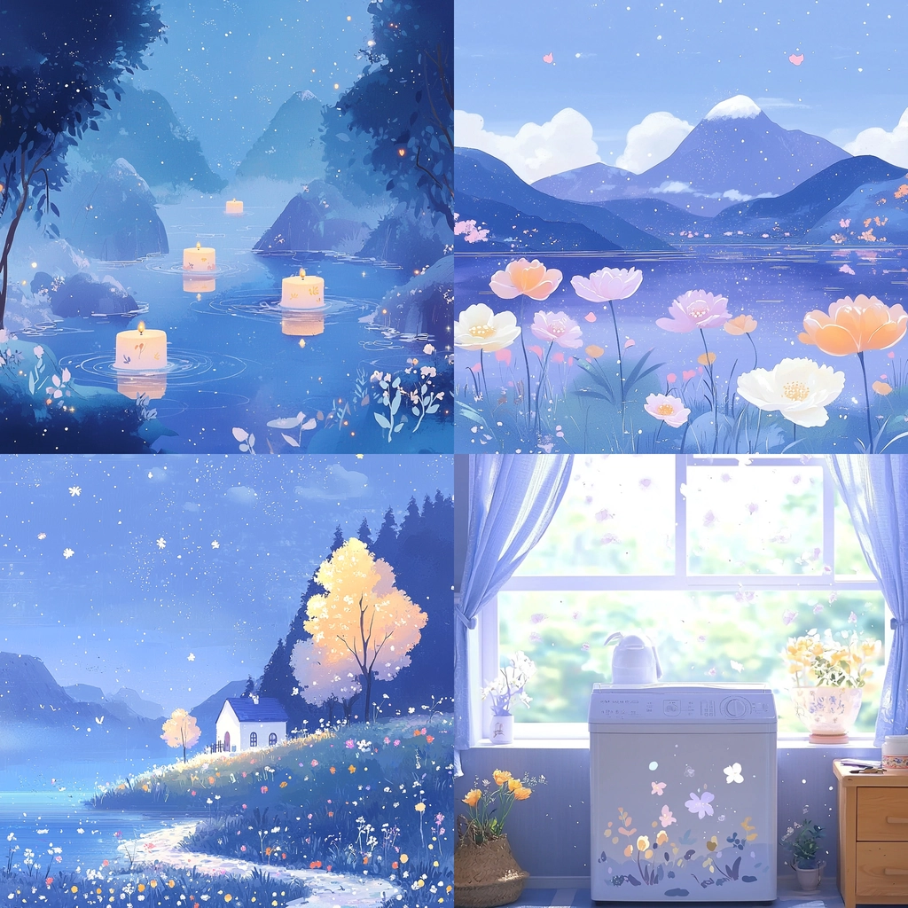 The lighting effects are gentle and diffused, creating a serene ambiance. The colors are primarily light pastels with subtle gradients, giving a sense of depth and tranquility. The textures are smooth and soft, enhancing the gentle mood conveyed. The spatial arrangement is spacious and balanced, allowing each element to breathe and complement each other seamlessly.