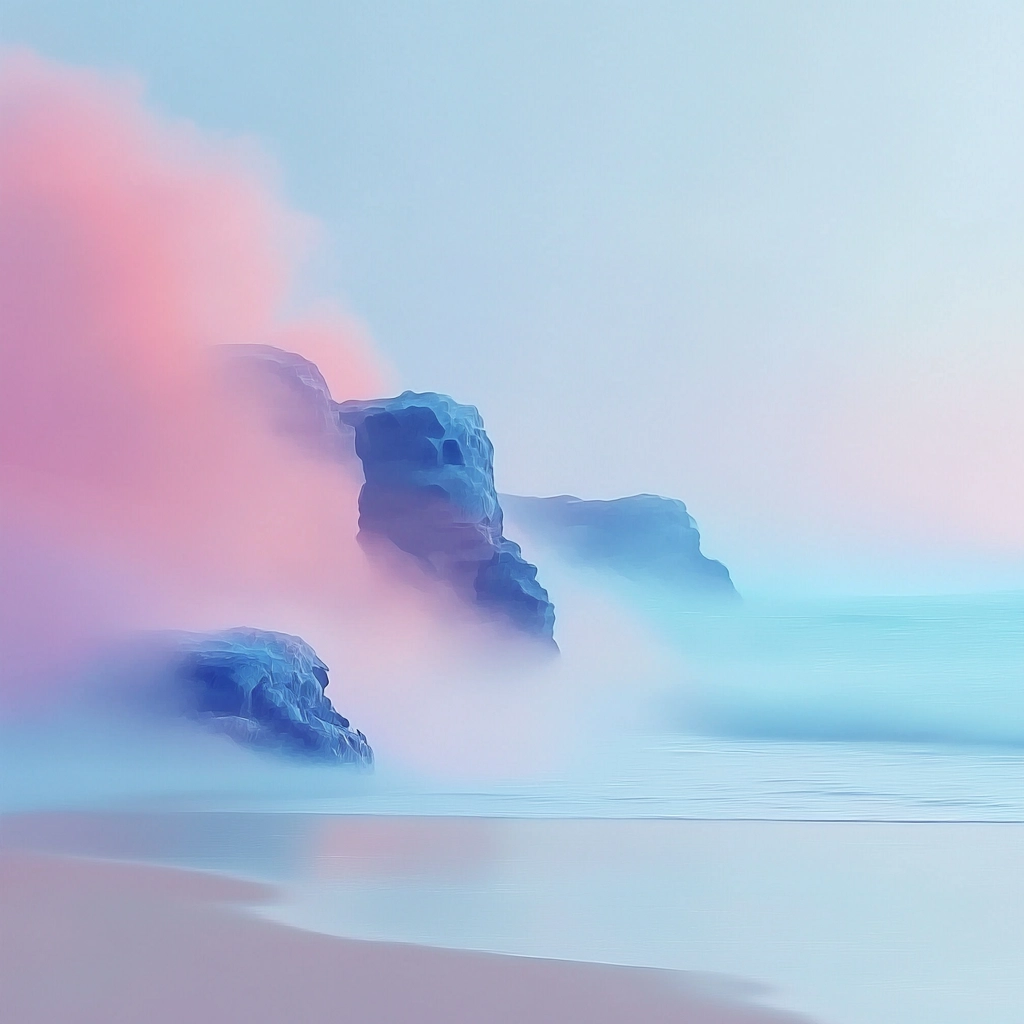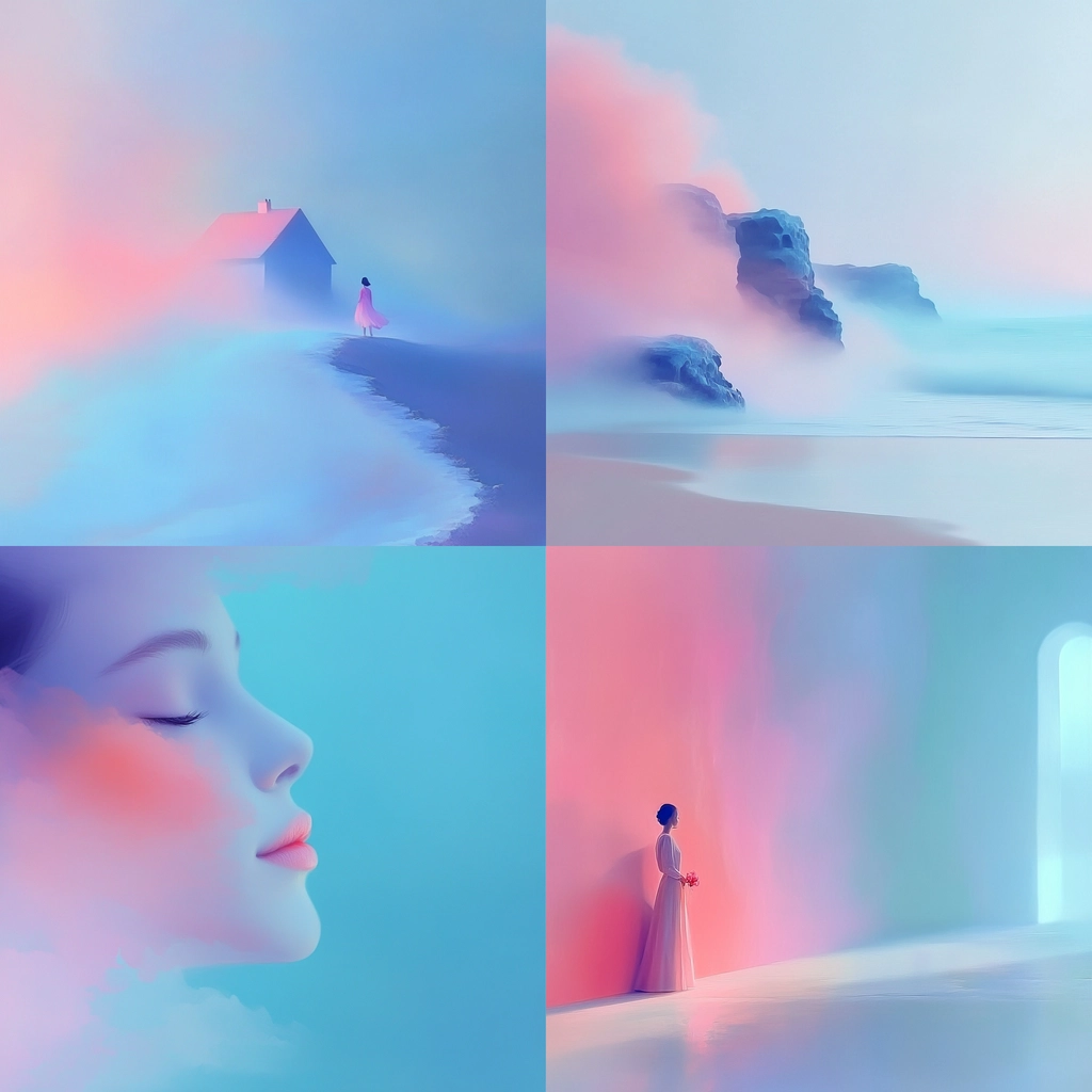 The diffused lighting and gentle gradient transitions enhance the softness of each scene. The colors are muted yet vivid, creating a sense of depth and fluidity. Textures are smooth, evoking a sense of calm and serenity. Elements blend harmoniously, with spatial elements carefully placed to guide the eye through the composition.