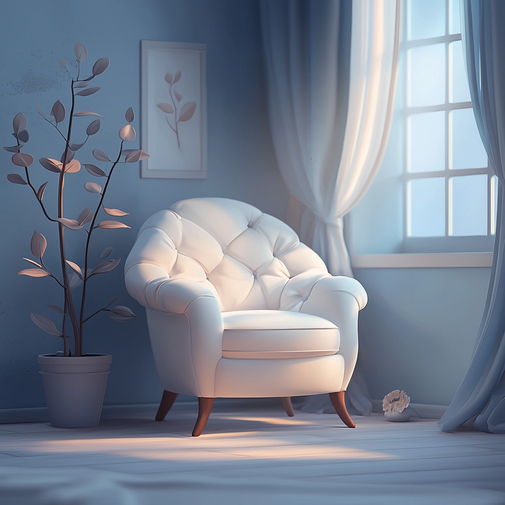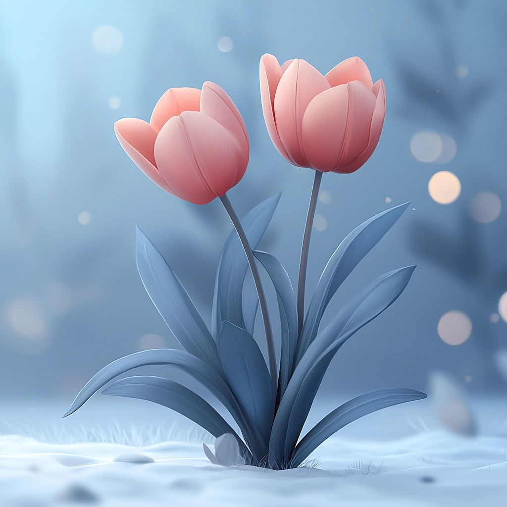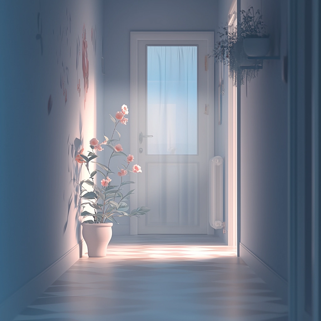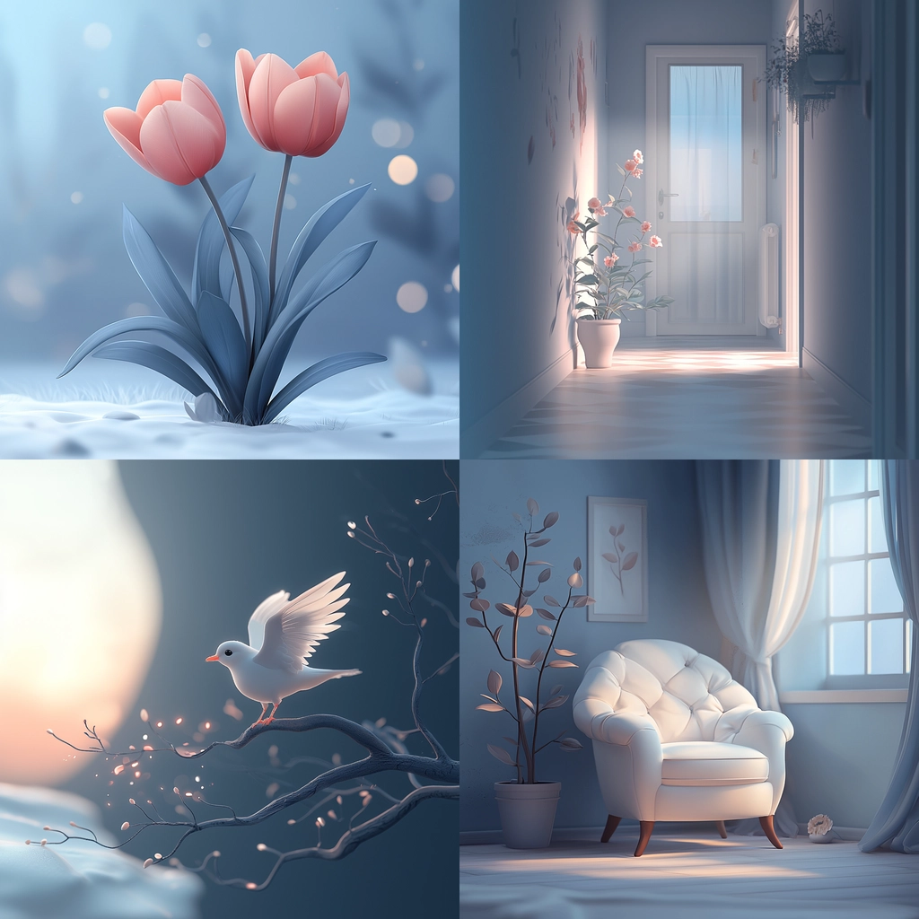 Subtle lighting emphasizes delicate colors and creates a spacious feel with implied depth. Textures are smooth and blurred, reinforcing a soft touch approach. The overall impression is cohesive yet understated, focusing on interaction between light and hue.