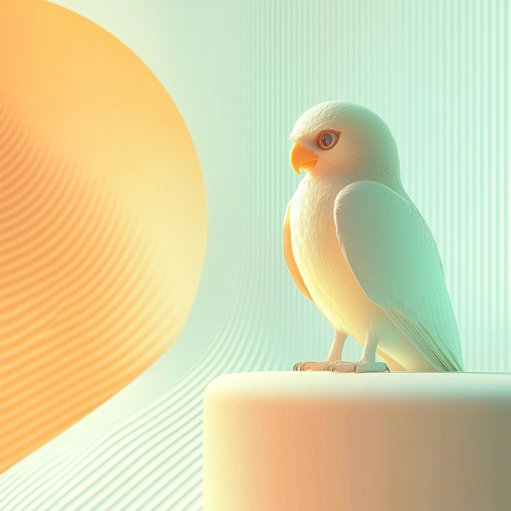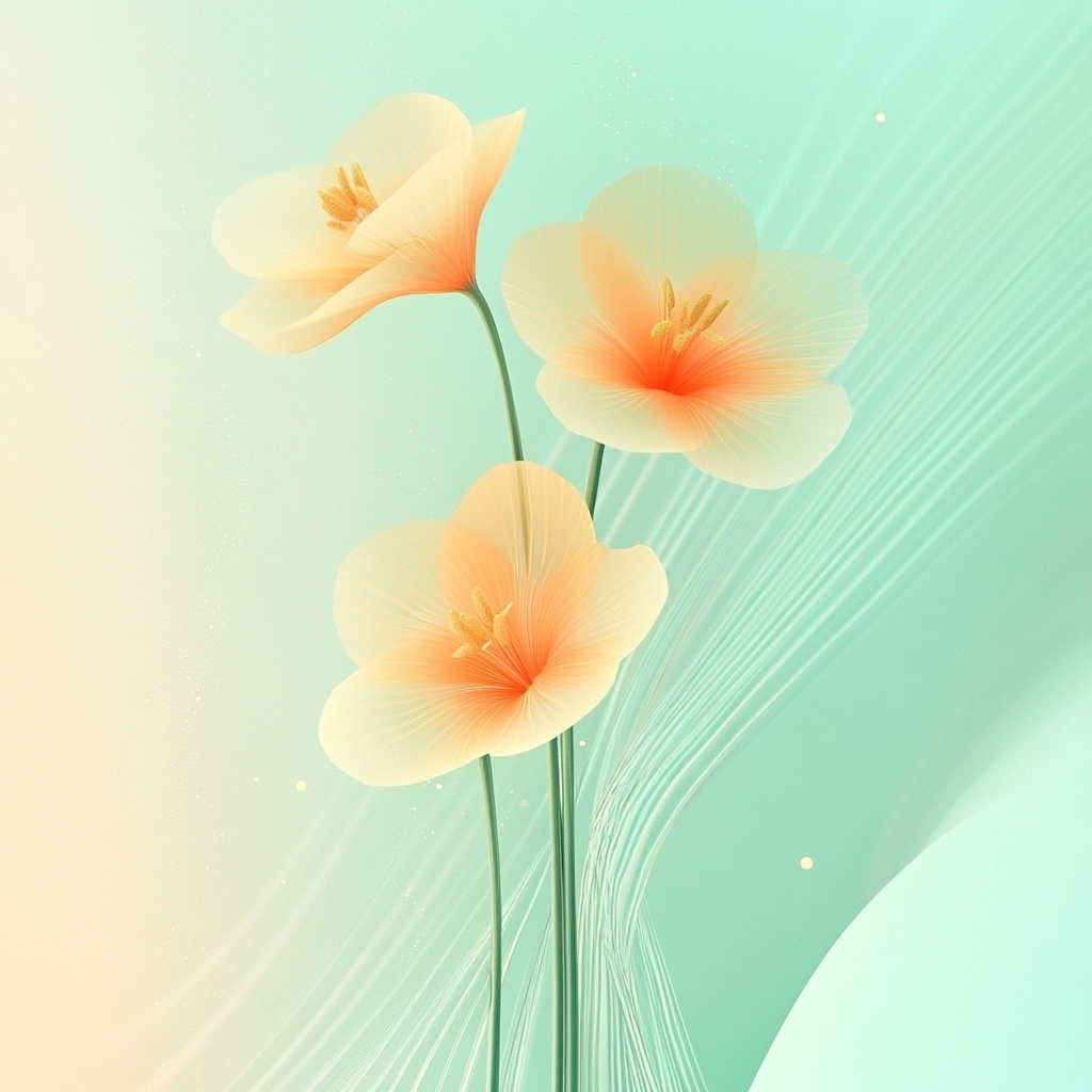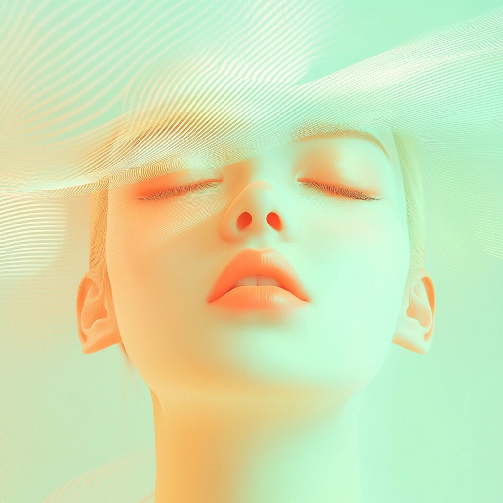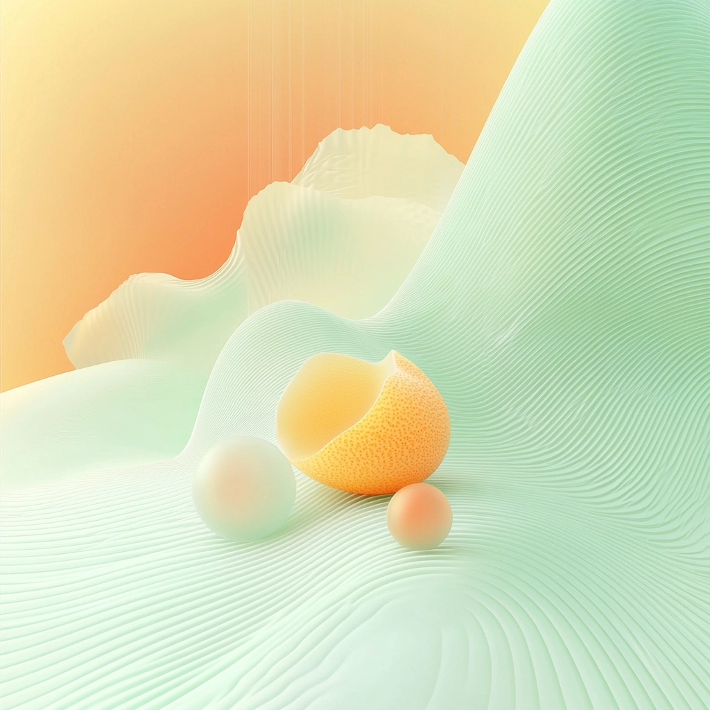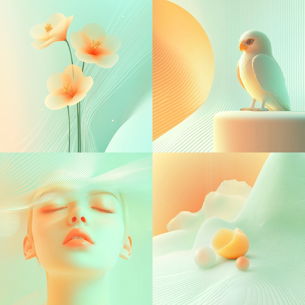 The artwork uses diffused lighting to create a sense of gentle illumination. Colors are pastel at their core, mainly featuring mint green and peach orange, blended seamlessly. The space feels light and airy, with textures that mimic soft, flowing fabrics.