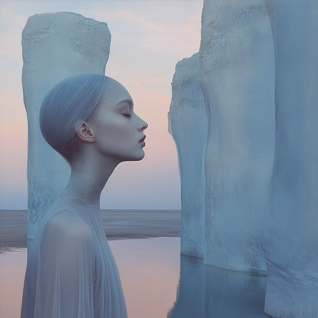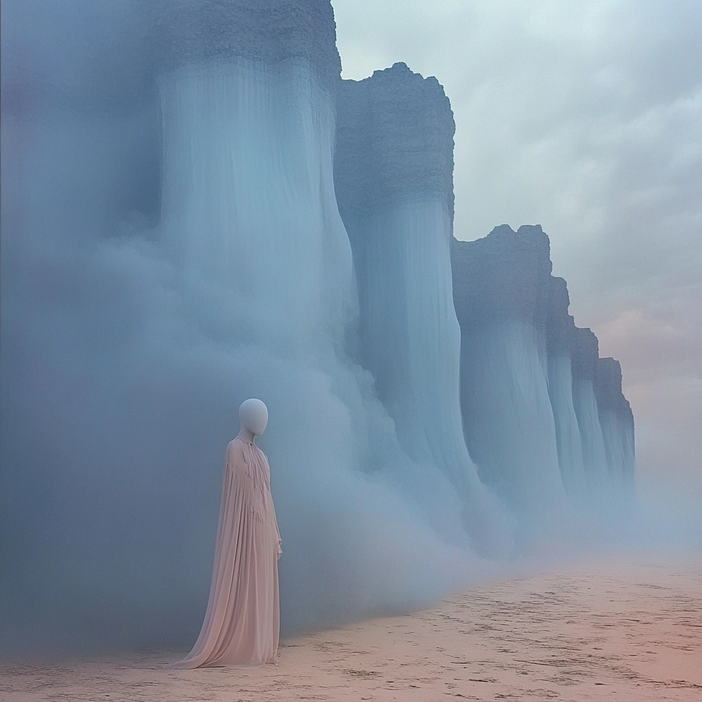 Soft, diffused lighting enhances pastel colors, creating a dream-like atmosphere with smooth transitions between elements. The spatial sense is expansive yet intimate, drawing attention to flowing textures and gentle contours.