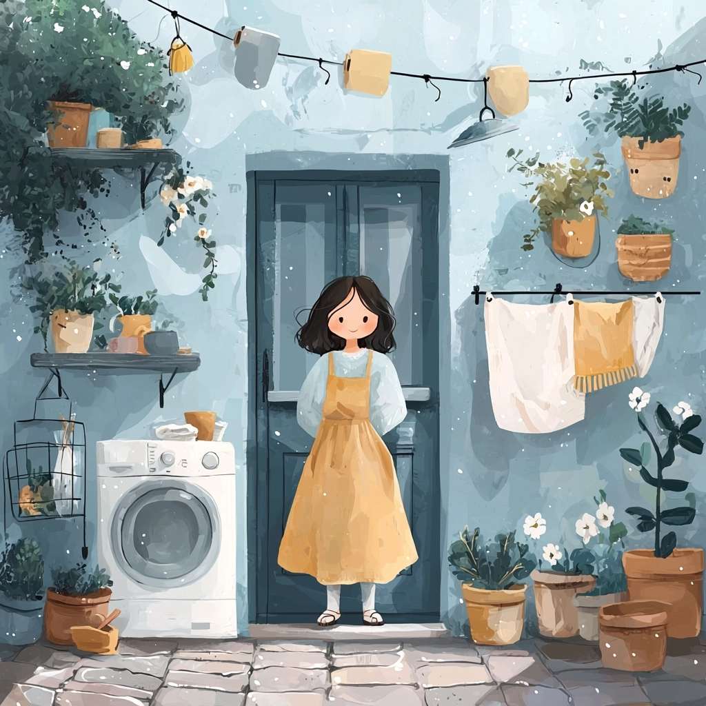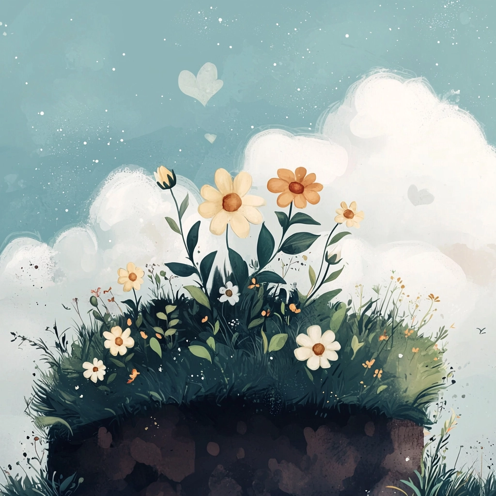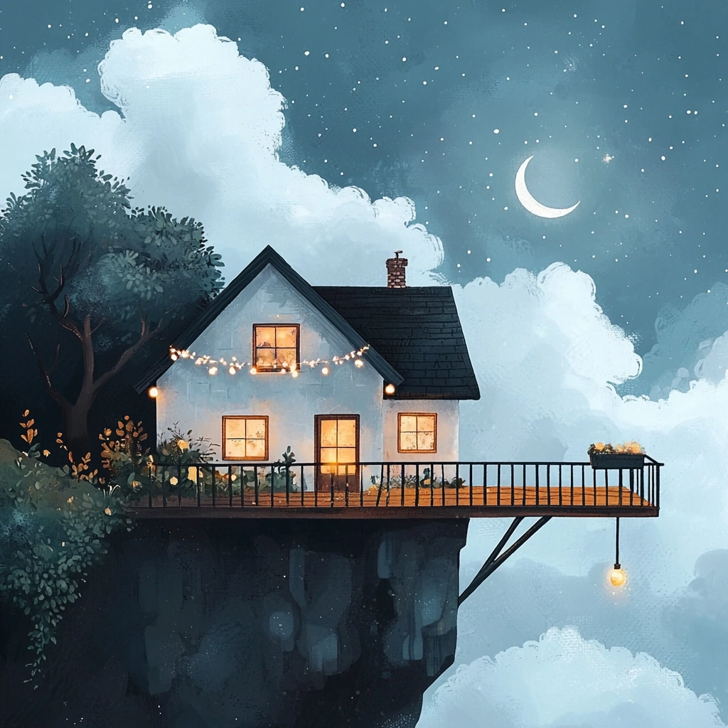 Diffuse lighting adds softness, creating a tranquil atmosphere. Pastel colors give a gentle warmth and highlight textural details. Spatial depth is suggested by layered elements and shadows.