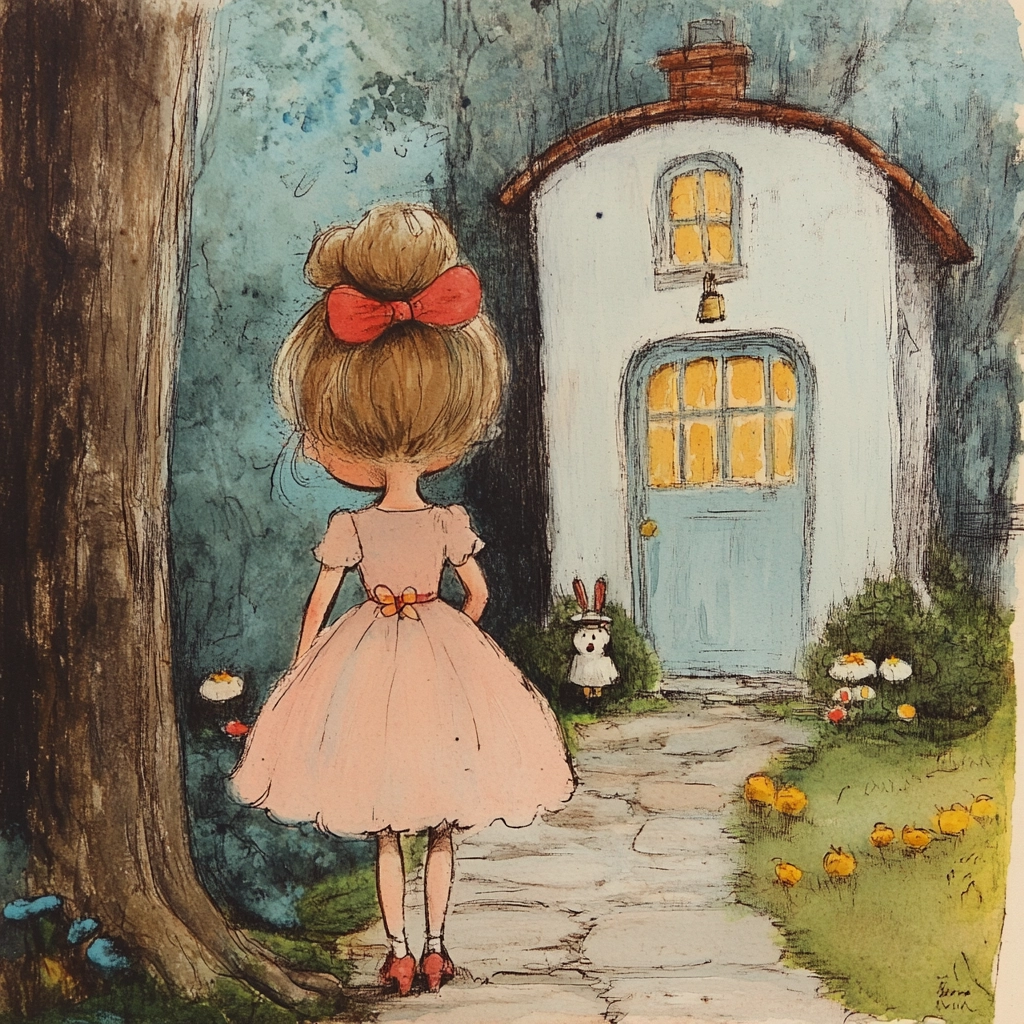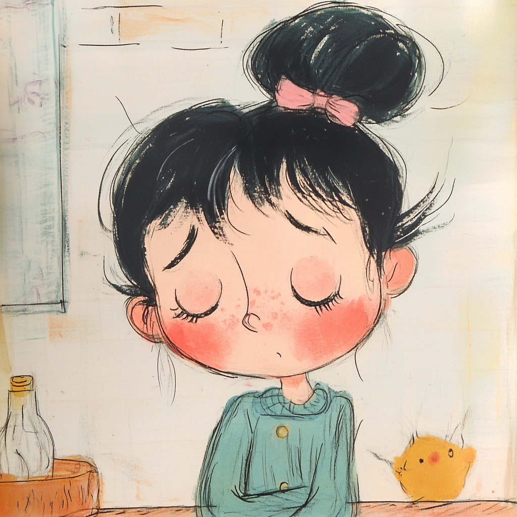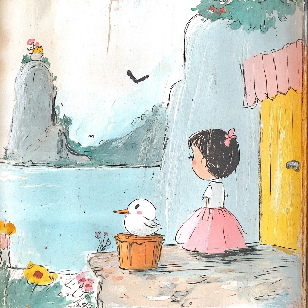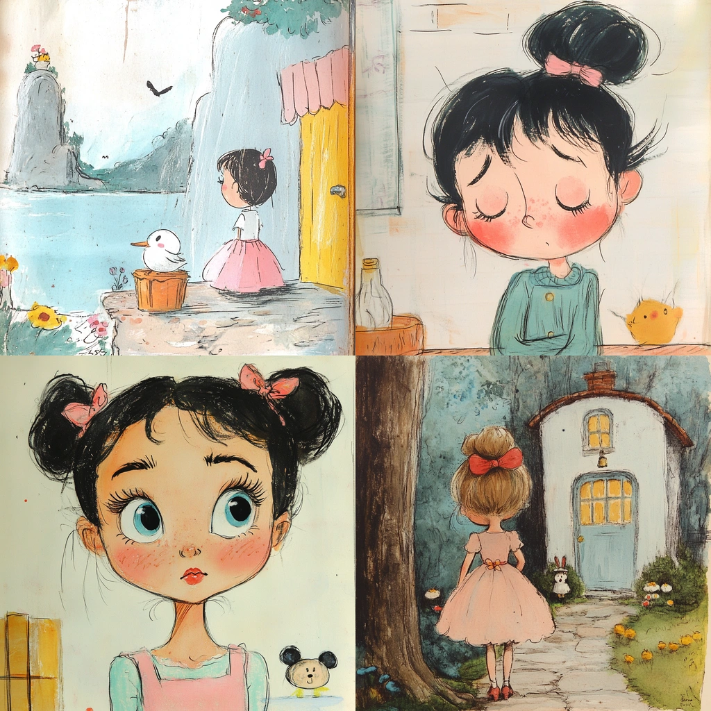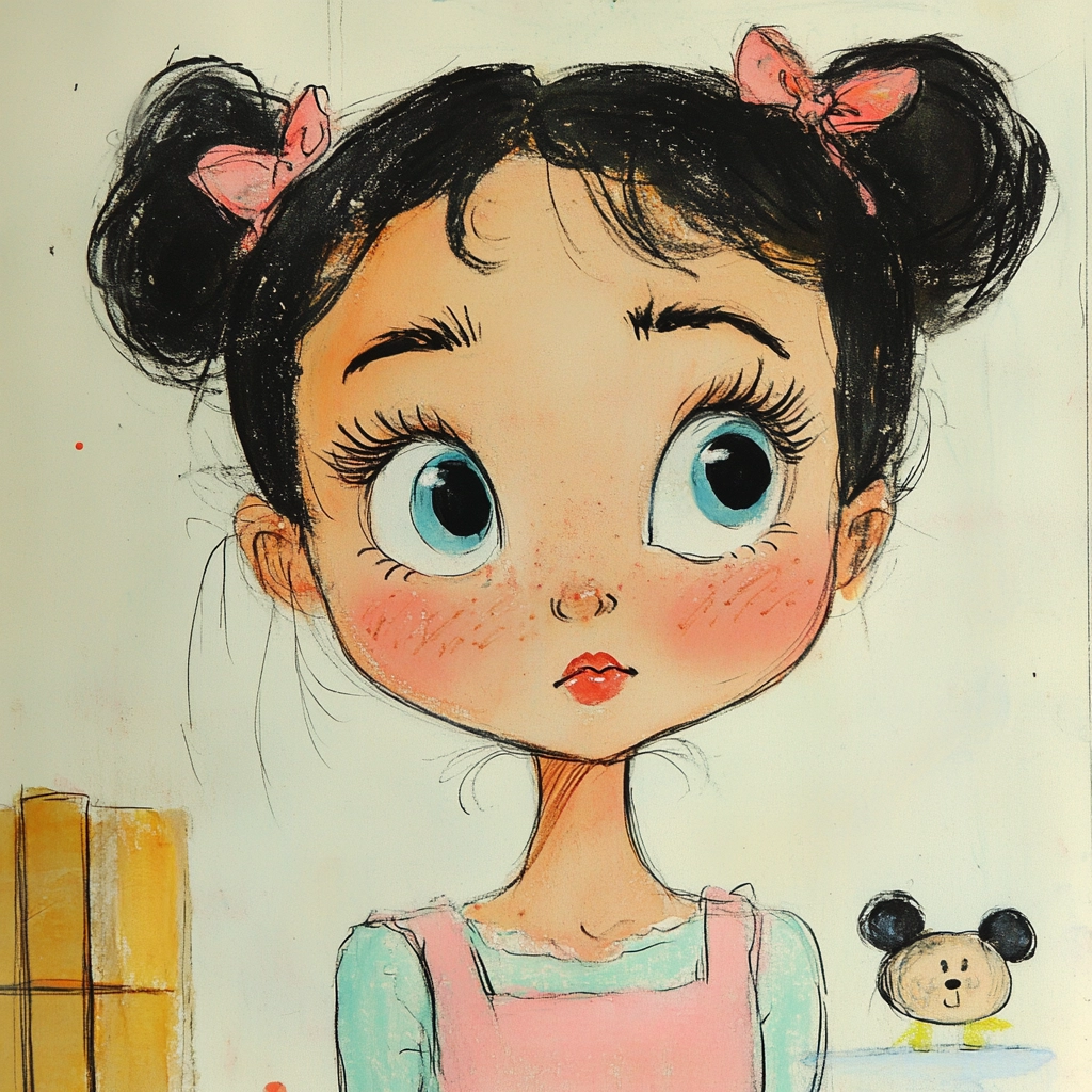 Lighting is diffused, creating a gentle illumination on the subjects. The color palette is soft, with pastel hues conveying simplicity. Texture is smooth, enhancing clarity of the forms.