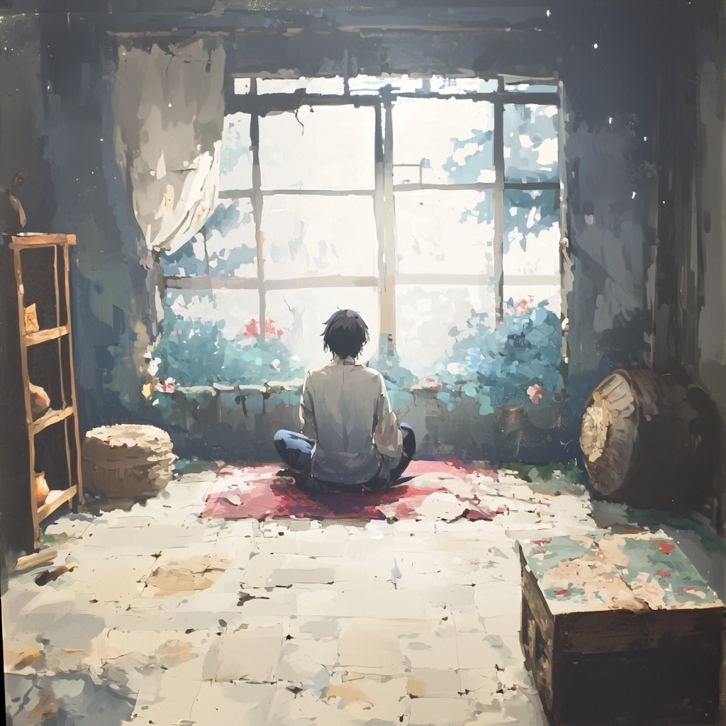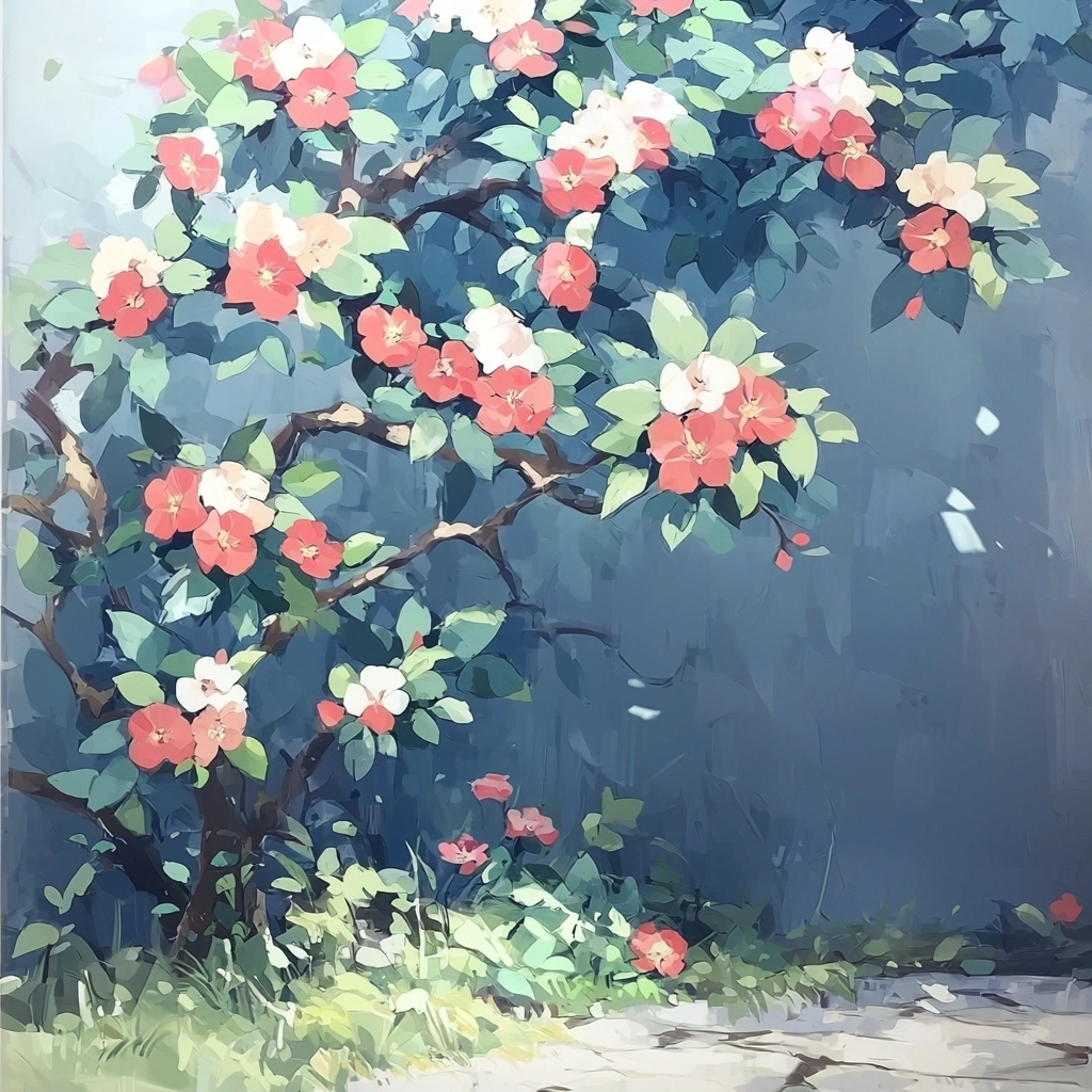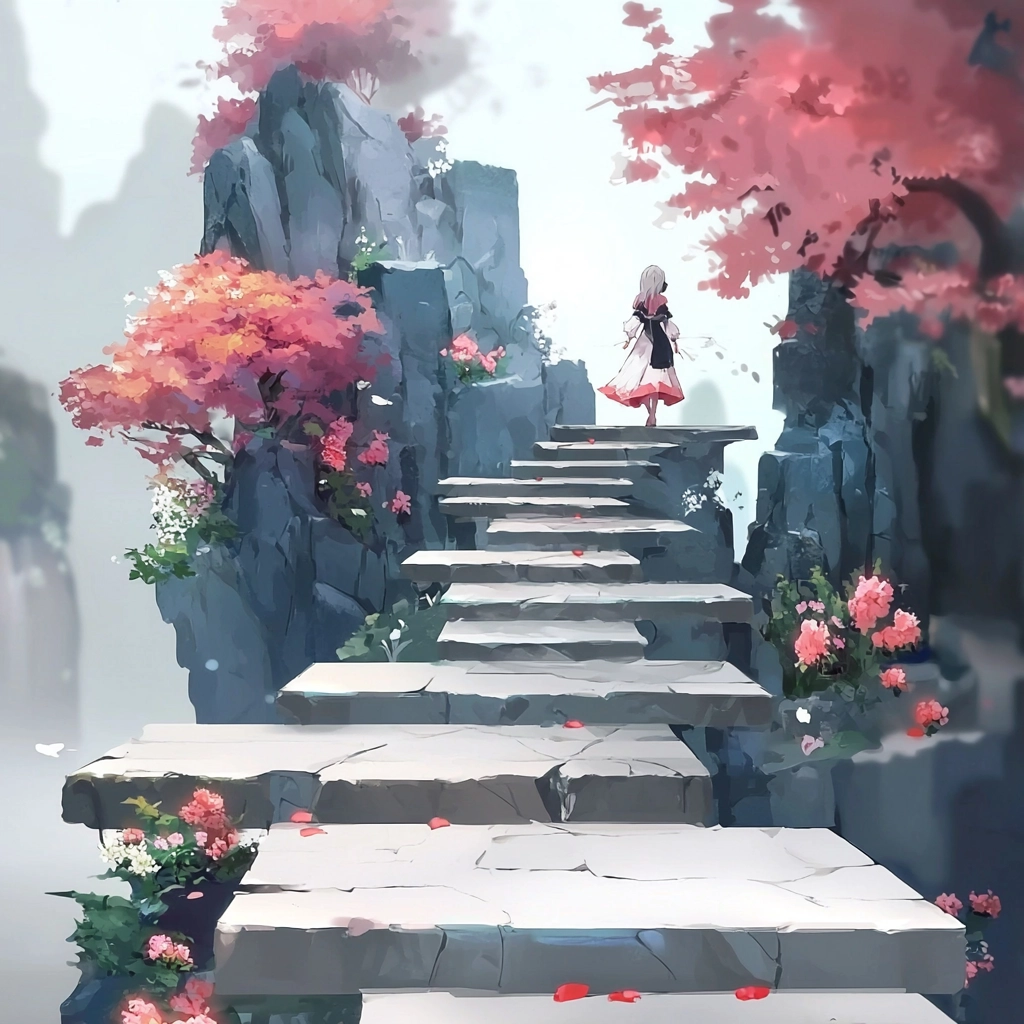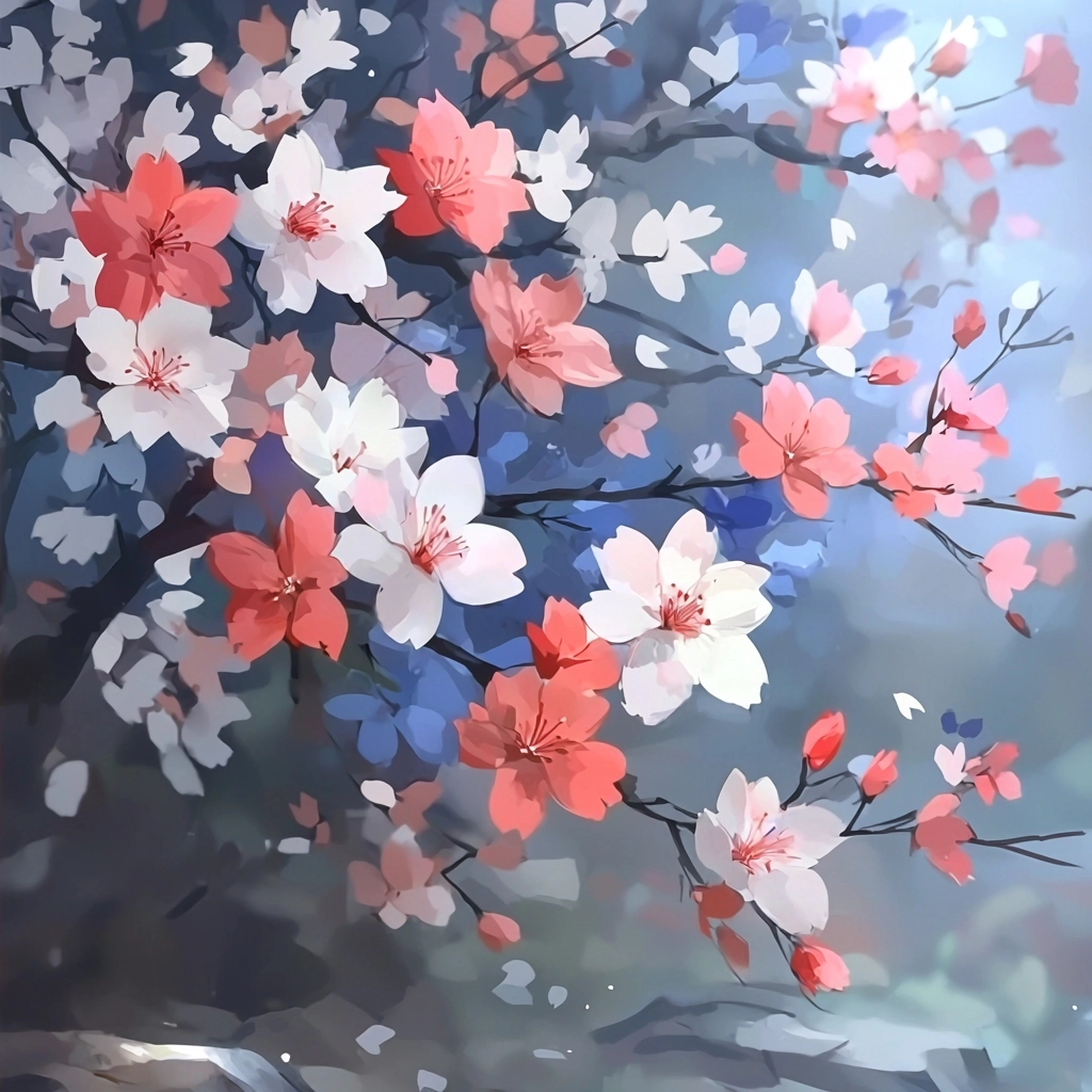 The lighting is diffused, creating a soft glow that envelops the scene. Color characteristics include a pastel palette with prominent use of red, blue, and white. Spatial sense is enhanced by the gradation of colors and the gentle shading that suggests depth. Texture is smooth with subtle variations, contributing to a cohesive and immersive visual experience.