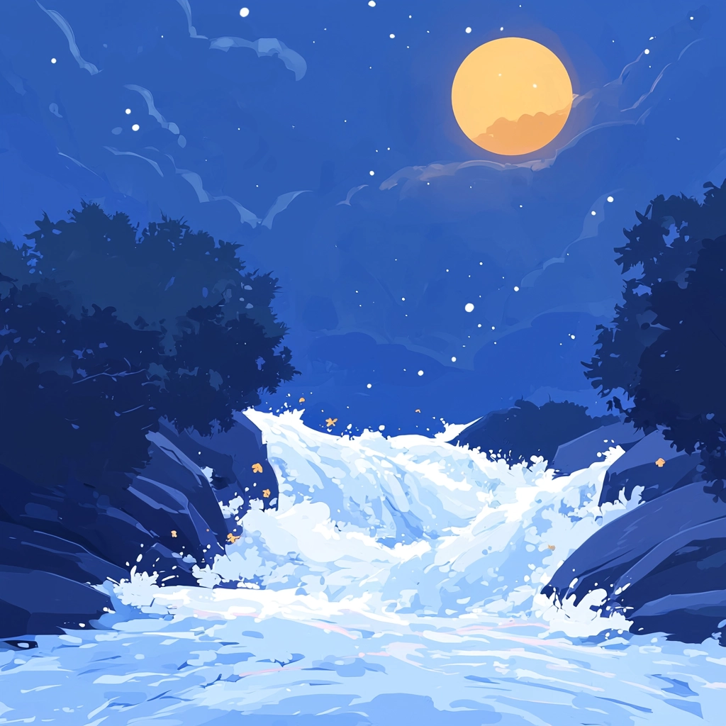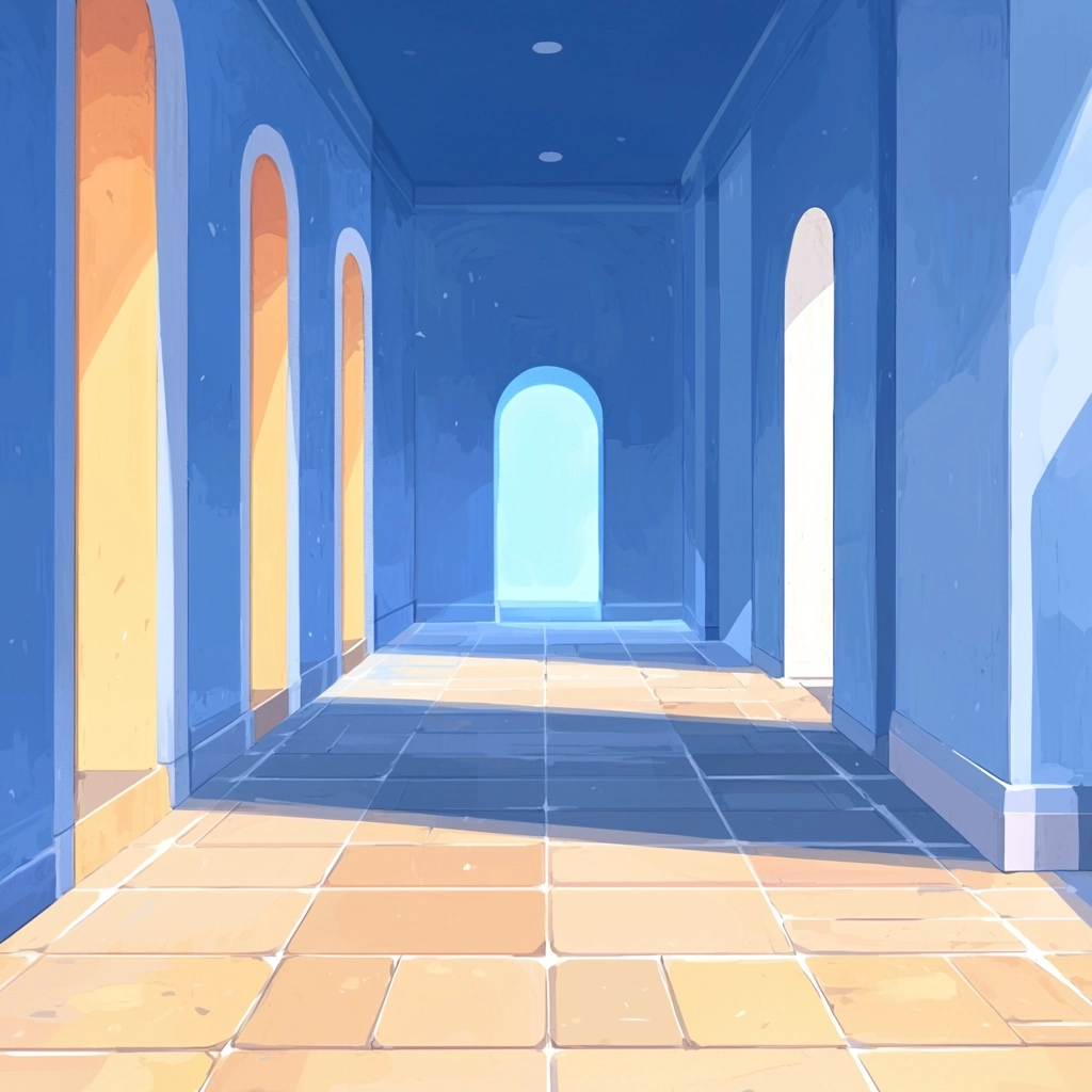 The lighting effects highlight the pastel quality, creating gentle contrasts between the soft luminosity and sharper shapes. Cool blues and warm oranges intermix, generating a harmonious balance. The spatial arrangement emphasizes the depth in open and enclosed areas.