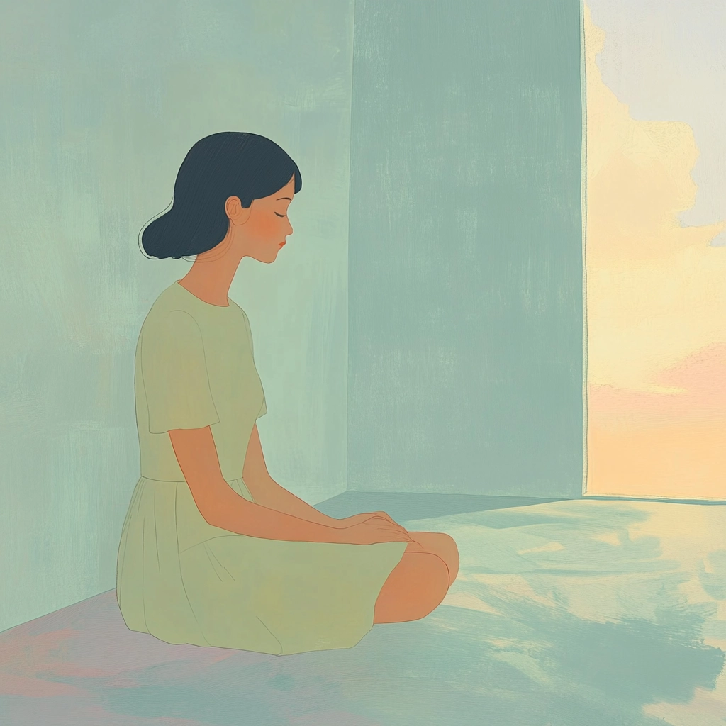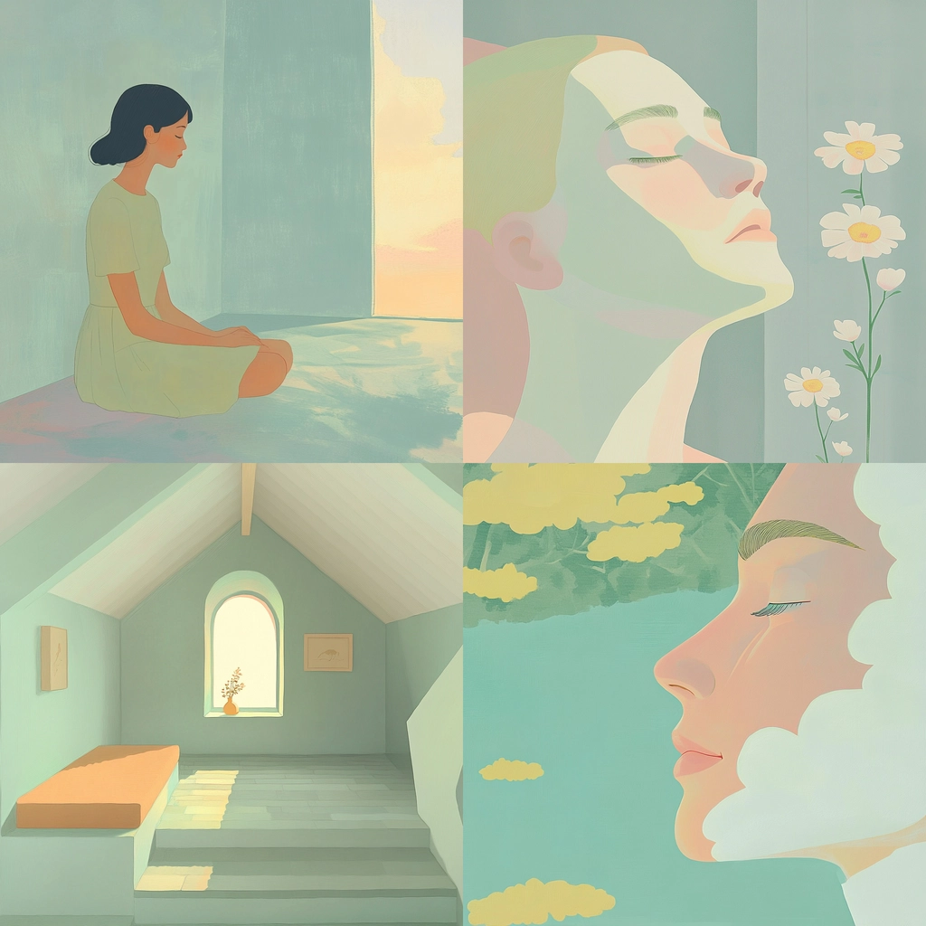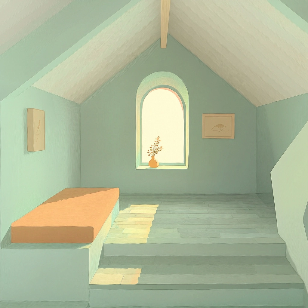 The artwork employs subdued lighting to enhance soft, muted pastel tones with minimal shadow. The spatial composition is simplistic and balanced, providing a gentle sense of depth. Surfaces appear smooth, contributing to the overall minimalistic and relaxing aesthetic.