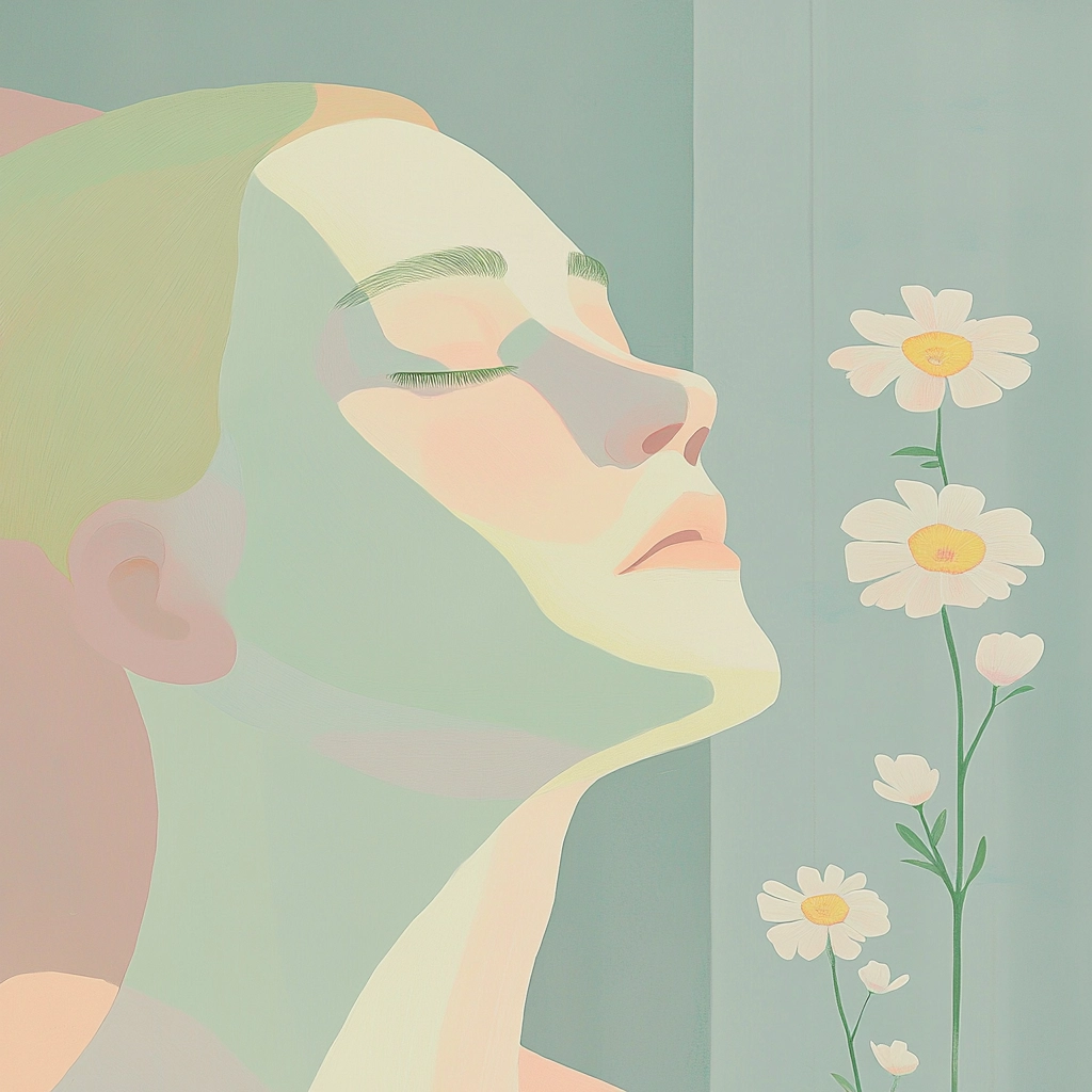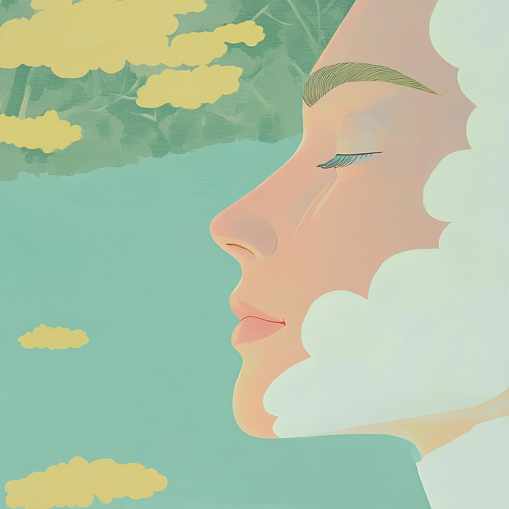 The composition uses calming pastels with uncluttered, smooth surfaces for a tranquil feel.