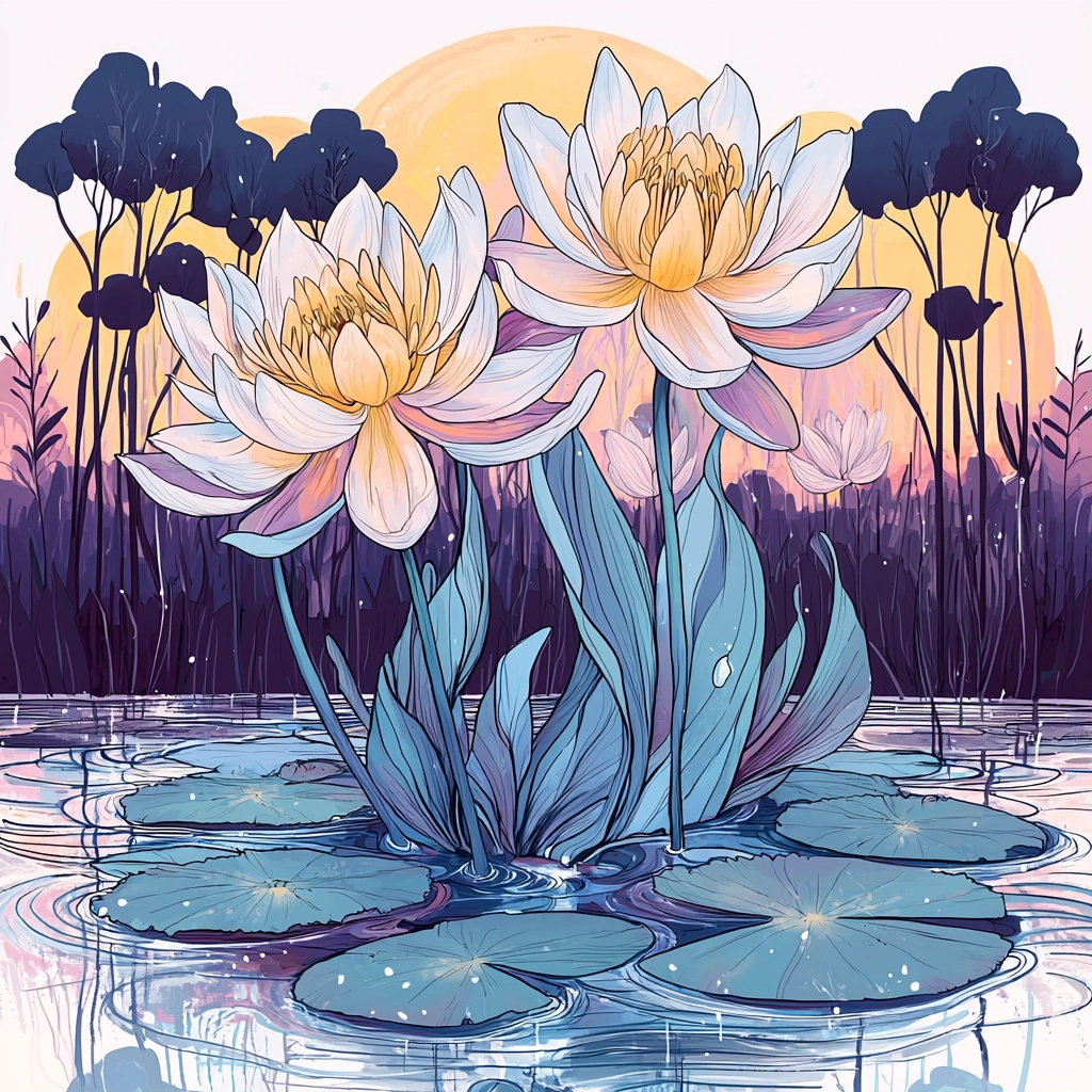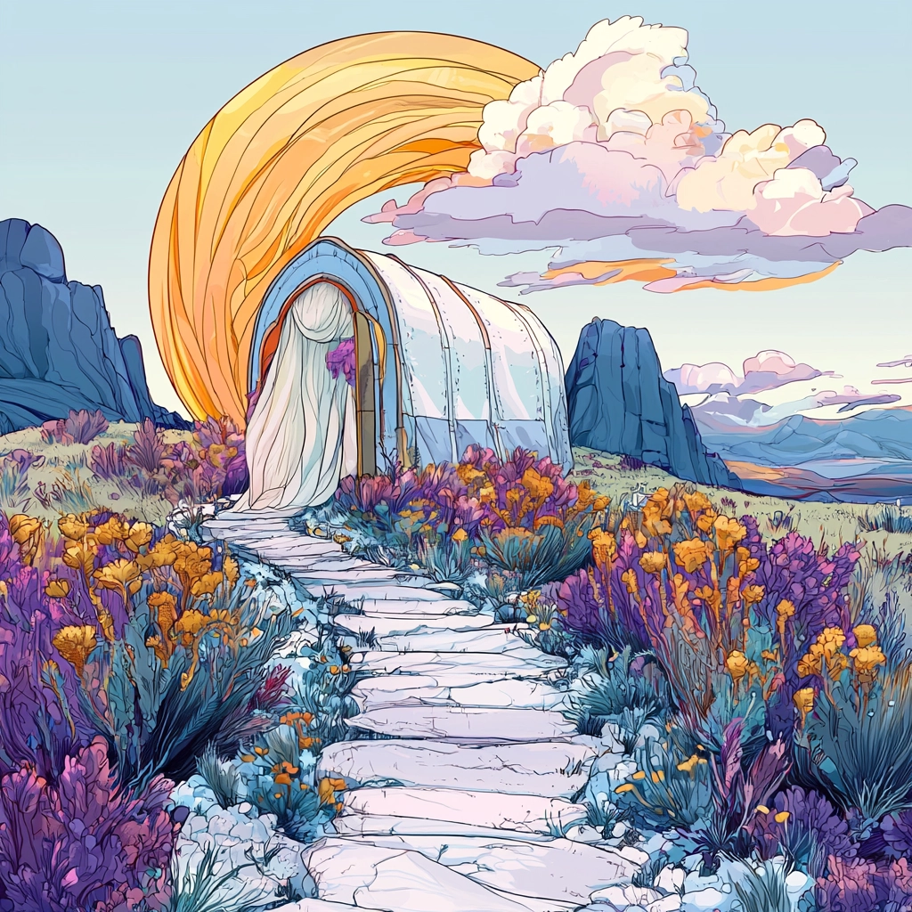 The use of soft lighting enhances the pastel color palette, creating a sense of gentle movement and fluidity. The smooth textures are punctuated by detailed strokes that define forms, while spatial arrangements guide the eye across vibrant gradients and streams.