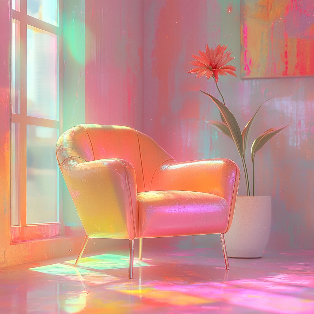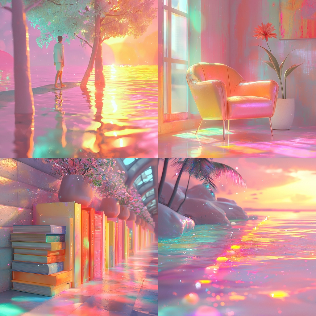 The lighting produces soft reflections and gradients, with colors blending smoothly into one another, enhancing a surreal depth. The textures are subtle, highlighting gentle transitions and smooth surfaces, casting diffused light throughout.