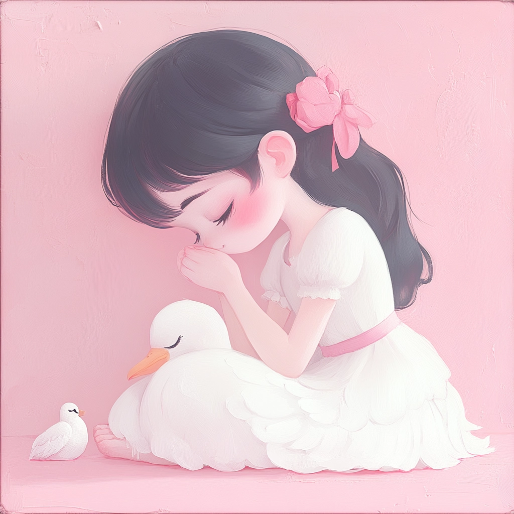 The soft lighting enhances a tender ambiance, with pastel pink and white creating a soothing palette. The smooth textures emphasize simplicity, and subtle shading adds depth and dimension.