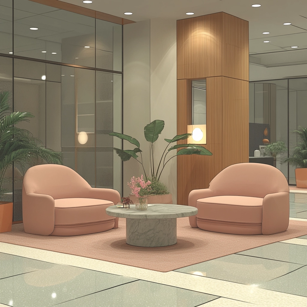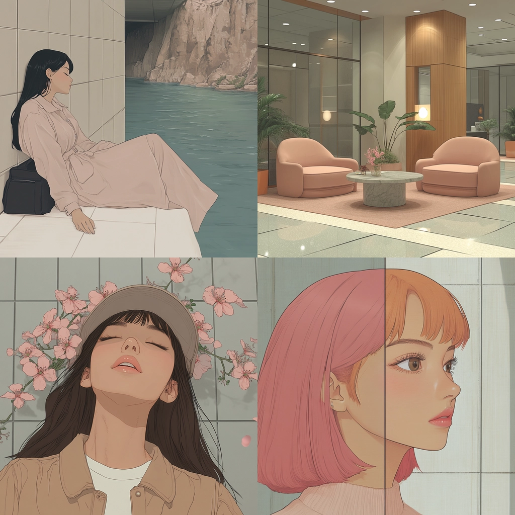 The lighting is diffuse and gentle, avoiding harsh shadows and bright highlights. Colors are subtle, primarily in soft pastels that convey a soothing ambiance. Spatial sense is open and uncluttered, providing a harmonious balance. The textures are smooth and refined, enhancing the simplicity and elegance of the scenes without complexity.