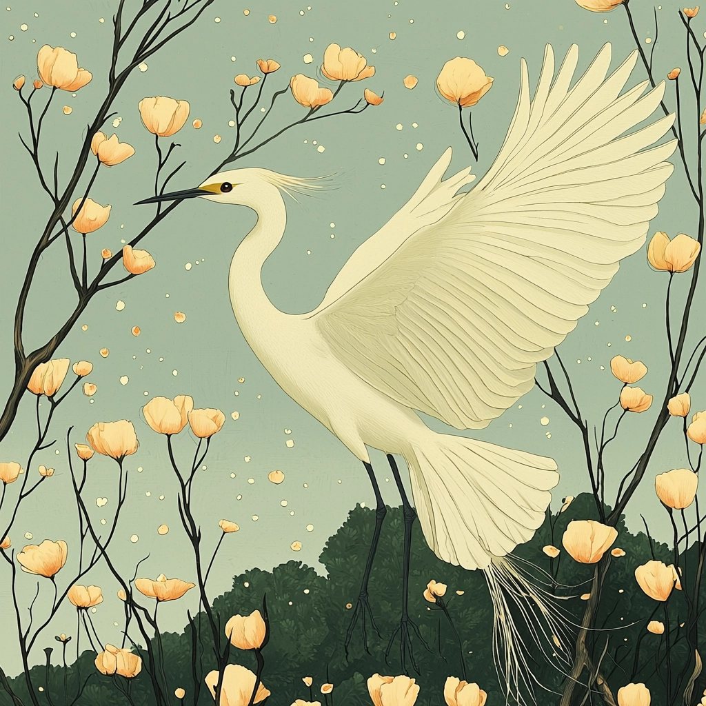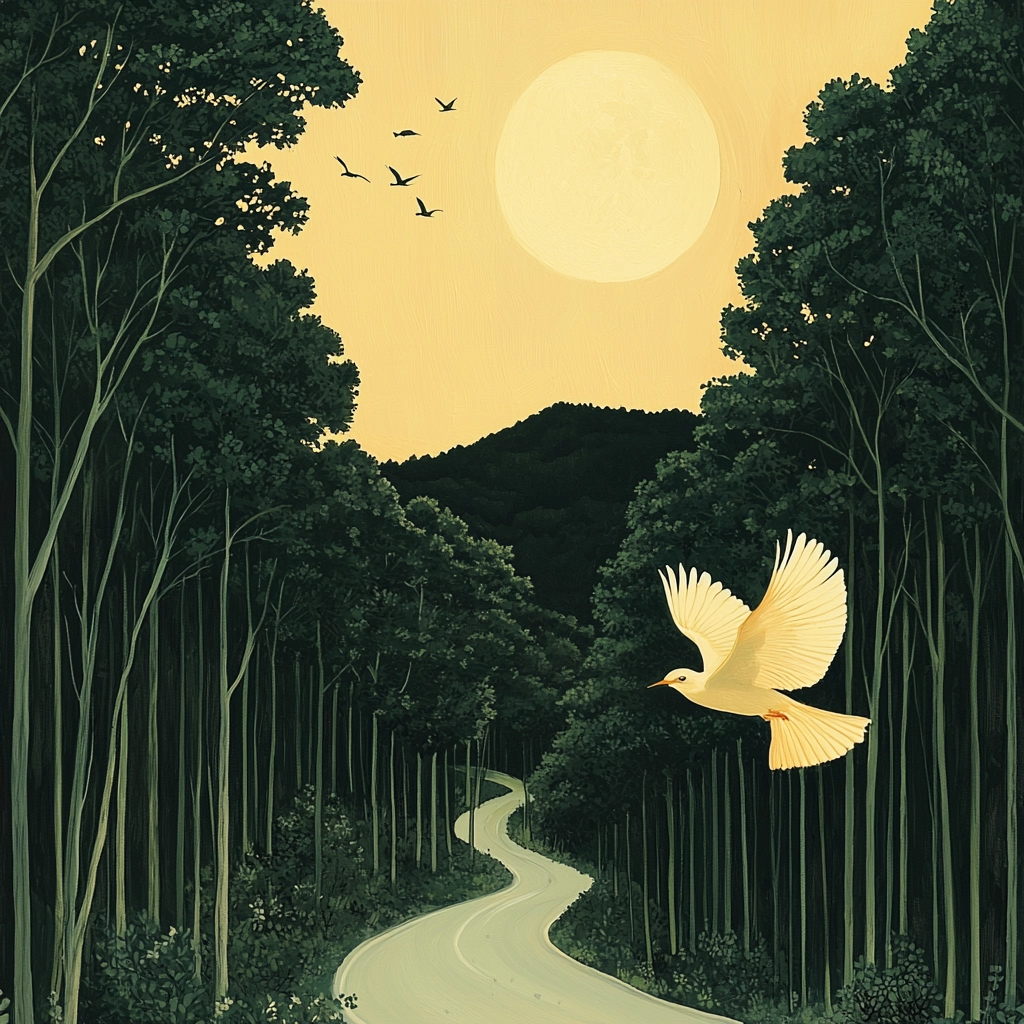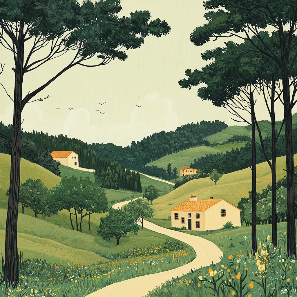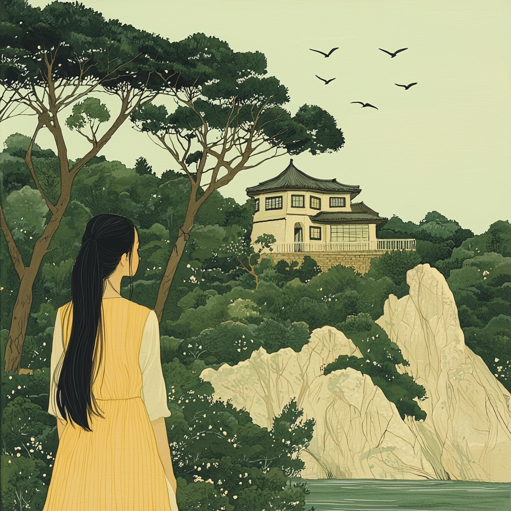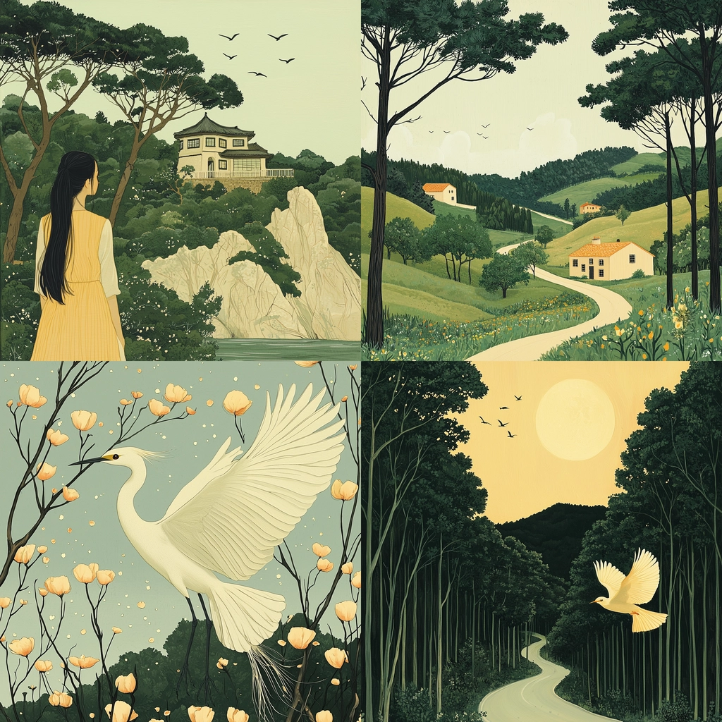 The interplay of light and shadow enhances depth, with soft contrasts and subtle gradients forming a gentle spatial awareness. Textures are smooth yet diverse, highlighting intricate details in the natural surroundings with a refined color palette.