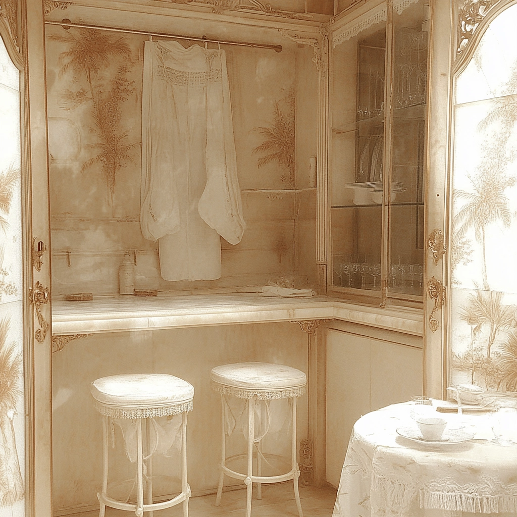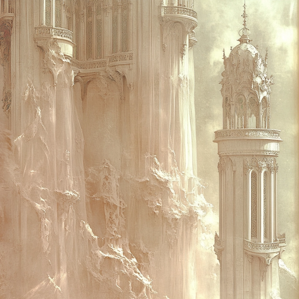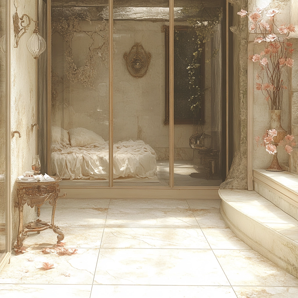 Delicate lighting enhances pale sepia tones creating gentle, reflective surfaces. The textures depict smooth stone and soft fabric, with spaces defined by light-depth contrasts, giving a sense of soothing tranquility amidst understated opulence.