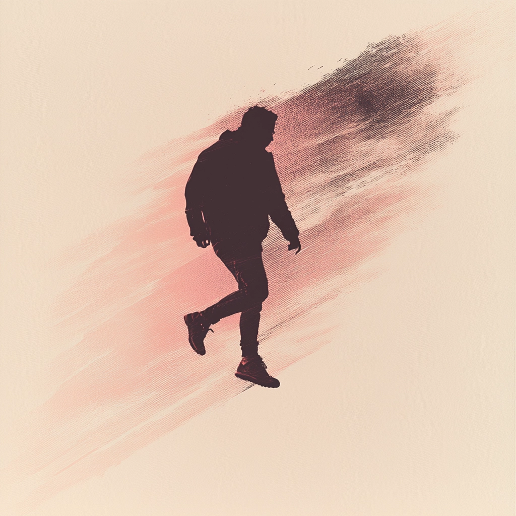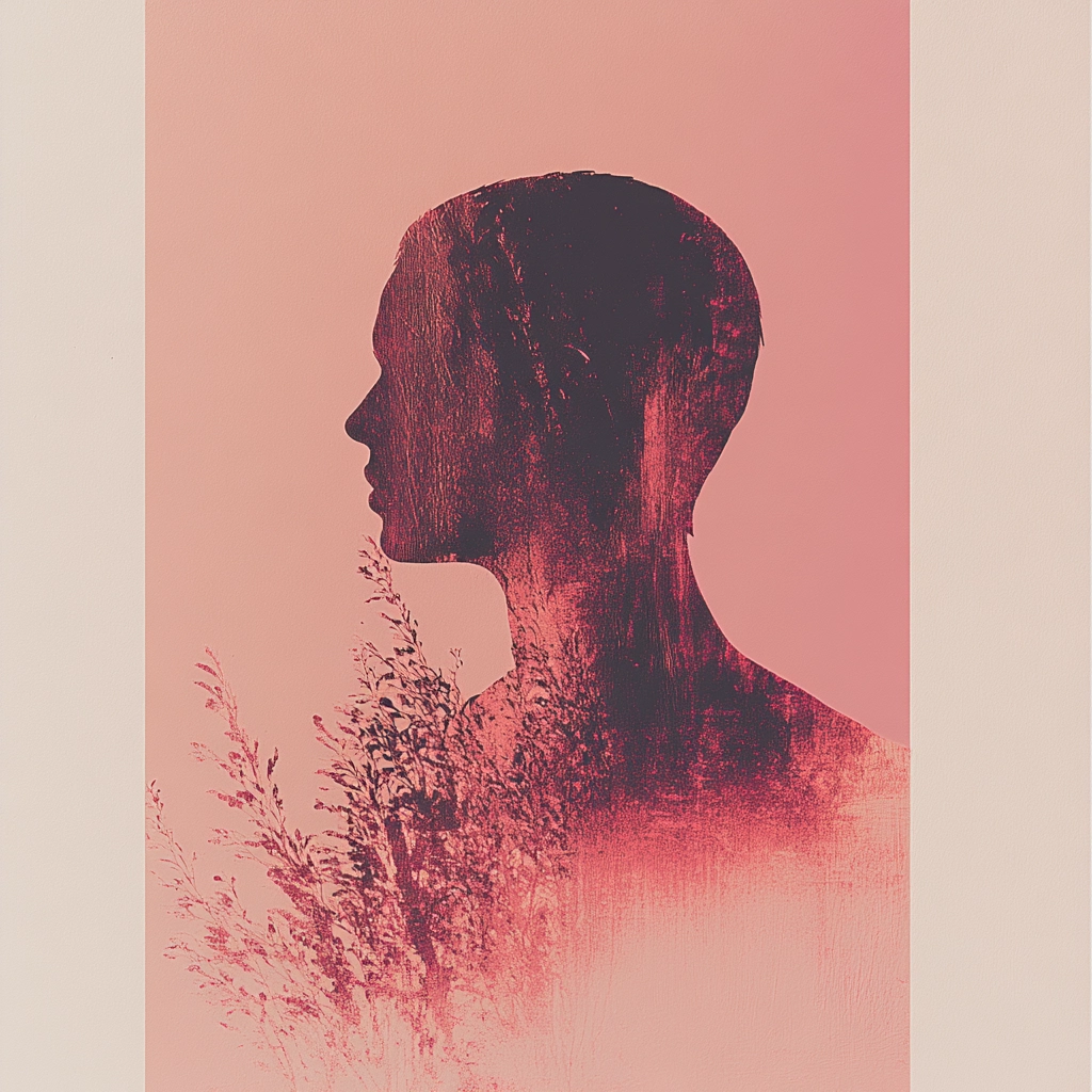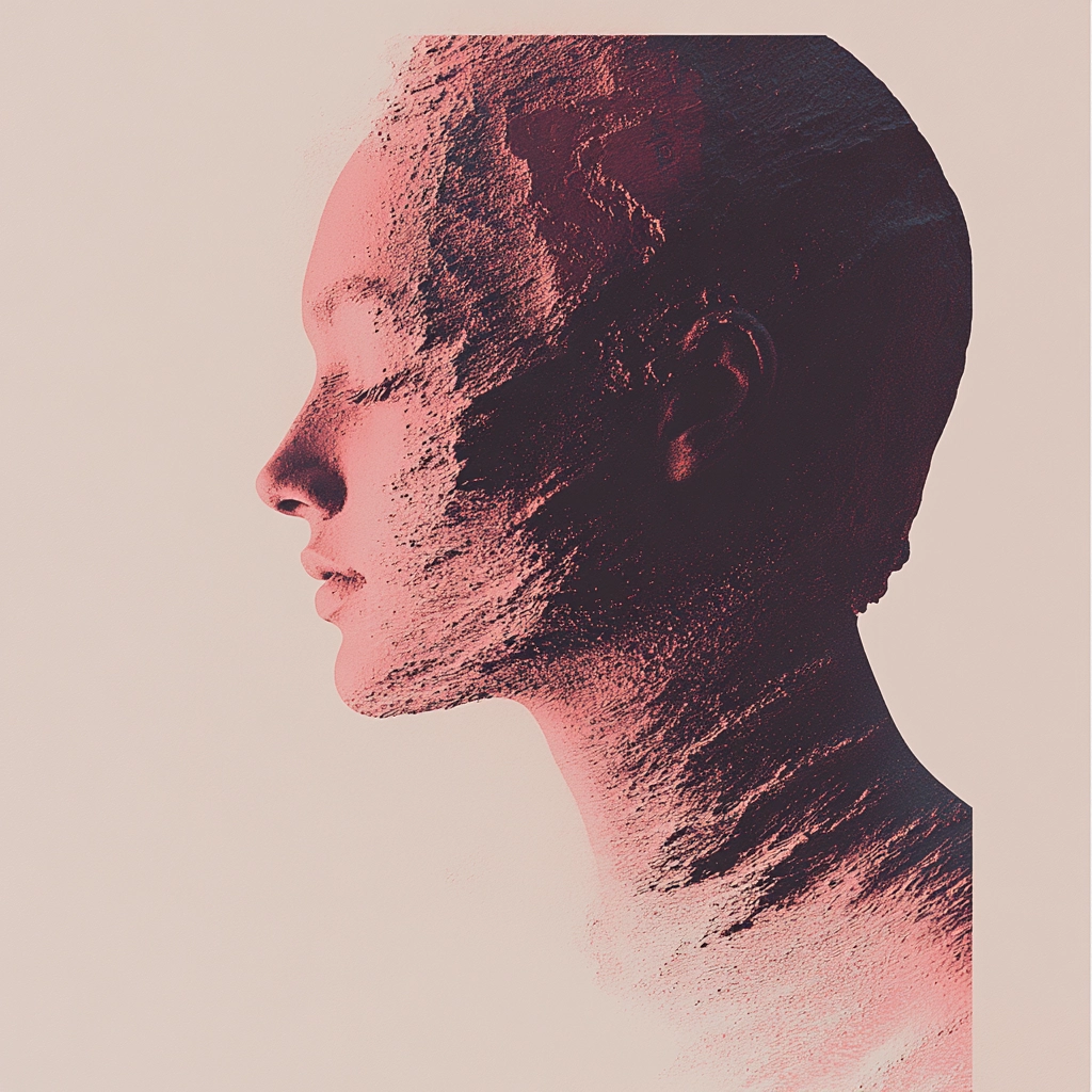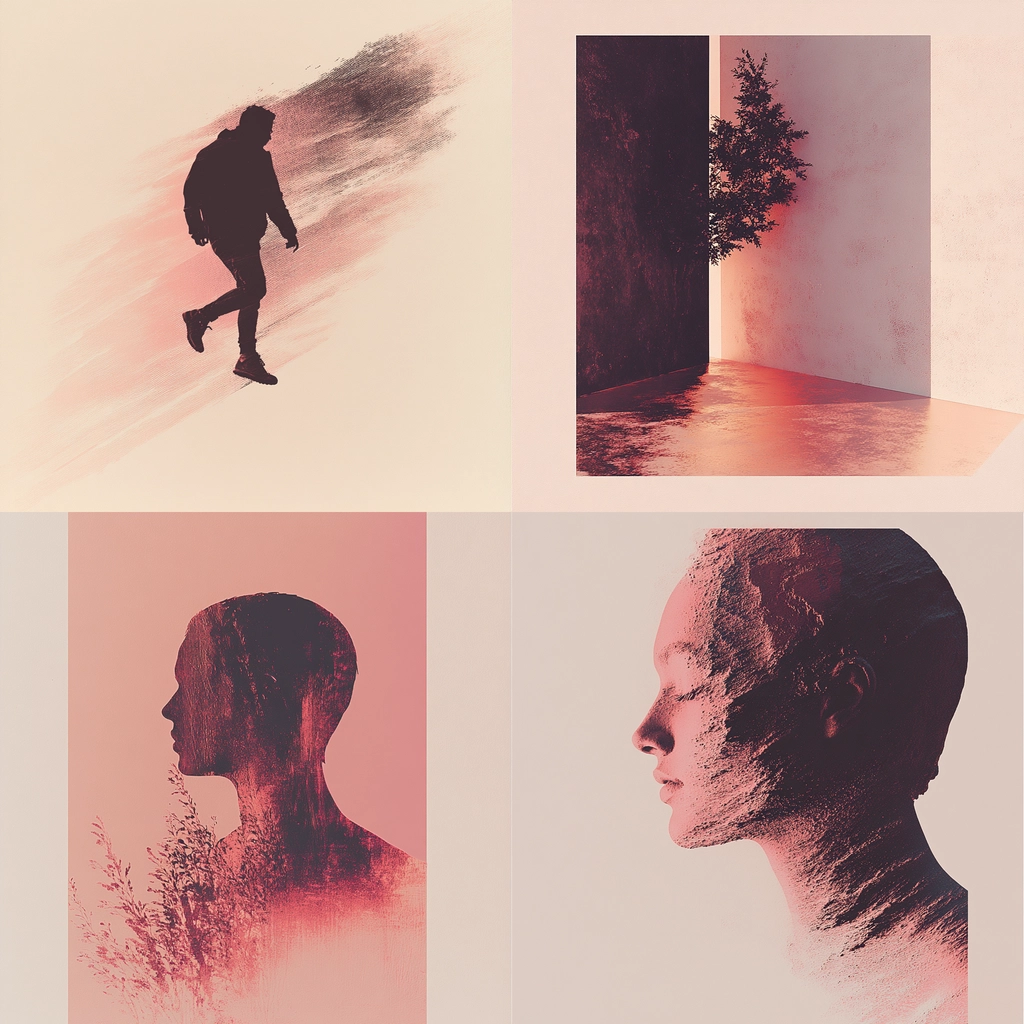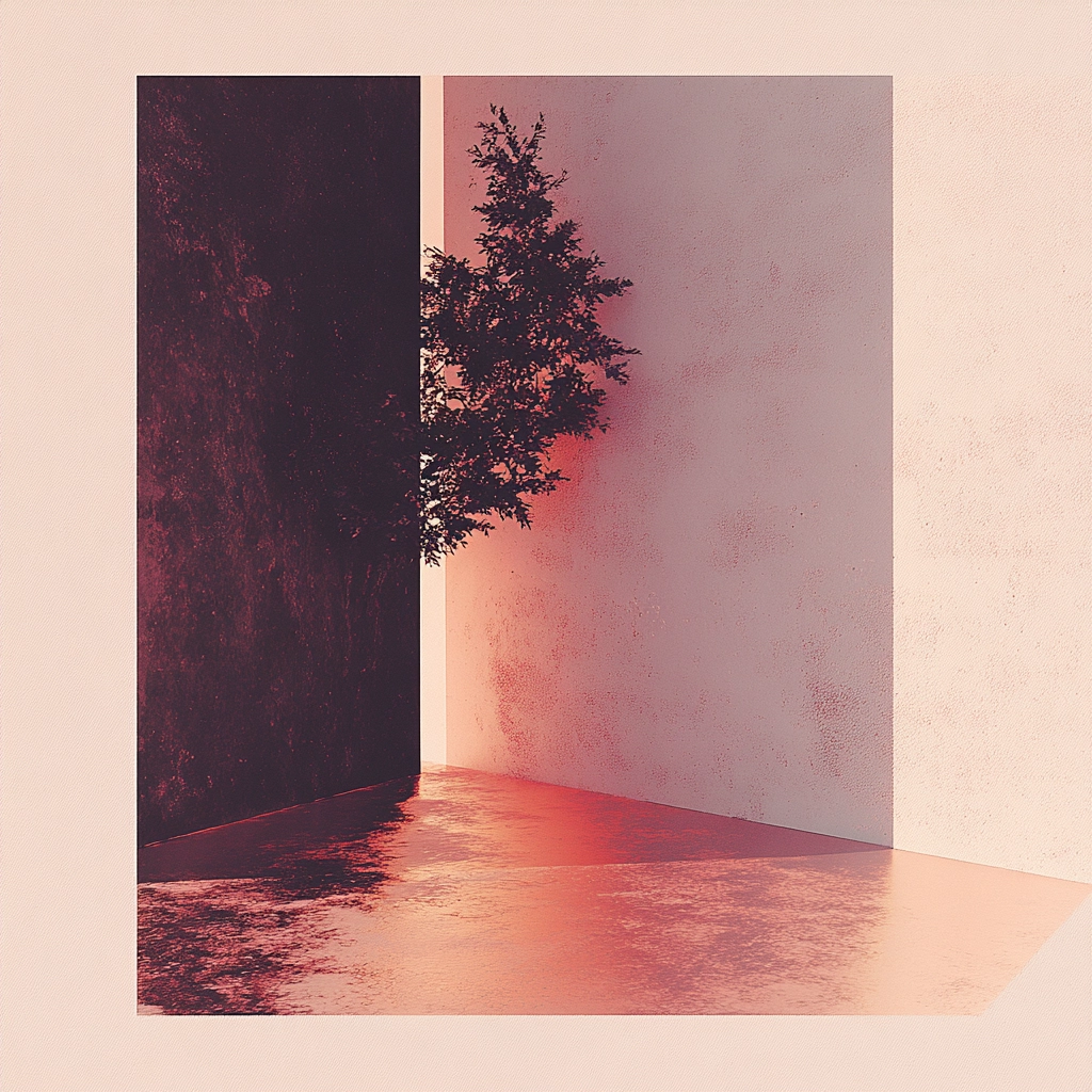Blending soft textures with a distinct red hue, reinforced by gray and white tones throughout the composition.
